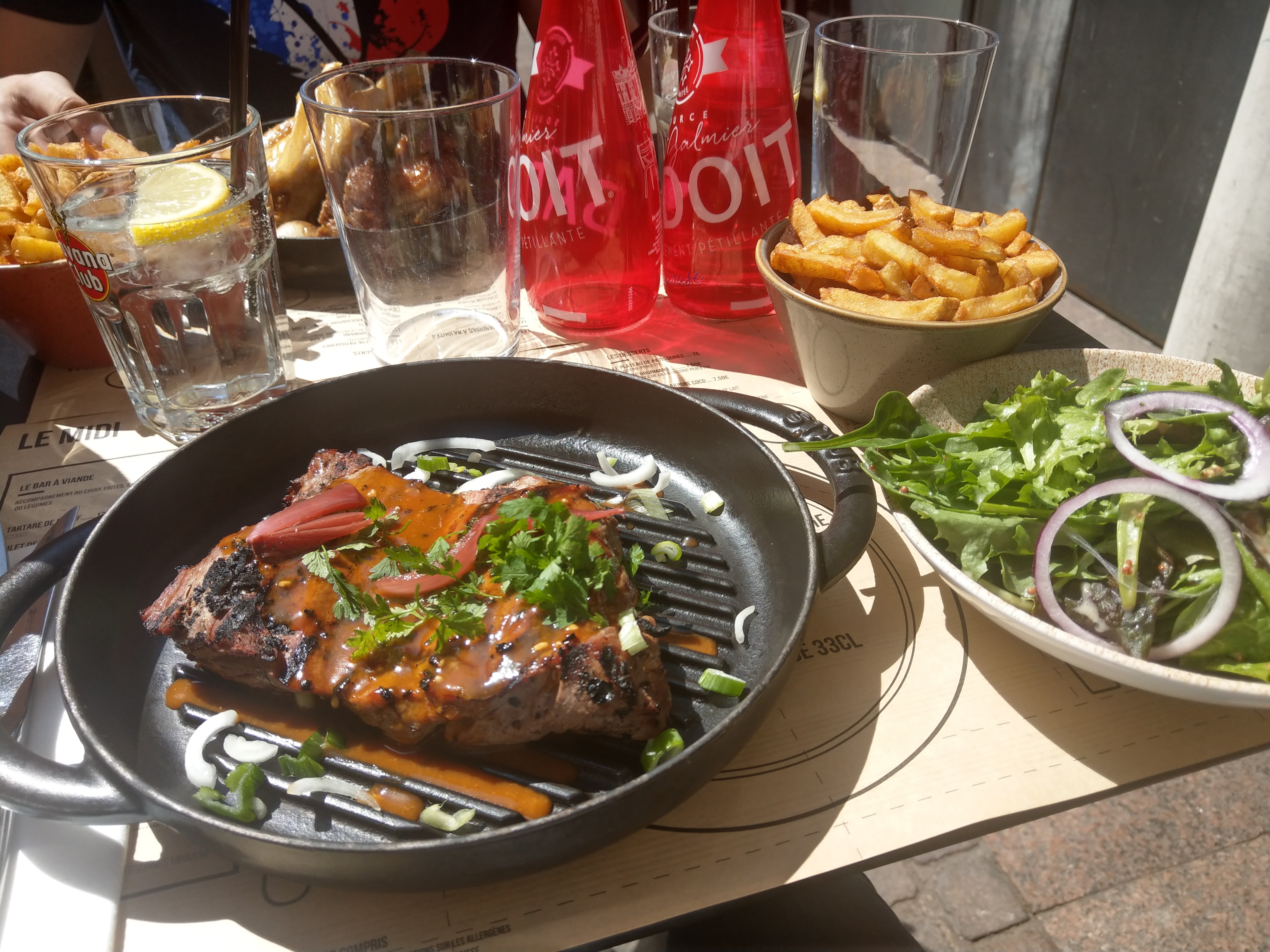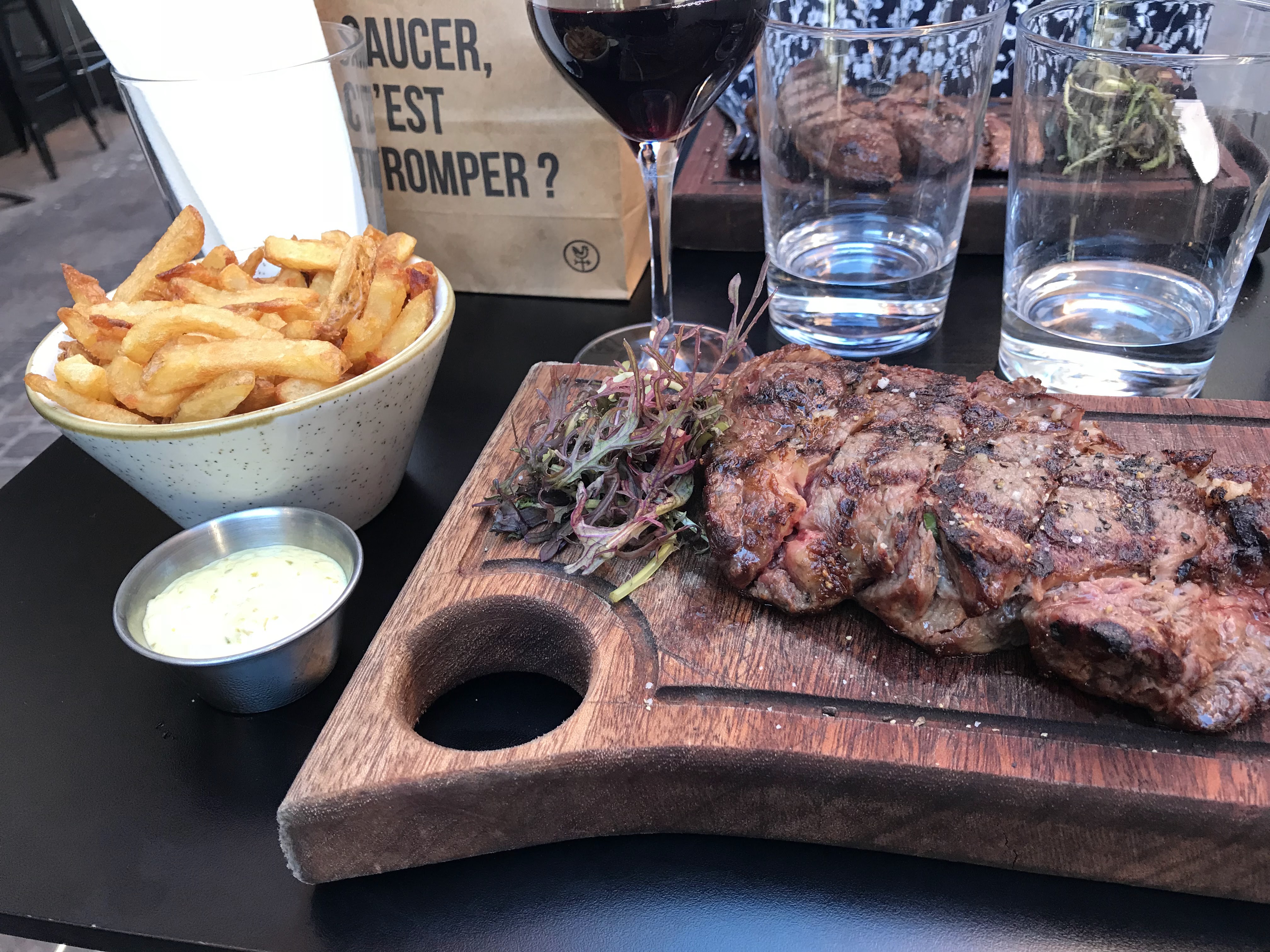 Je suis arrivée sans réservation on a été placées sur une table face à la route sur des tabourets super hauts donc n’hésitez pas à réserver avant de venir si vous préférez une table plus basse. Les serveurs sont aimables et à l’écoute. L’entrecôte était très bonne, juste dommage qu’ils ne proposent pas de sauce poivre ou autre, et l’accompagnement est à part. 6€ pour des frites dures et pleines d’huile c’est un peu too much mais nous avons quand même passé un bon moment.