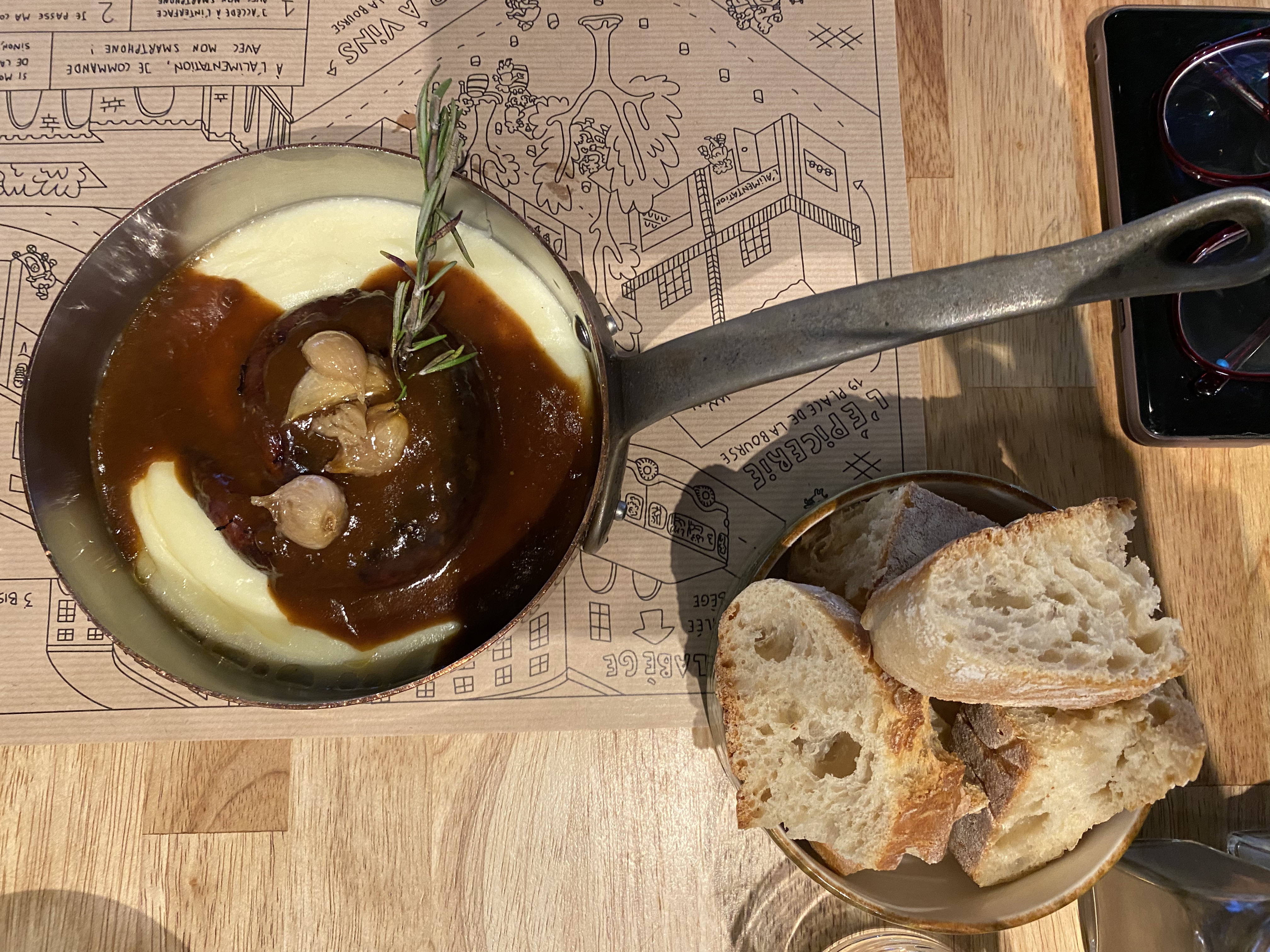 J’ai pris un aligot avec une saucisse et c’était assez décevant, surtout l’aligot en lui-même, ça manquait terriblement de goût, ajouter plus de beurre ou utiliser un fromage autre que l’emmental ou le gruyère (style comté) aurait peut-être été une meilleure solution.
