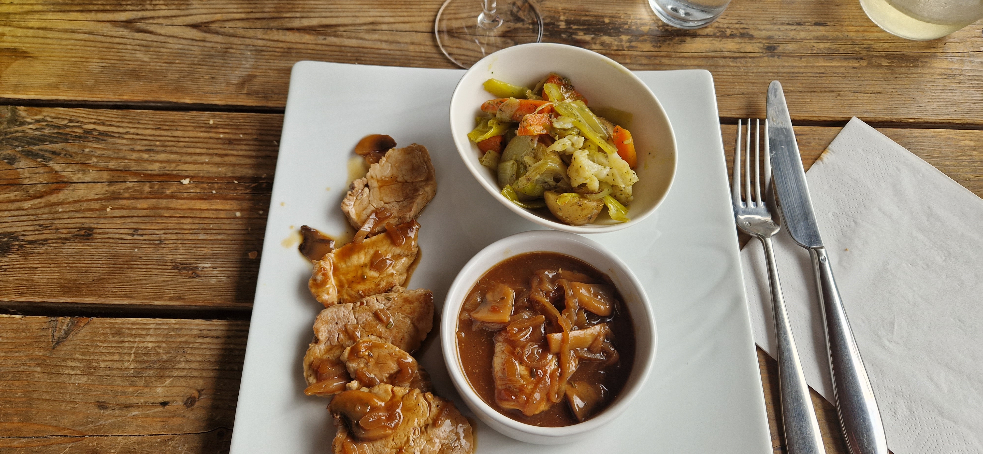 Un menu du jour à 21 euros à midi …. Plus de côtes d’agneau hélas …. On a vu passer les dernières … quel fumet …Le cuistot nous a improvisé un sauté de porc marchand de vin ….magnifique … un service extra et des plus sympas…même le chien a eu droit à une eau fraîche … a recommander !!!