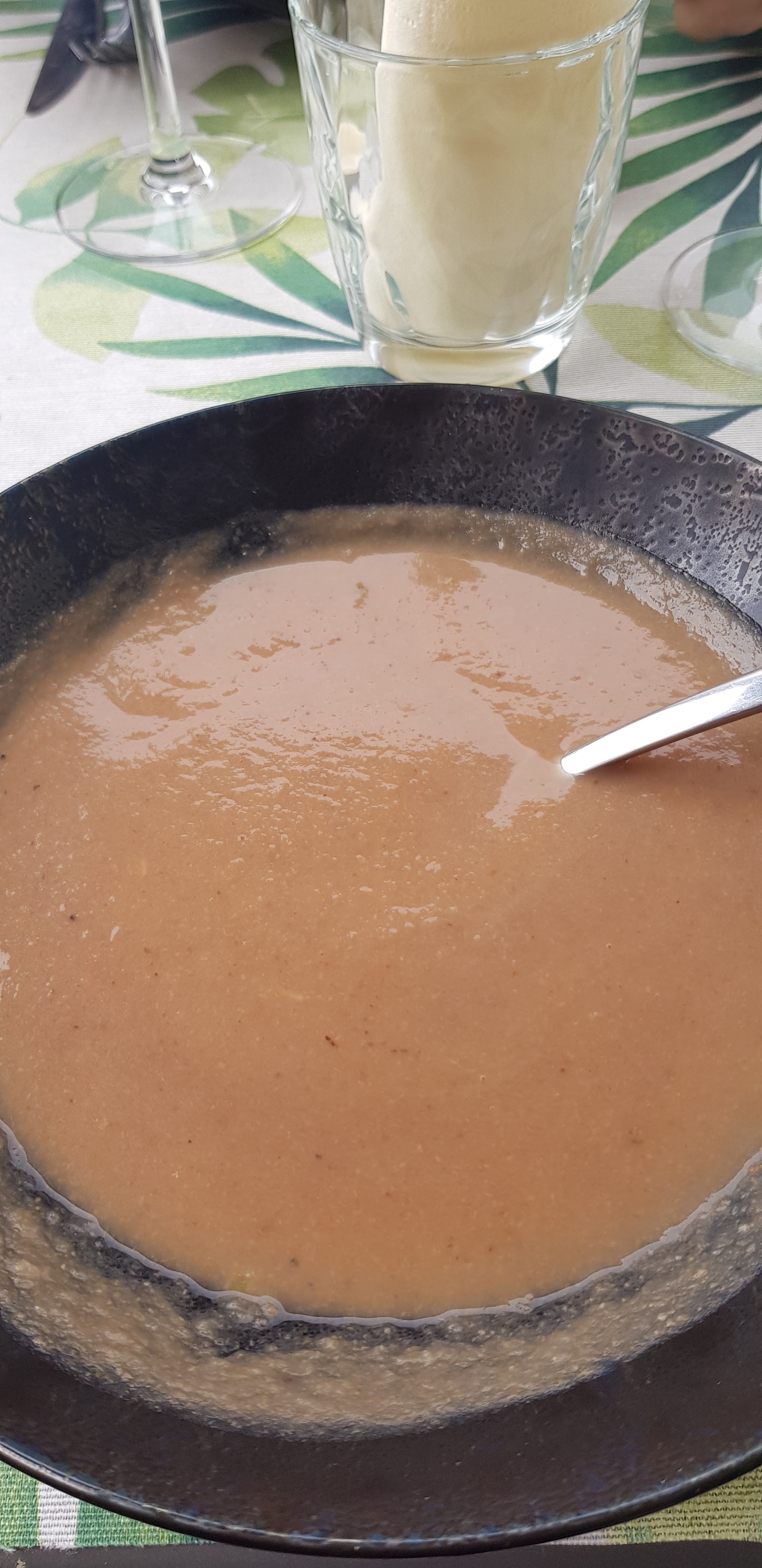 Nous avons bien était reçu et surtout bien mangé. Et surtout très original ce potage offert en début de repas. J'ai mangé une terrine de porc fermier en entrée Après une excellente tête de veau avec des légumes que l'on a pas l'habitude de manger ( navet celeri fenouil). En dessert tiramisu au café. De bon produits frais. Et un service impeccable et sympathique. Je vous le conseille