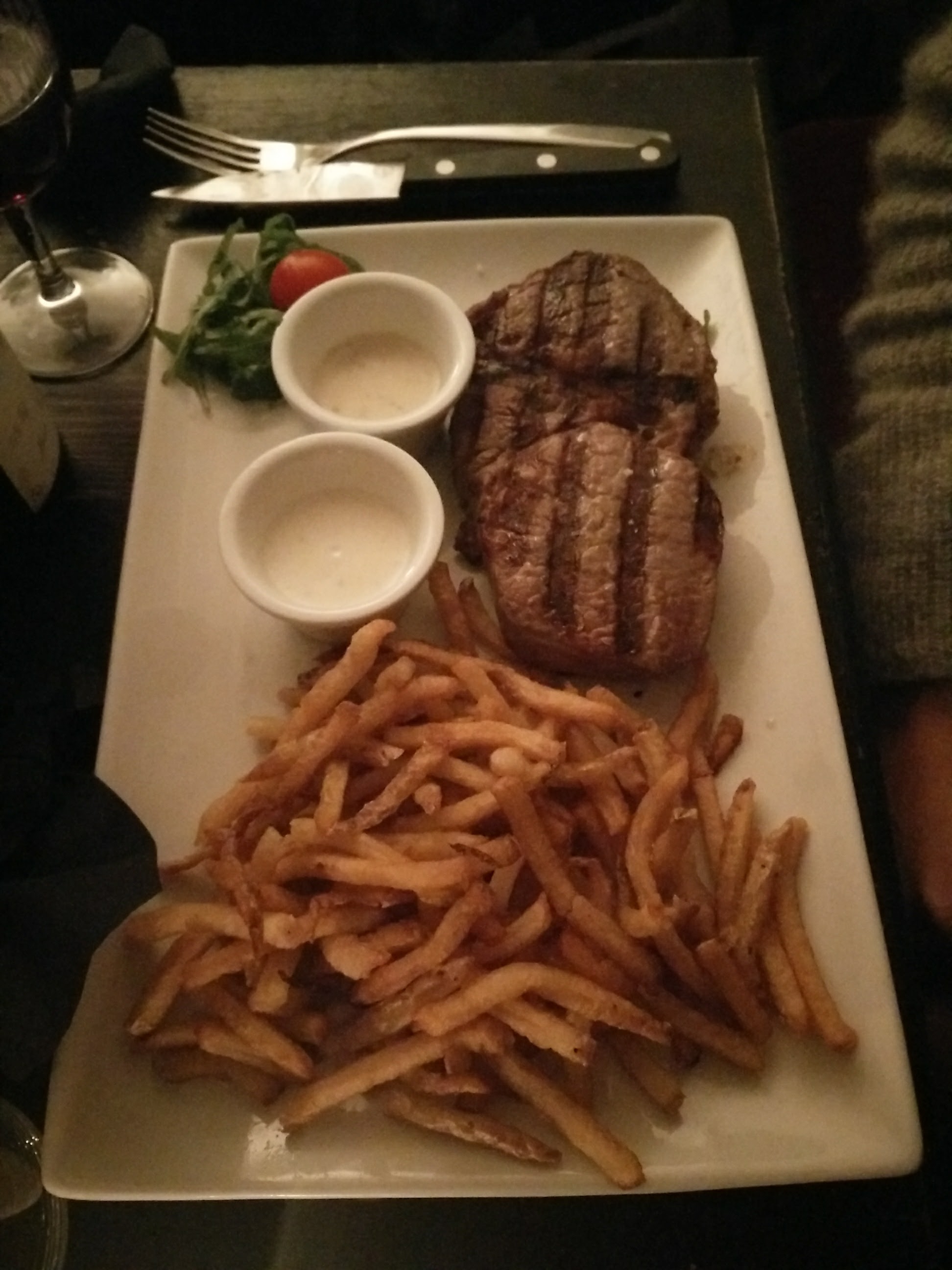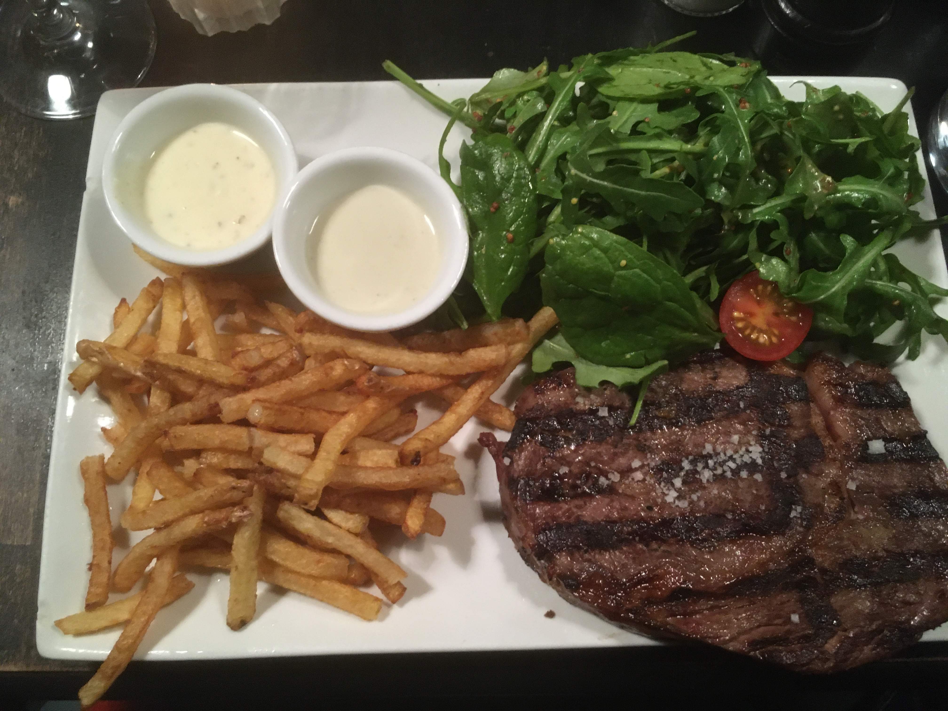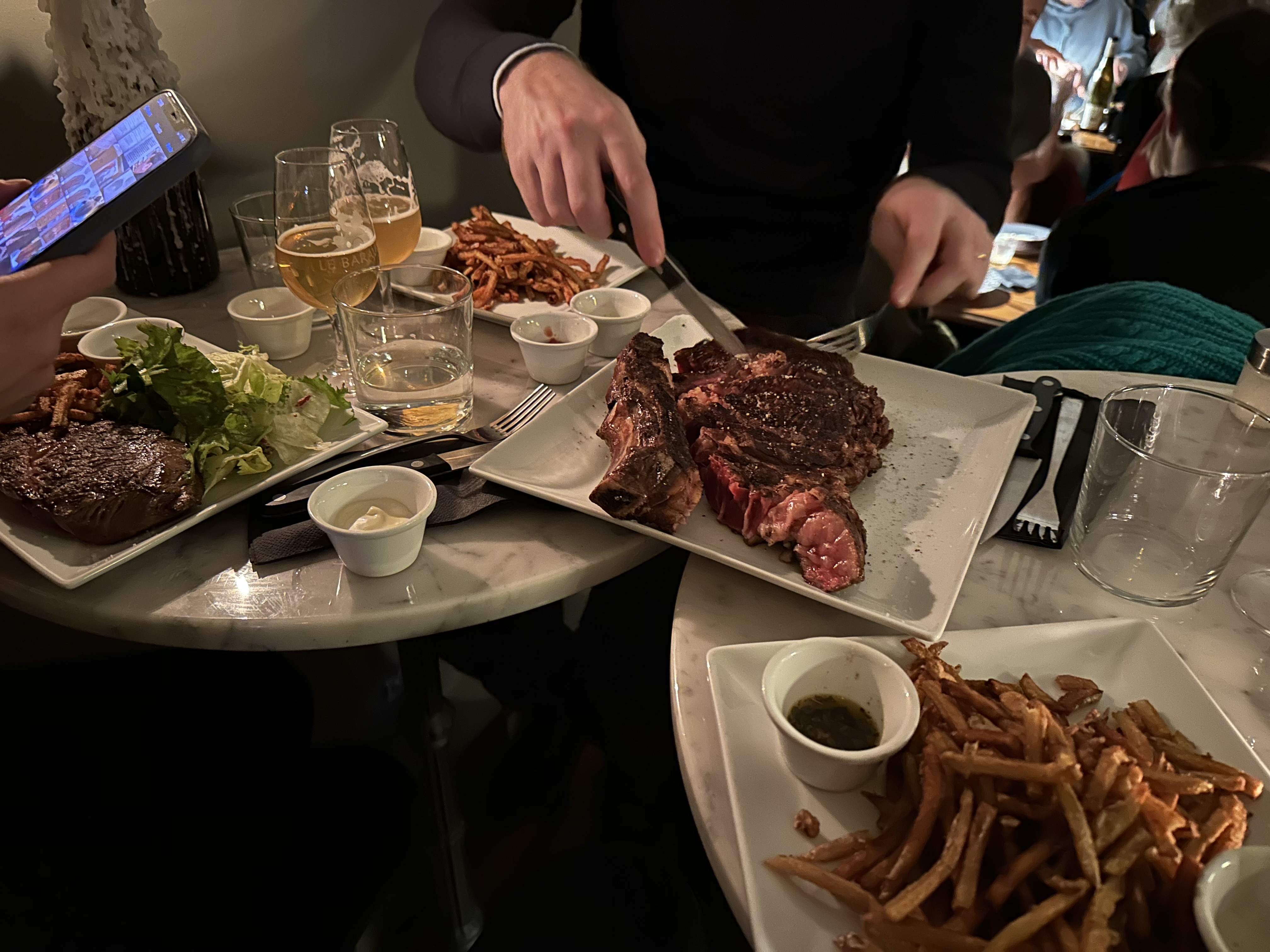 - Service exécrable. La serveuse blonde était mal aimable, c’était borderline. - Assis sur des tabourets en hauteur à côté de la porte d’entrée pour manger une cote de bœuf, mais où va le monde ?! (il n’y a qu’à Paris que l’on peut voir ça). - Viande bien cuite et de bonne qualité, en revanche les portions des condiments étaient clairement adaptés pour des parisiens déconstruits. - Vin : cher et mauvais. Commentaire général: je ne peux que vous conseiller de passer votre chemin, il y a de biens meilleurs restaurants pour amateurs de viandes à Paris.