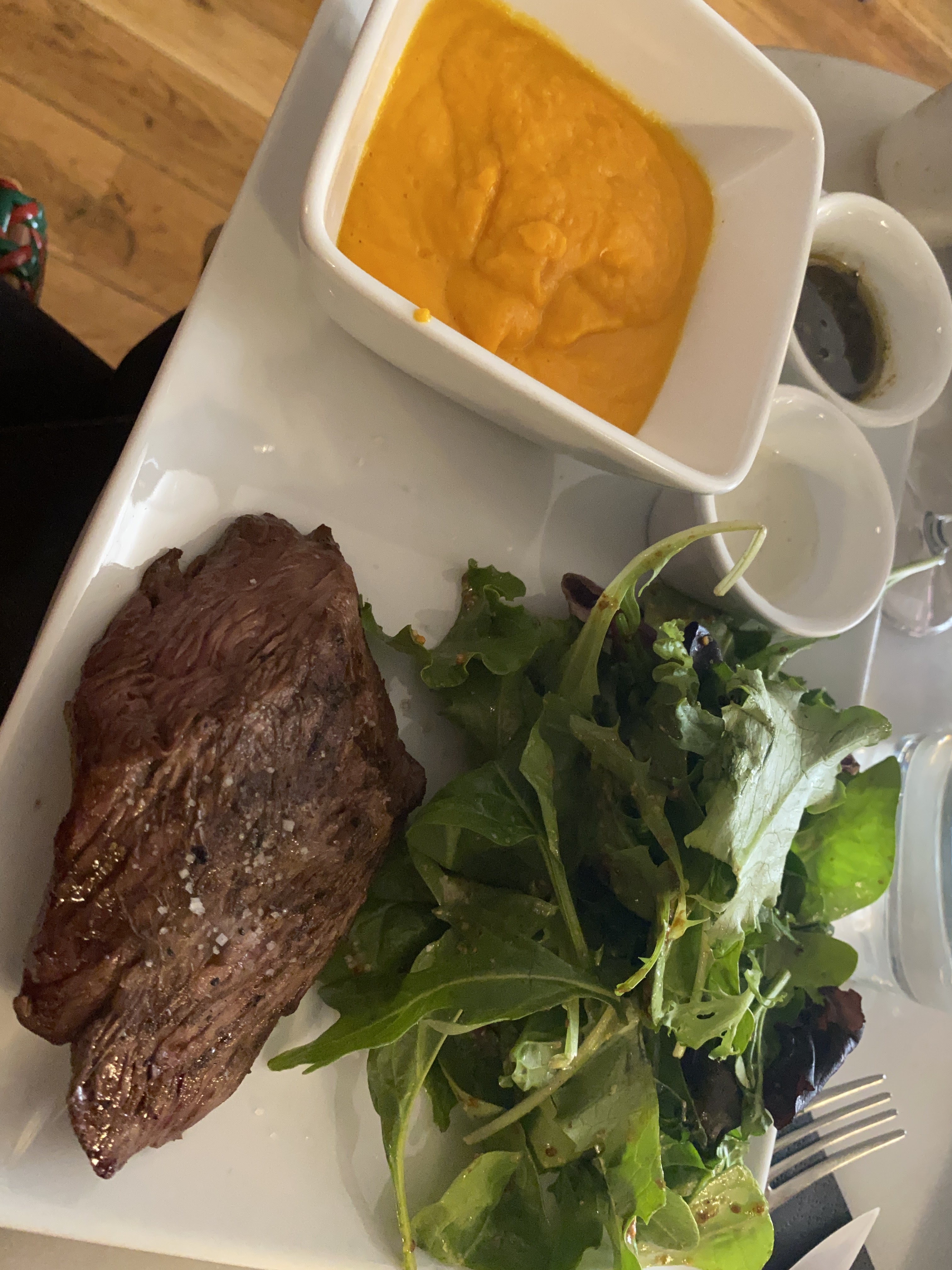 Quel joyau calme et sans chichi. L'onglet (steak suspendu) était tendre et parfait à point. Pour un menu déjeuner soigné à 13,90 €, nous avons eu droit à une boisson et deux accompagnements — salade et purée de patate douce à tomber par terre sur cette photo. Valeur incroyable.