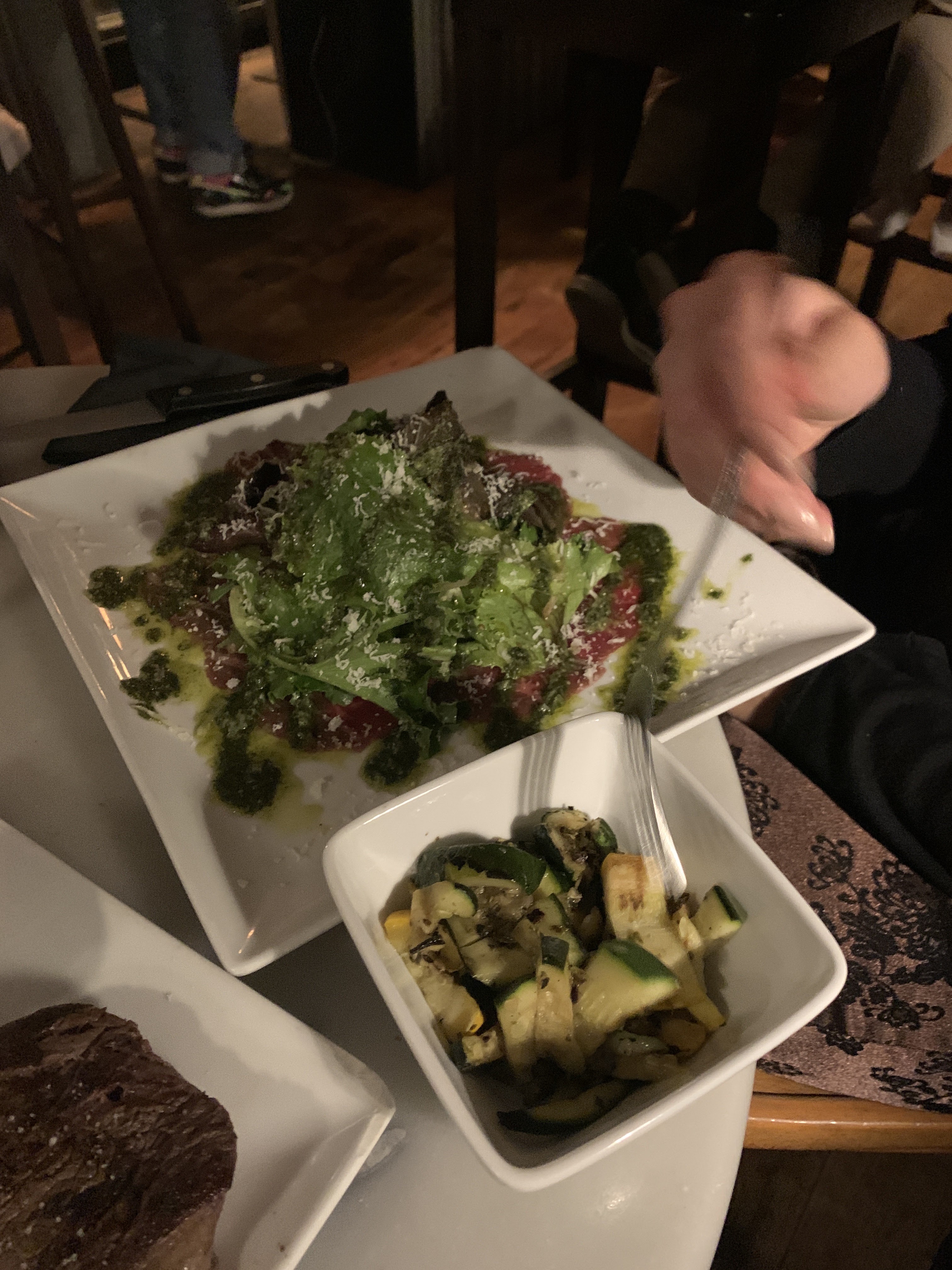 Cela ne m'est jamais arrivé auparavant, ce qui est peut-être un peu surprenant, mais nous avons commandé nos steaks mi-saignants et ils sont sortis rares. Je parle de rouge foncé au milieu jusqu'à quelques millimètres avant le bord de la coupe. Nous avons demandé à notre serveur d'y jeter un coup d'œil et ils ont reconnu qu'ils étaient cuits saignants et les ont ramenés pour cuisiner davantage. Ils ont ramené la viande une minute plus tard. Elle avait été davantage cuite, mais la viande était encore très rare.