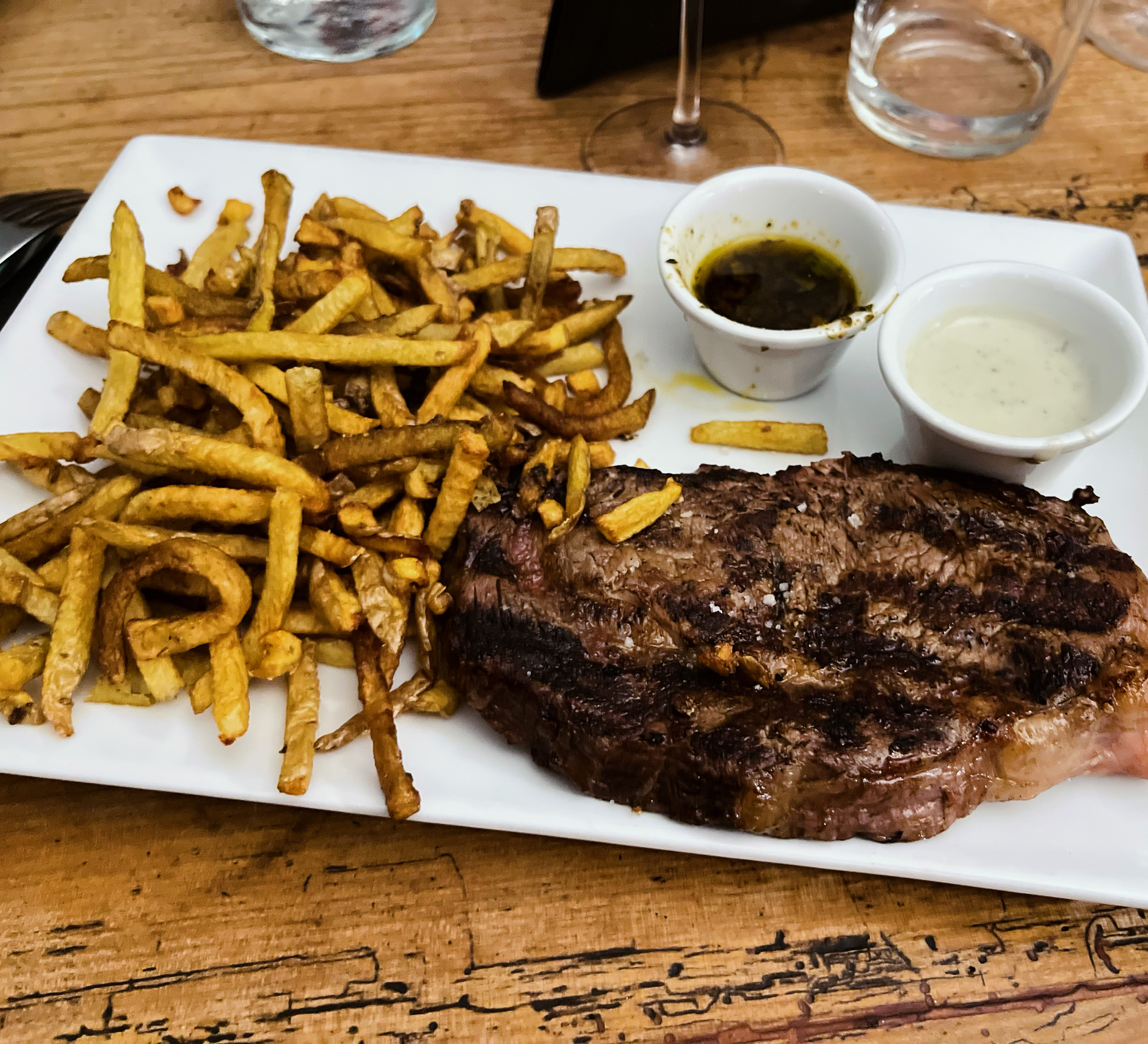 Des steaks frites incroyables ! Je suis allé déjeuner un jeudi et j'ai eu un excellent service avec le serveur qui m'a orienté vers le bon choix de steak pour ce que je cherchais. C'était le point culminant de notre semaine ici en France en termes de nourriture. Les frites étaient parfaites aussi. Il faut aller ici !