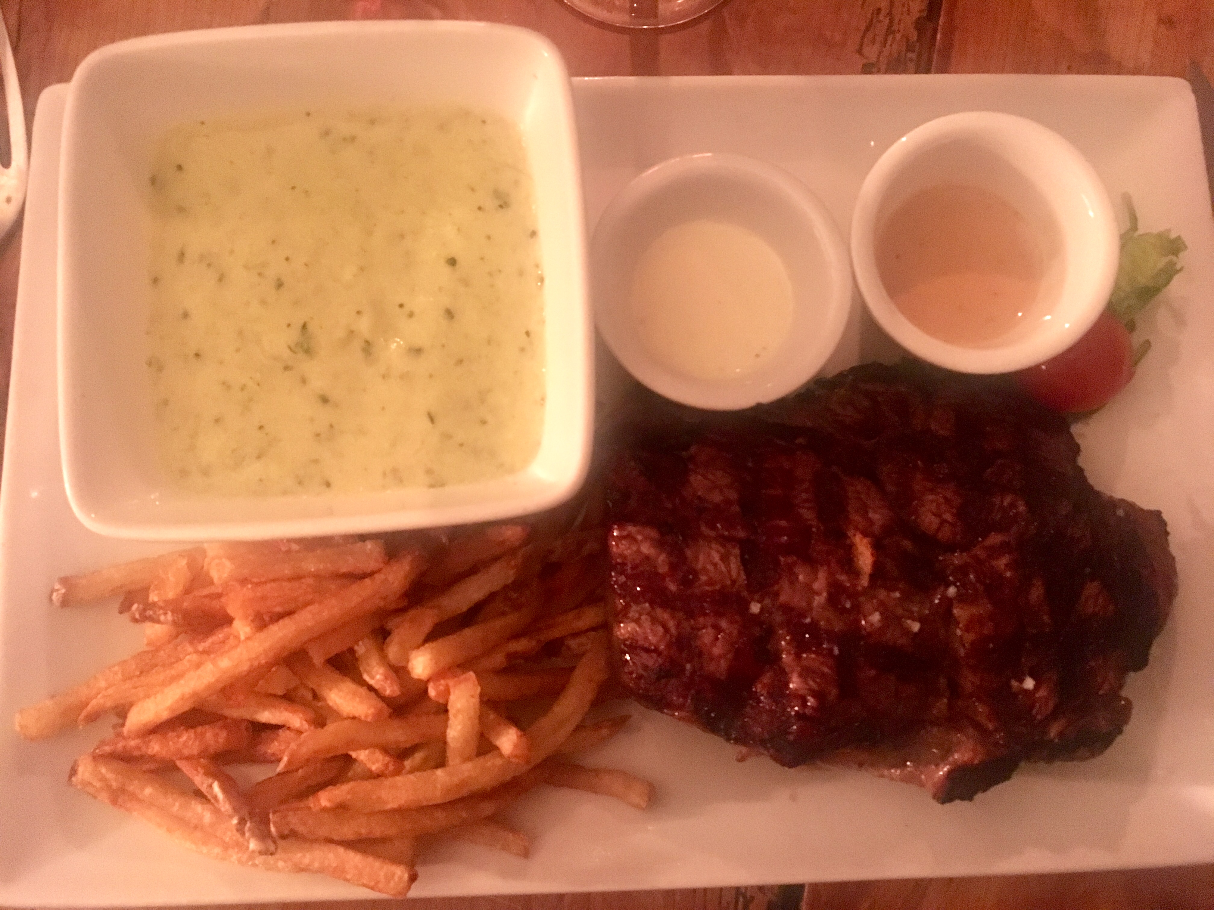 Ma viande était trop cuite d’où la note un peu dure et le moelleux au chocolat caramel manquait de caramel. En revanche, les frites maison étaient bonnes et mes amis ont eu les bonnes cuissons.
