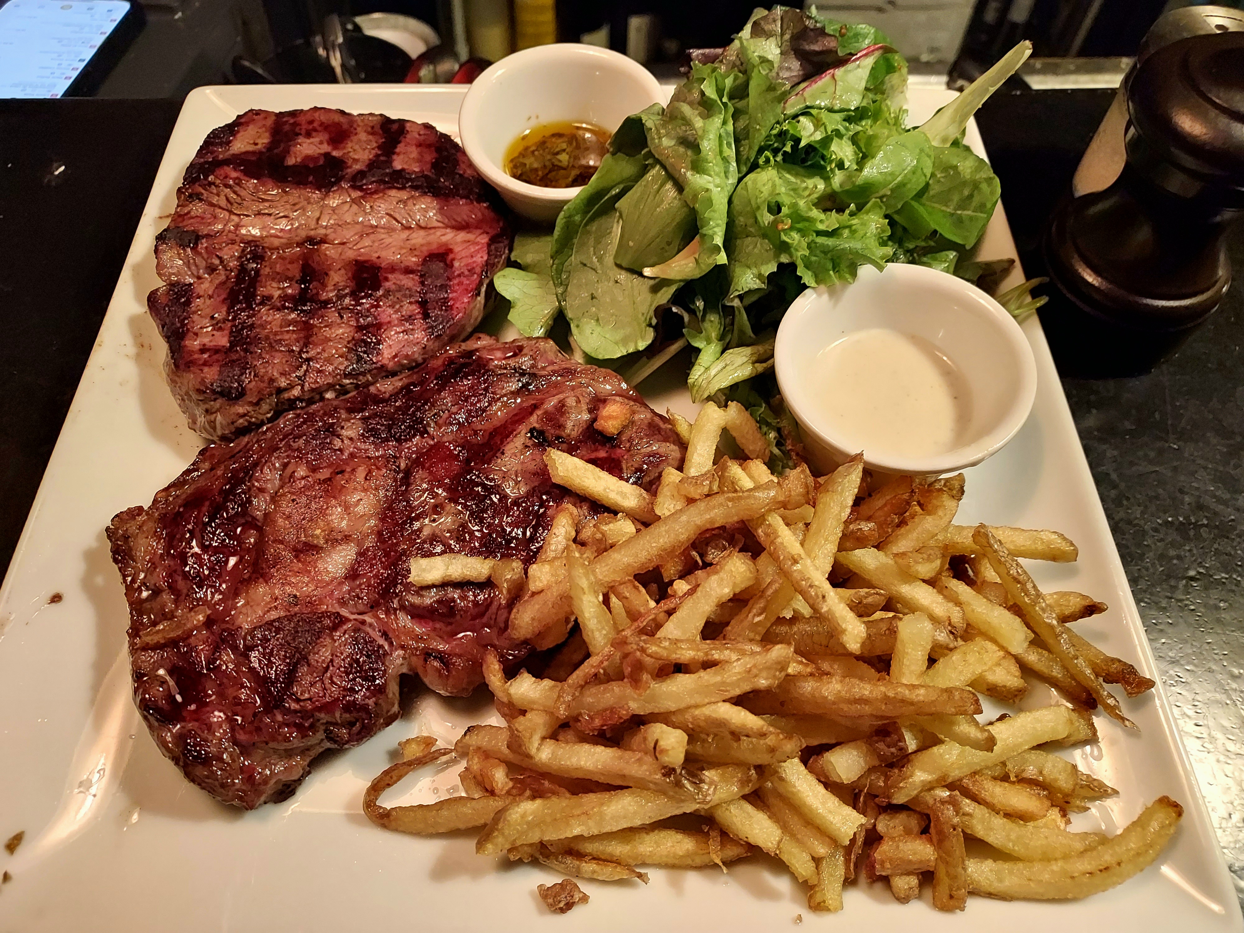 Un endroit idéal pour une expérience steak frites! Nous avons commandé le filet mignon, le faux-filet, le steak tartare, la moelle osseuse, un tas d'accompagnements et de desserts - ils étaient tous délicieux ! La portion était très généreuse pour le prix. Les steaks étaient parfaitement préparés à la commande. Nous avons vraiment apprécié le menu simple et la vaste sélection de vins. Le rez-de-chaussée est plus animé mais l'étage est intime et plus calme.