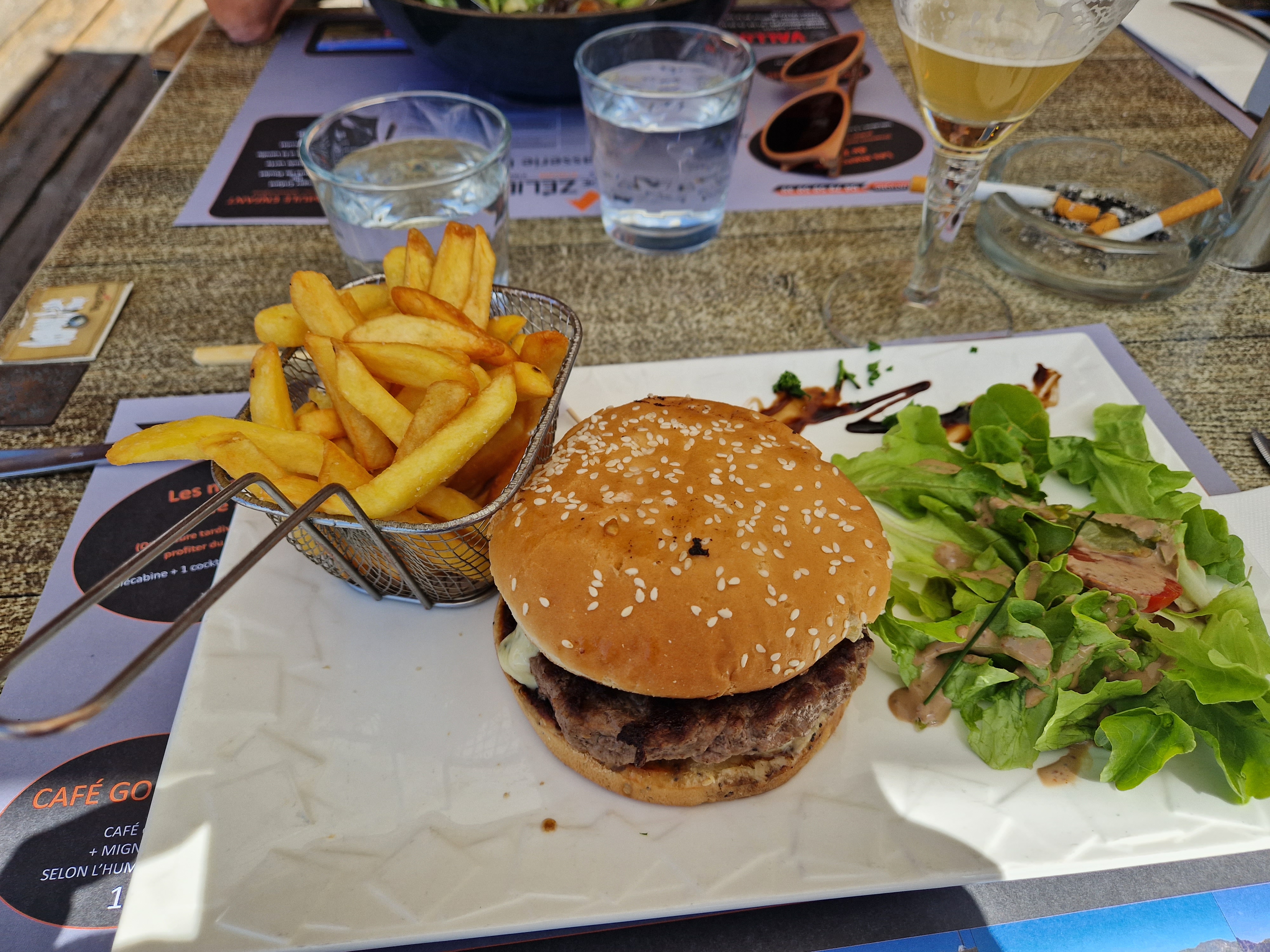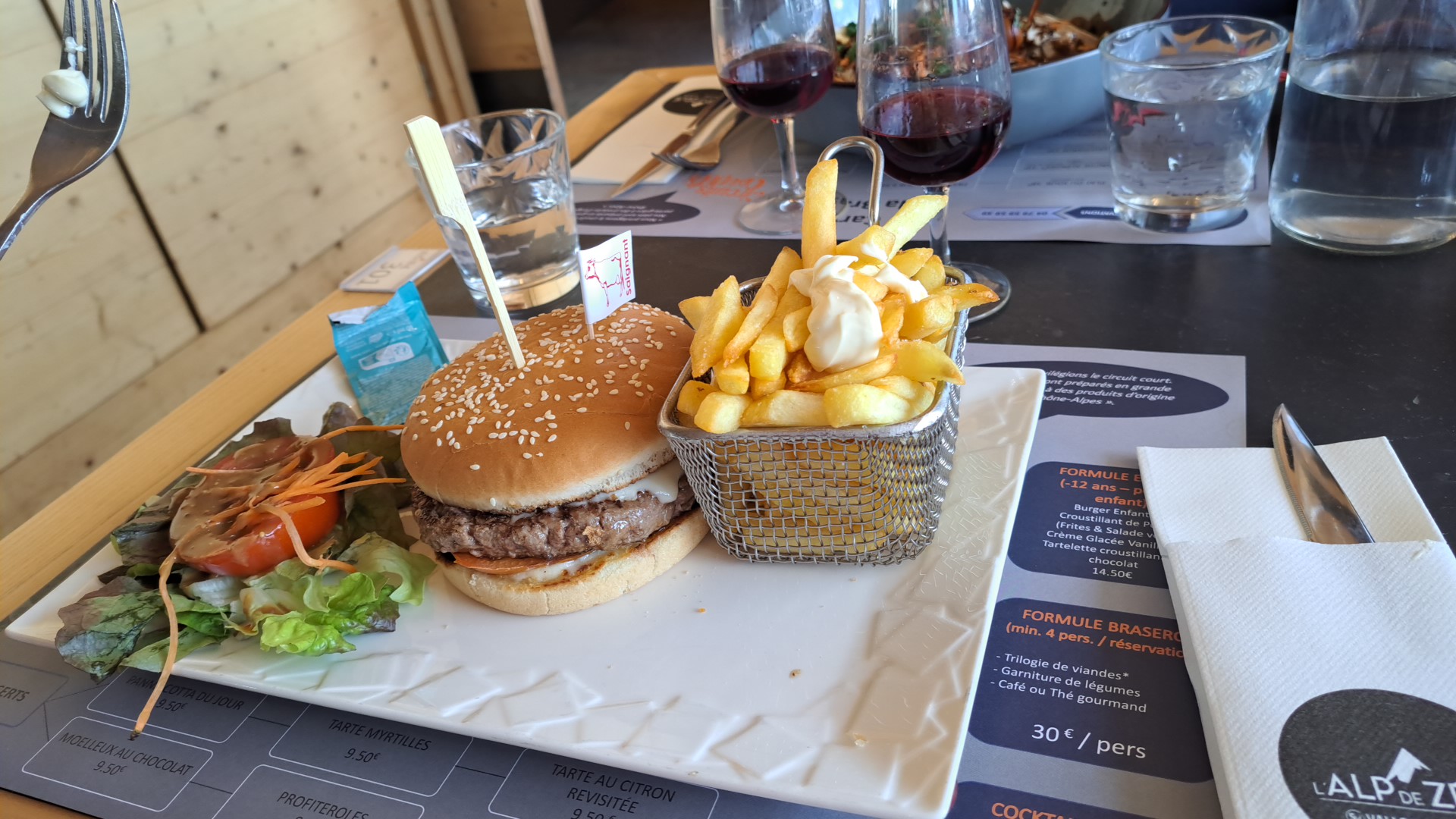 Après 40 minutes d'attente pour commander l'apéritif, puis 40 minutes supplémentaires pour commander le plat nous avons été moyennement convaincu, le burger est sympa, les frites congelés, la salade correcte, plus de 2 heures 30 pour déjeuner c'est un peu long même en vacances, nous n'avons pas voulu tenter les desserts. Le patron est très sympa et semble faire ce qu'il peut avec le peu de personnel qu'il a à disposition. La serveuse, seule personne semble-t-il à pouvoir prendre les commandes n'est pas très aimable, mais passons, des conditions pareilles pour travailler ça doit être difficile (ciel bleu, montagne, temps magnifique), je linvite à venir sur Paris ! Pour conclure, bien pour prendre un verre, pas terrible pour déjeuner.