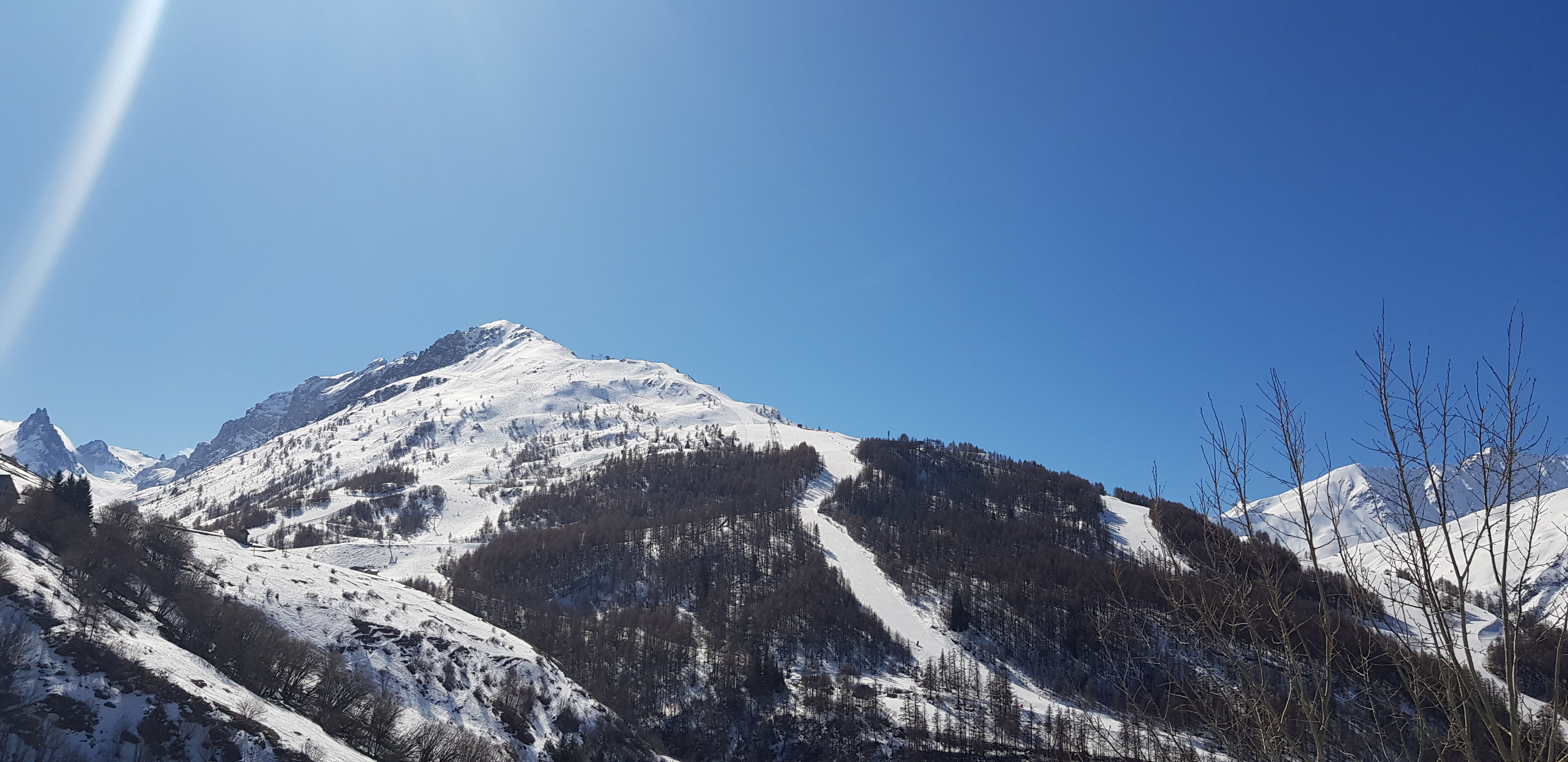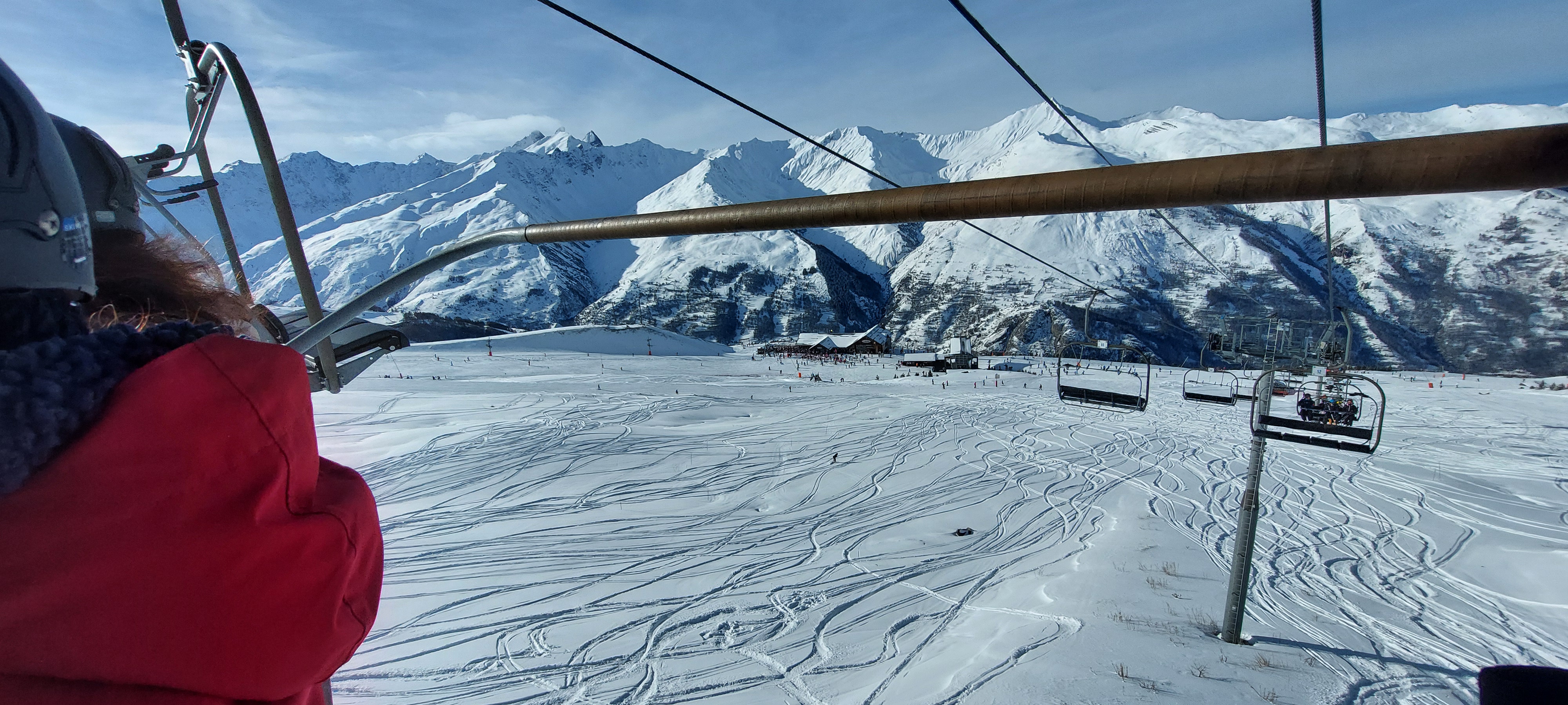Plein soleil. Un chocolat chaud en terrasse. Allongée sur un transat. Juste à la descente de la télécabine, idéal pour les piétons. Vue sur la vallée.