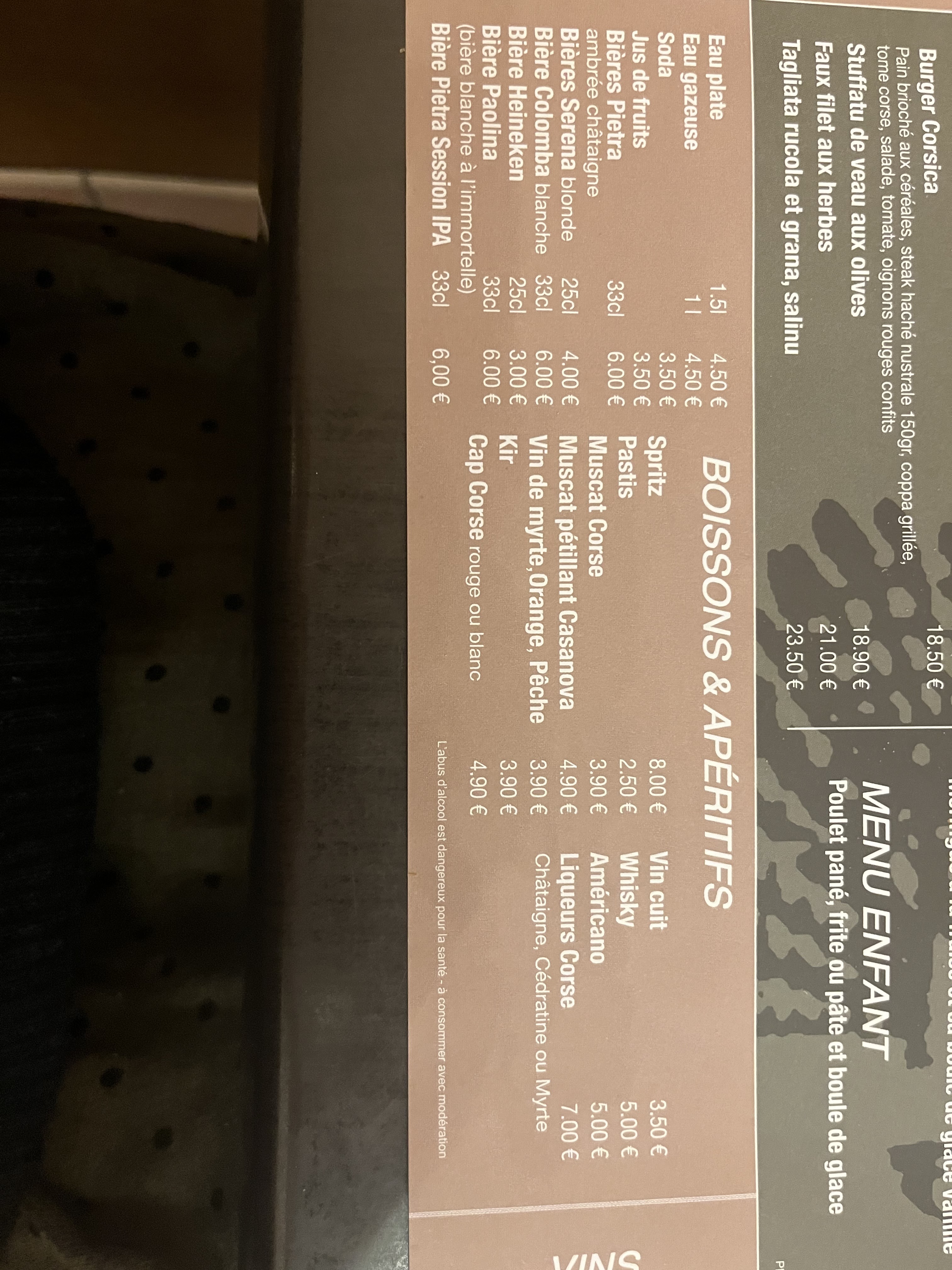 Belle découverte, En famille, nous avons dîné dans ce restaurant, le cadre y est très agréable et les serveurs sont vraiment gentils, souriants. Nous avions pris le menu découverte entrée, plat, dessert et nous nous sommes régalés, cependant les quantités de sauté de veau aux olives sont un peu limites tout de même, une pomme de terre uniquement ça reste léger je trouve ! Par contre le burger corse est copieux et excellent. En dessert je recommande le Fiadone avec zeste de citron, c’est une merveille ! Les prix sont tout à fait corrects ! Je recommande ce restaurant !