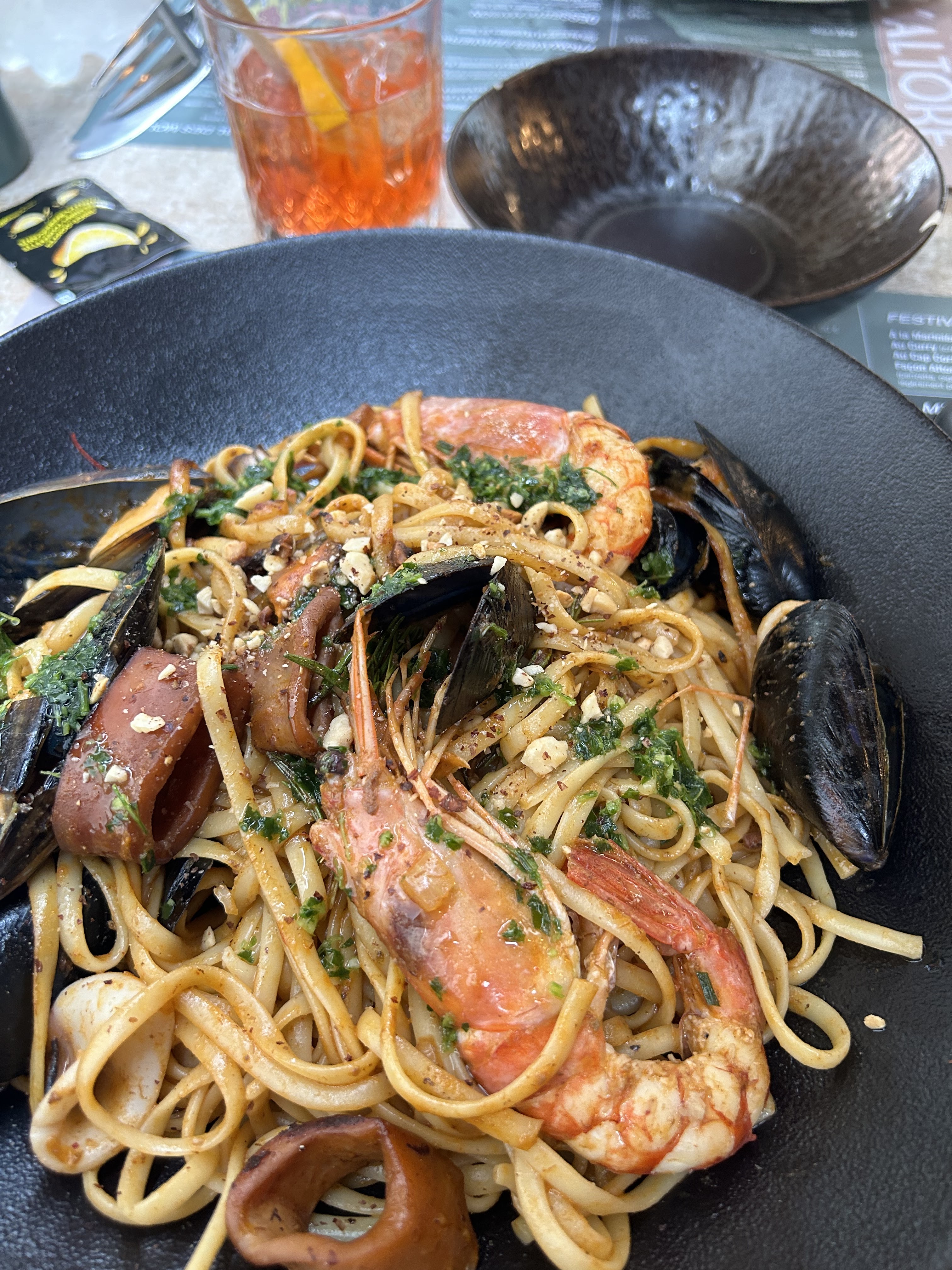 Les tables en terrasse sont extrêmement proches les unes des autres, on mange donc un peu sur les genoux de nos voisins.. S'ils sont sympa, pas de soucis, mais s'ils fument clope sur clope comme les nôtres hier soir, ça peut être vraiment incommodant ! Par contre ,nous avons bien mangé ! Les plats étaient copieux et les pâtes Scoglio étaient délicieuses (même si elles n'avaient pas les seiches et calamars promis sur le menu, donc petite déception).