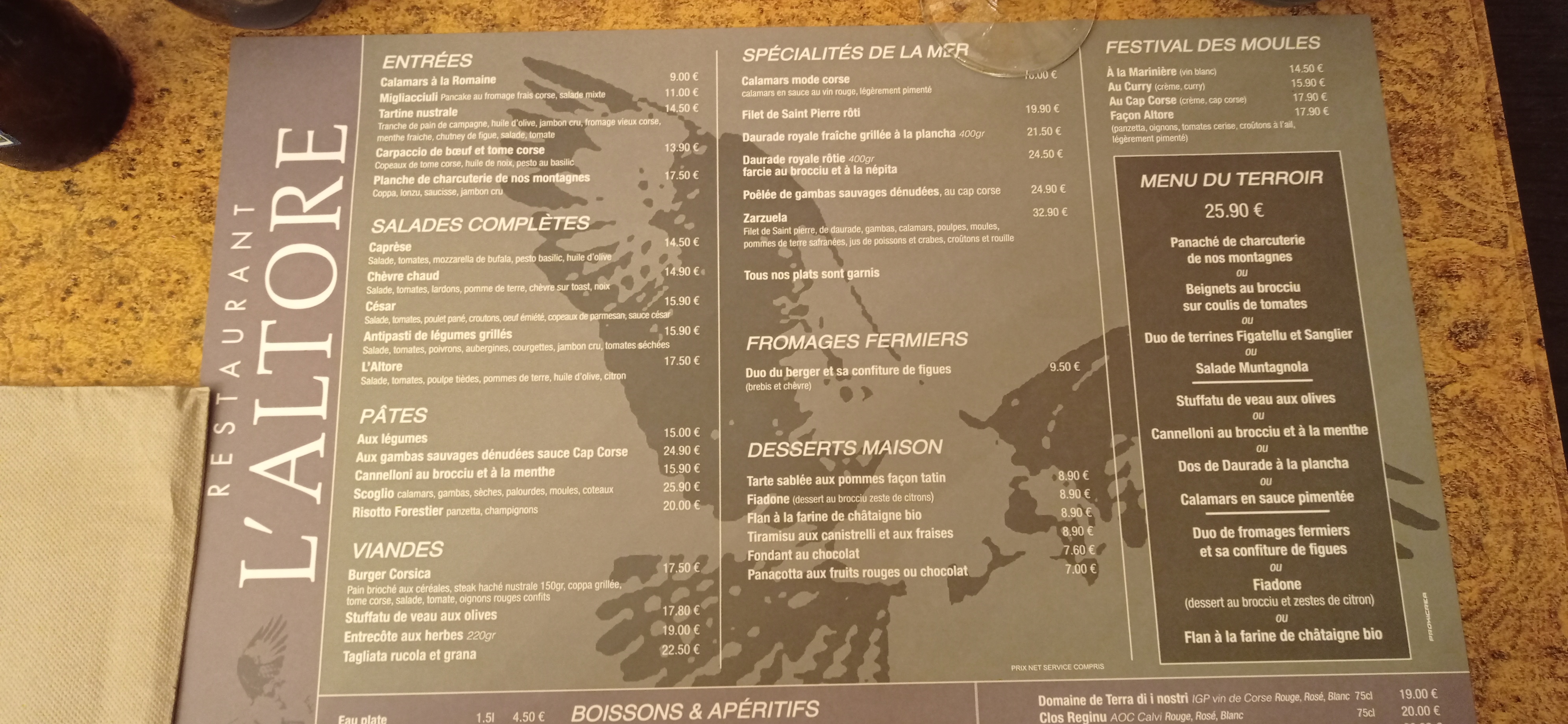 Alors par quoi commencer, l’emplacement l’altore est bien situé en début de rue piétonne, le service est cordial et efficace pour la suite j’avoue se sont des magiciens, une poêlée de gambas sur risotto et petits légumes j’avoue intéressant. A l’arrivée c’est 4 gambas surgelées plus deux têtes (sans corps)avec une purée de riz et les légumes disparus !!! Pour la suite, une salade le légume avec accompagnement salade verte à l’arrivée c’est une salade verte avec 6 cornichons un quart de poivron coupé 6 et 4 rondelles de courgettes !!! Des magiciens…. Sérieusement c’est abusé et je vous parle pas du prix, dommage que la promesse du fait maison avec des produits frais ne soit pas tenu, car l’image du bien et du bon corse n’est pas au rendez-vous.
