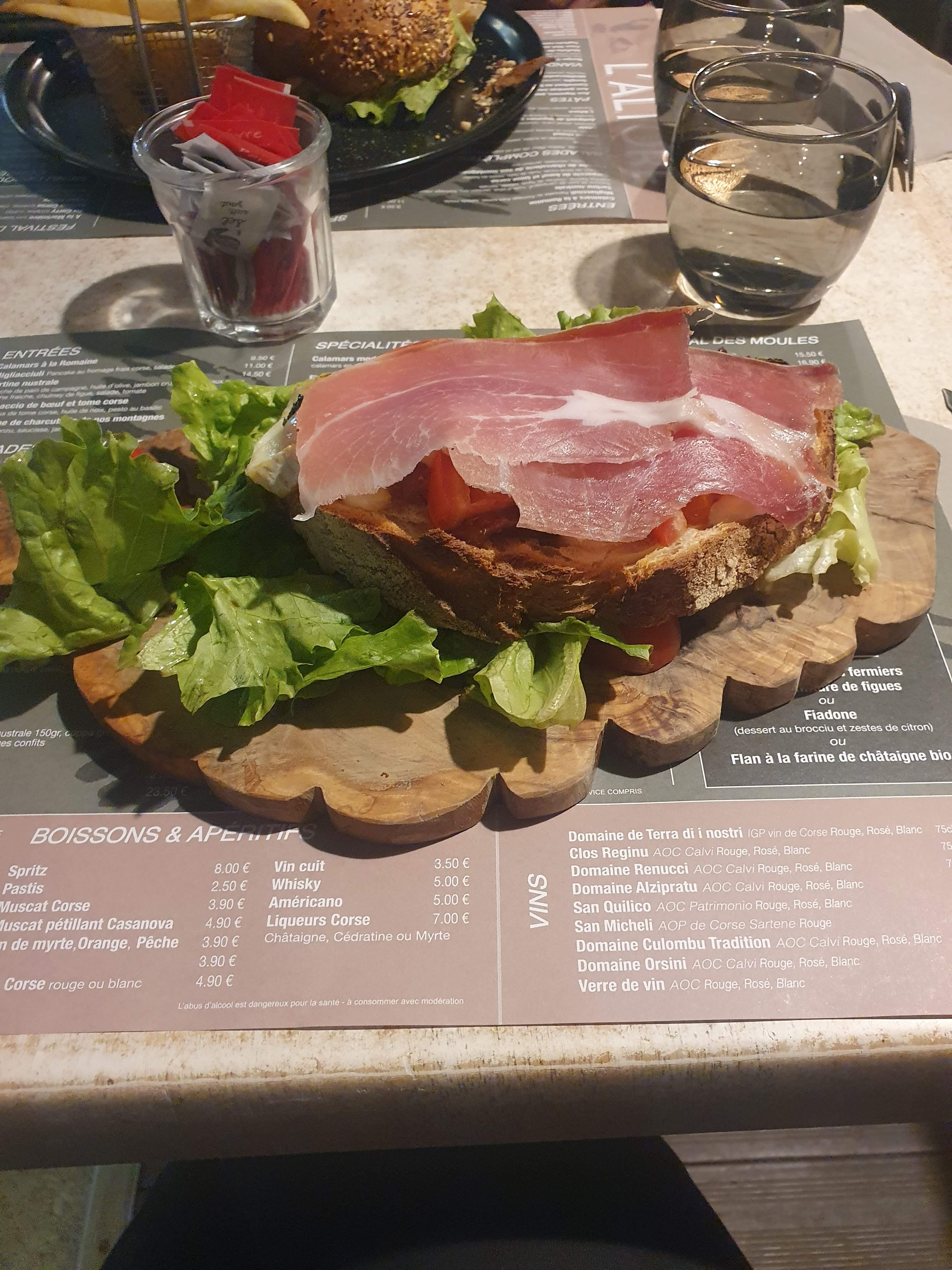 Un burger corse succulent, des desserts très gourmands. Une bonne dégustation sur la terrasse extérieure. Serveur très agréable et bon rapport qualité-prix. À proximité du port avec parking payant. Je recommande