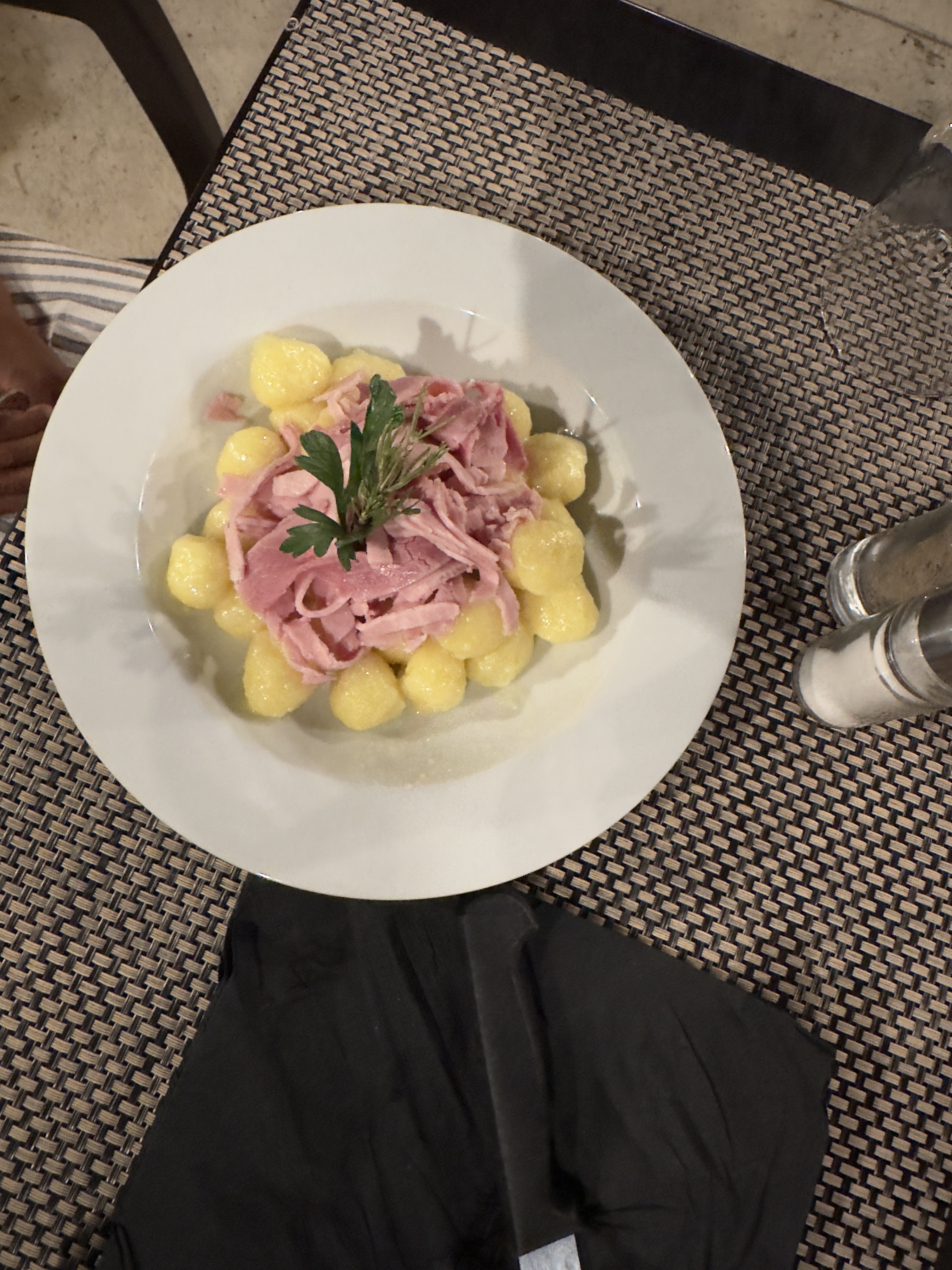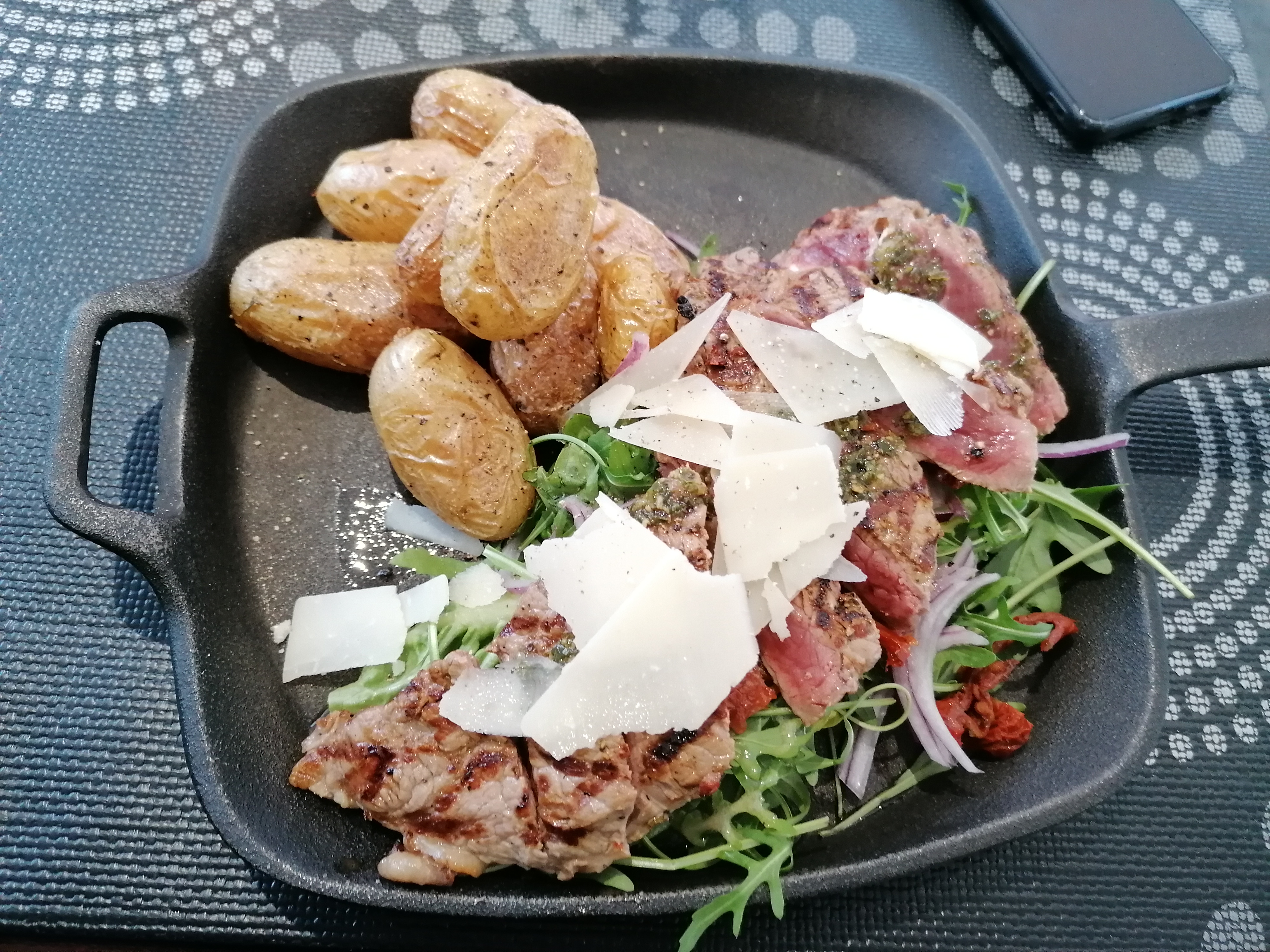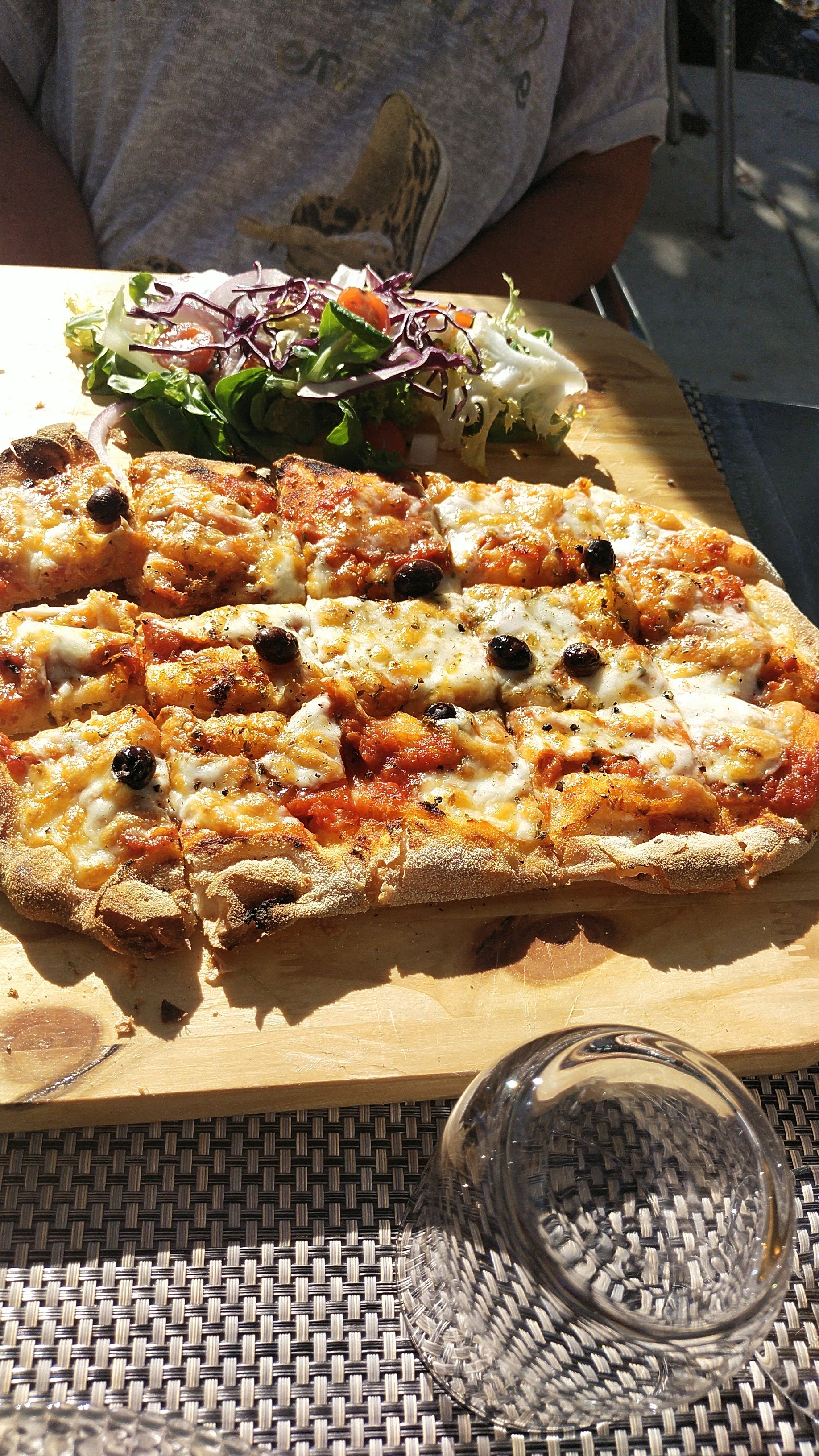 Permettez-moi de commencer par dire que nous n'avons pas dîné parce que nous voulions une pizza (comme c'est écrit partout dans les publicités du restaurant, les dépliants, etc.) mais seulement après nous être assis et commandé un verre, on nous a dit qu'ils n'en faisaient pas. pizzas jusqu'en octobre. La communication était difficile car la serveuse ne parlait que français et avait mal commandé le vin. Personnellement cependant, j'ai bu une bière (Petra) et on m'a apporté une bouteille de 25cl (4€!!!!!!...mais de toute façon le problème c'est le format et non le prix)... une quantité absurde en mon avis à proposer pour un repas car il se termine pratiquement en 1 gorgée et oblige à en commander plus !