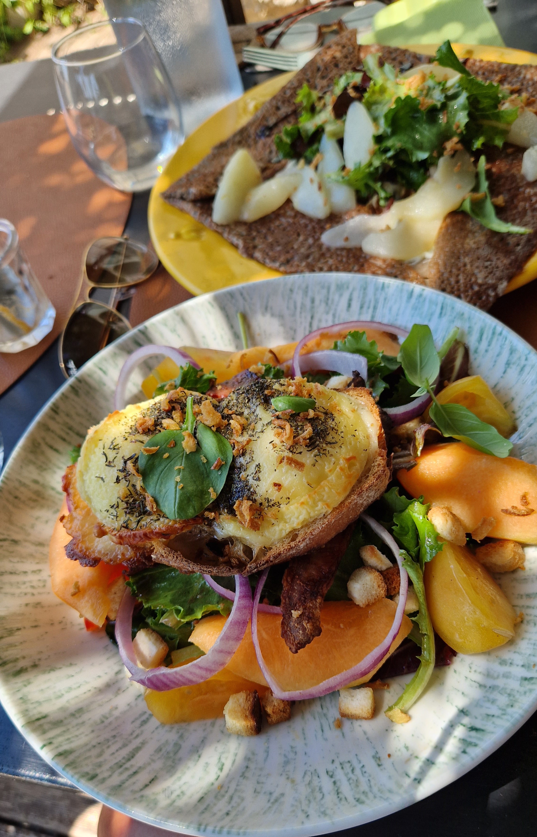Nous avons eu une salade de lanmandier, un toast de chèvre et une galette du moment, suggestions du jour. Probablement la meilleure salade de chèvre que j'ai jamais eue. Je recommande vivement le resturang, très calme, convivial et avec une vue imprenable, comment faire mieux.