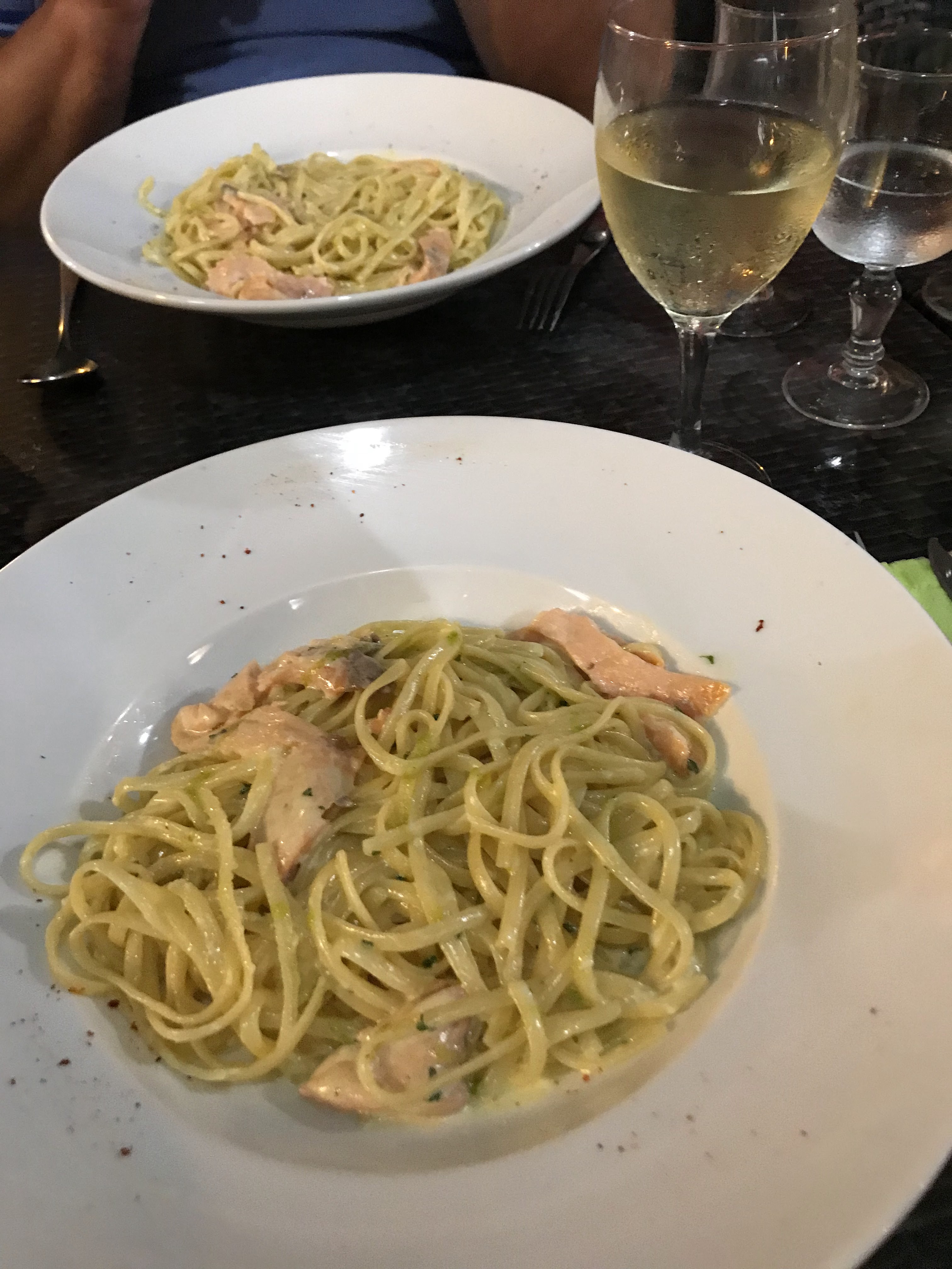 Service chouette. Pas d'attente. Serveur agréable mais cuisine catastrophique. Soupe de poisson ayant le goût d'eau chaude. Fois gras tiède avec graisse dessus. Linguini gras. Tout est gras. Dommage les serveurs sont au top.