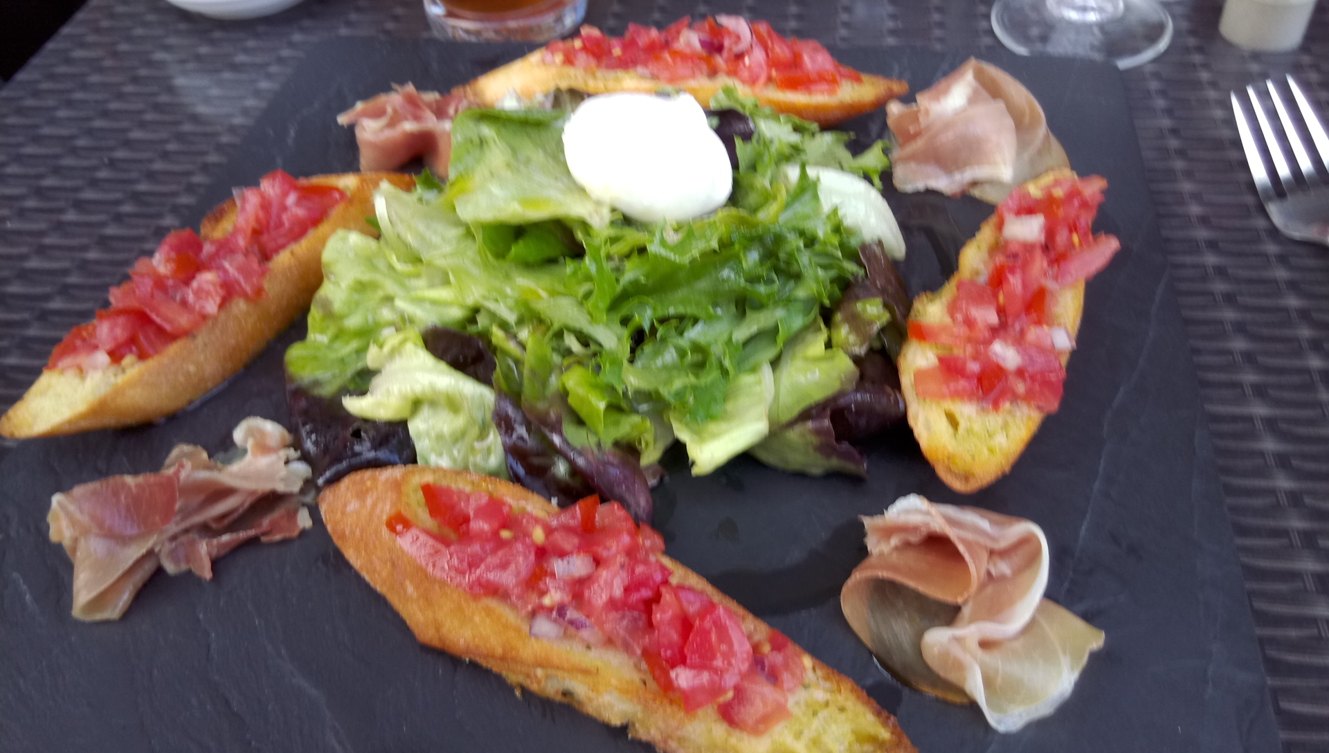 Deuxième fois que nous y déjeunons et une belle découverte. Salade de tomates anciennes et goûteuses avec burrata et de la la lotte avec une sauce au chorizo et crevettes divine 😋 une belle adresse