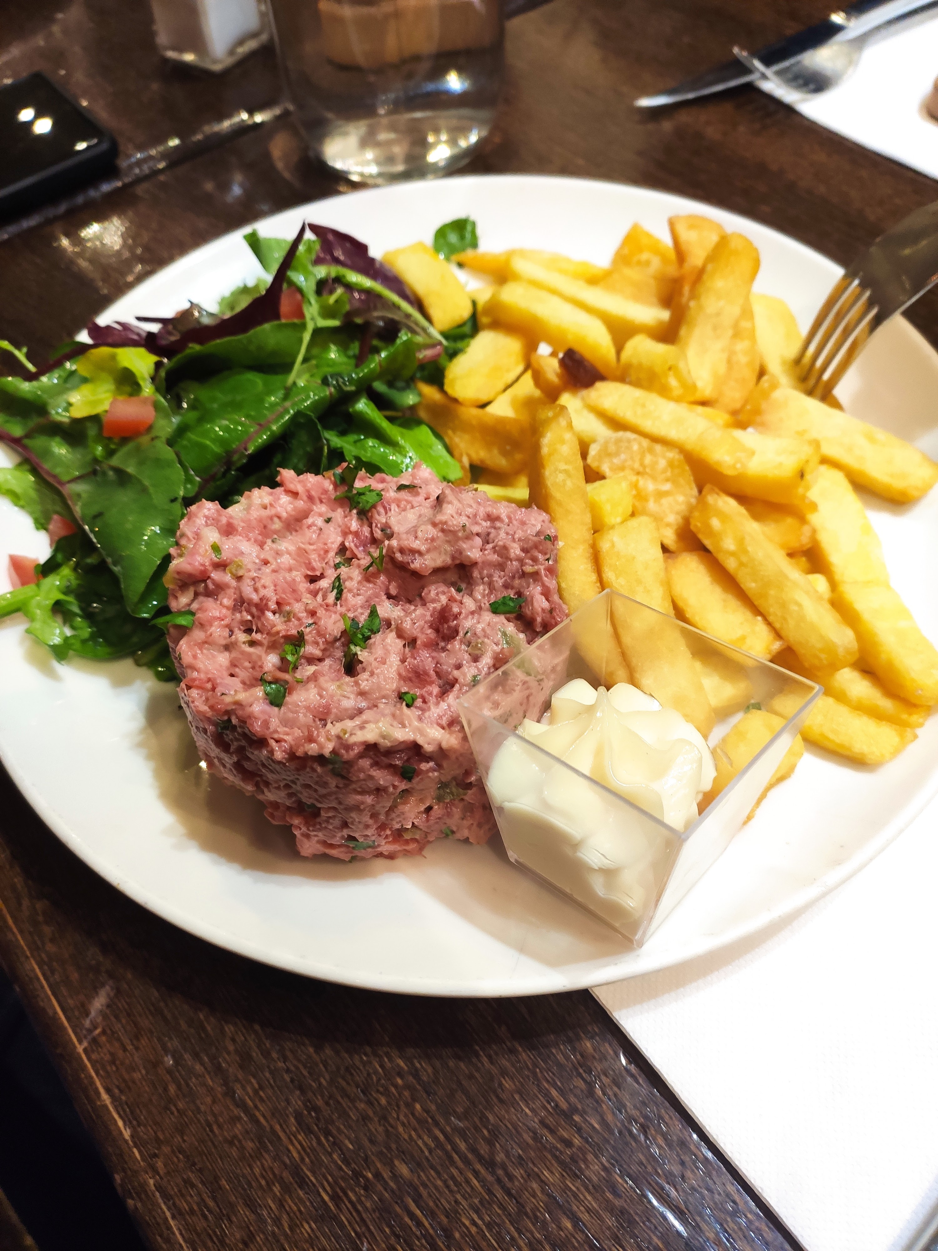 J'ai testé cette brasserie avec des amies. Les frites sont bonnes, le tartare de bœuf aussi. J'ai pris une tartelette aux pommes dite fait maison. Je suis assez sceptique car elle était un poil trop parfaite dans son aspect. Les assiettes sont assez remplies. Les prix peuvent paraître cher mais c'est dû au quartier. Serveur agréable. Je retiens cette adresse pour de futures sorties à Châtelet.