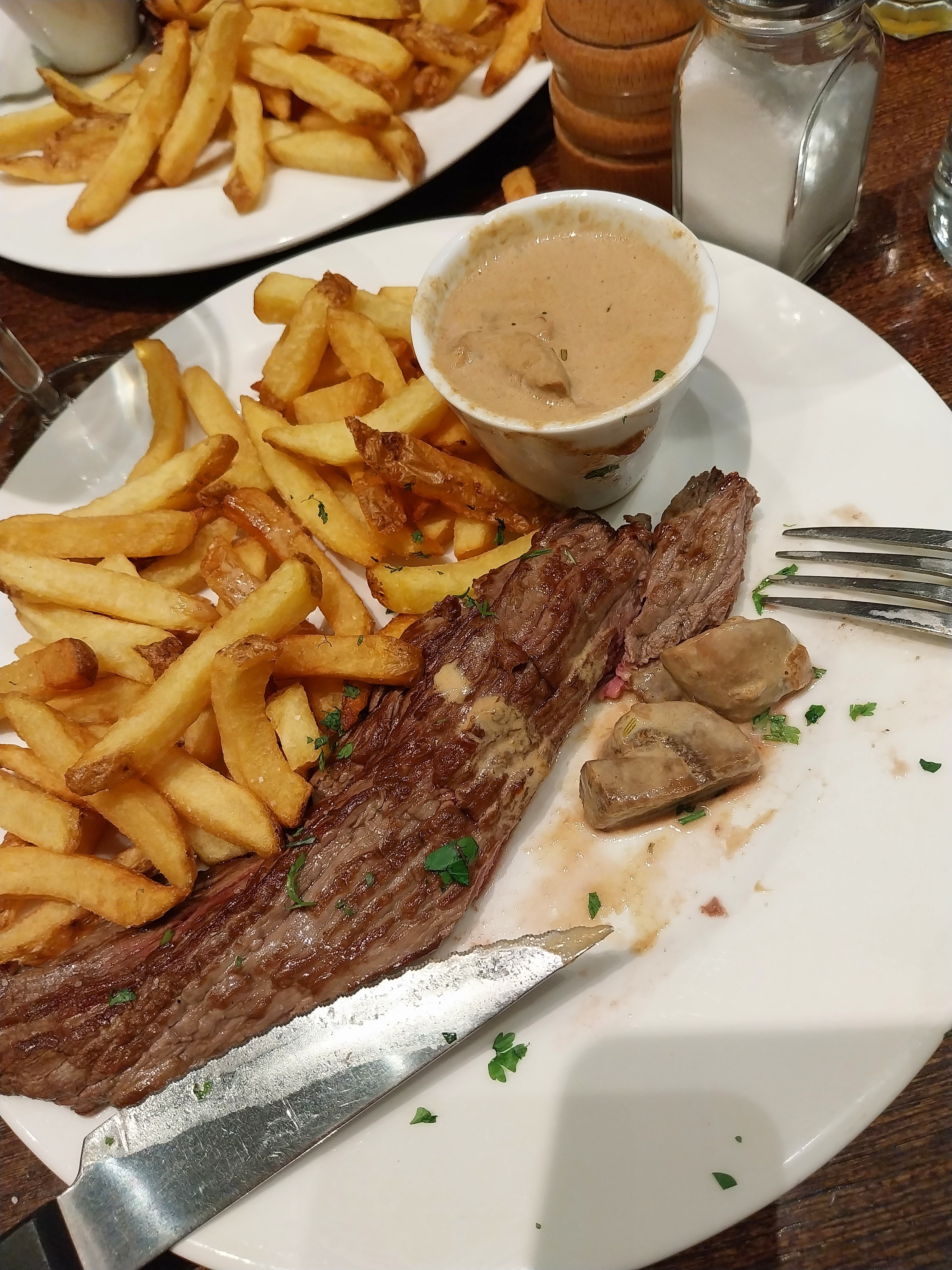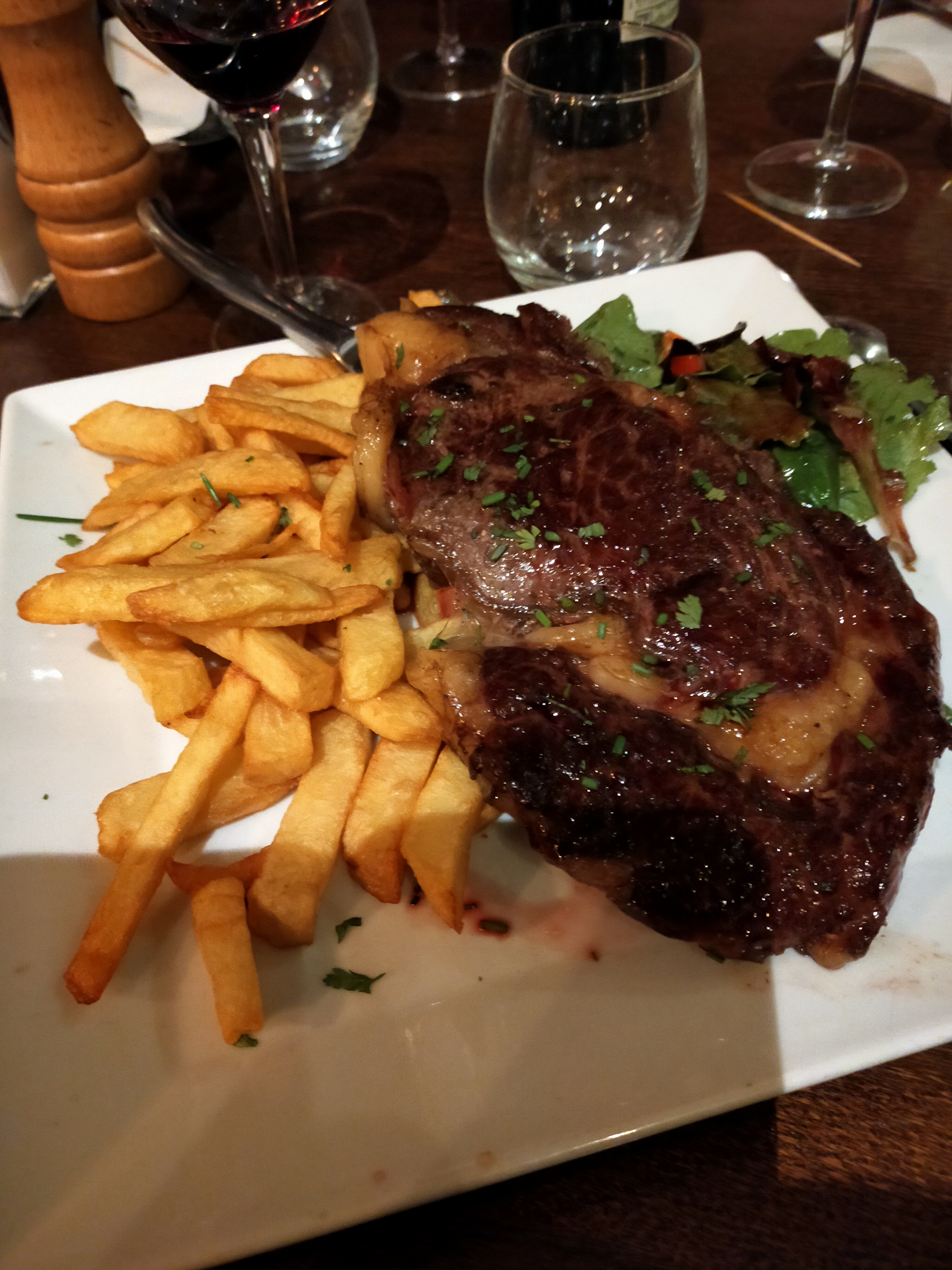 Viande de mauvaise qualité très nerveuse Aucune sauce pour accompagner un steak frites. Moyen