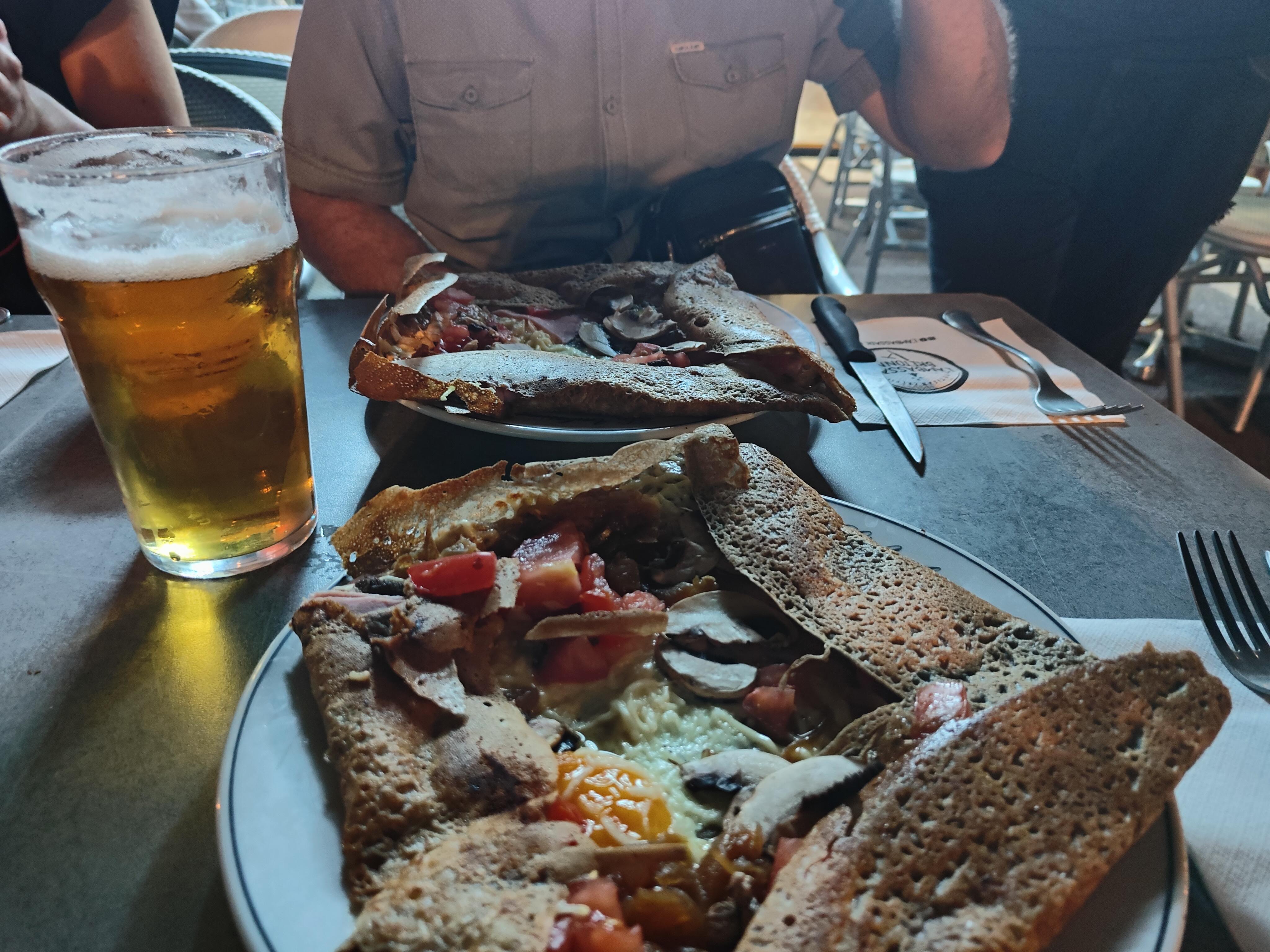 J'attends encore ma crêpe et quand il arrive, il me manque le jambon. Il me le ramène sur une assiette. Commandé au bar pour ne pas fuir de l'attente interminable Heureusement qu'il avait de l'accordéon sur la place.