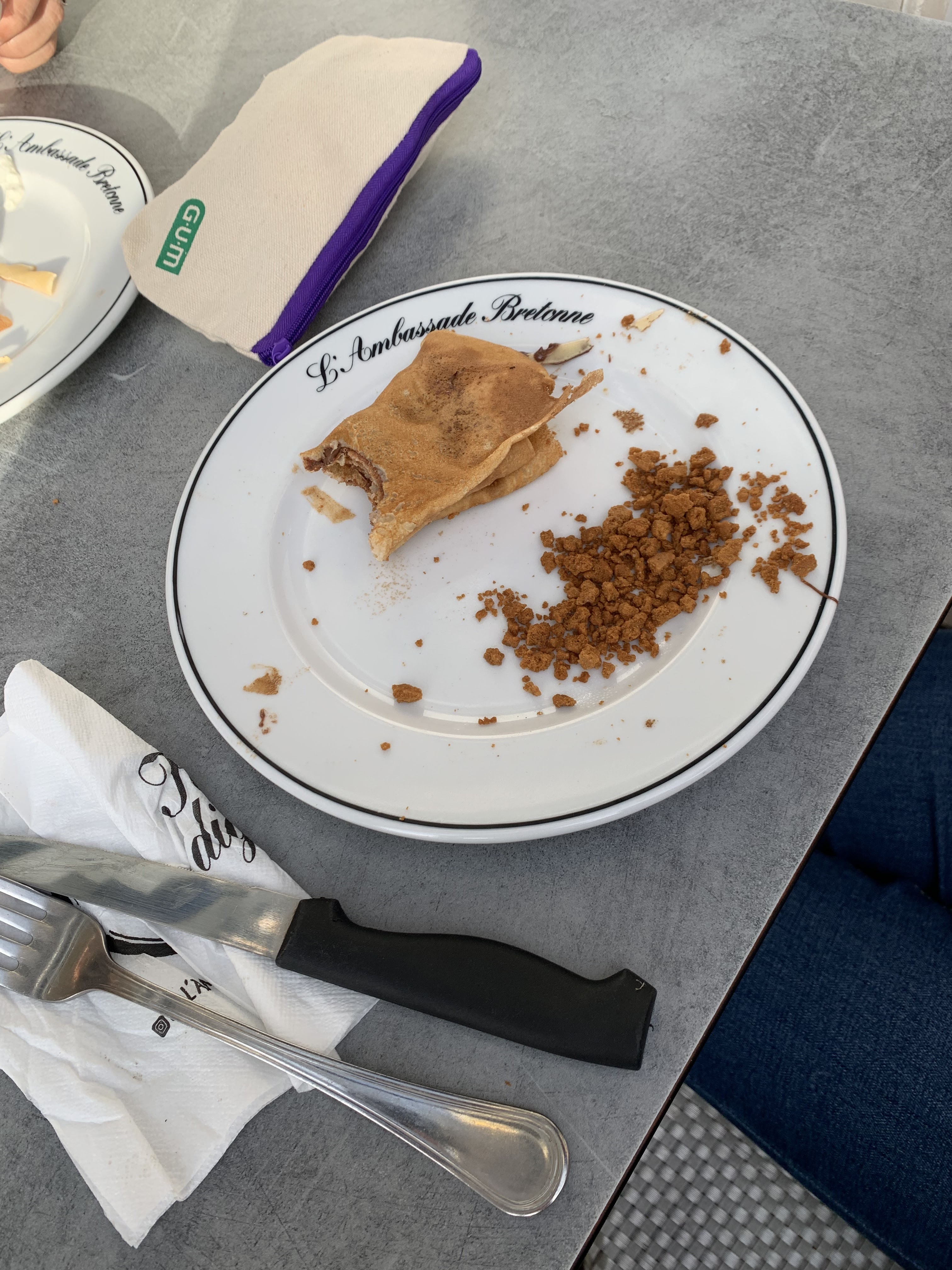 Nous sommes déçus. La salle est sale, la vaisselle semble dépasser la jeune fille au comptoir alors qu'il n'y a quasiment plus personne.Ma fille à pris une crêpe speculos. A fuir ! Des morceaux de speculos dans la crêpe? Jamais vu ça ! Normalement c'est de la pâte à speculos. Étouffant. Tu peux pas la manger ! Faudrait retourner en Bretagne prendre exemple !!! A fuir