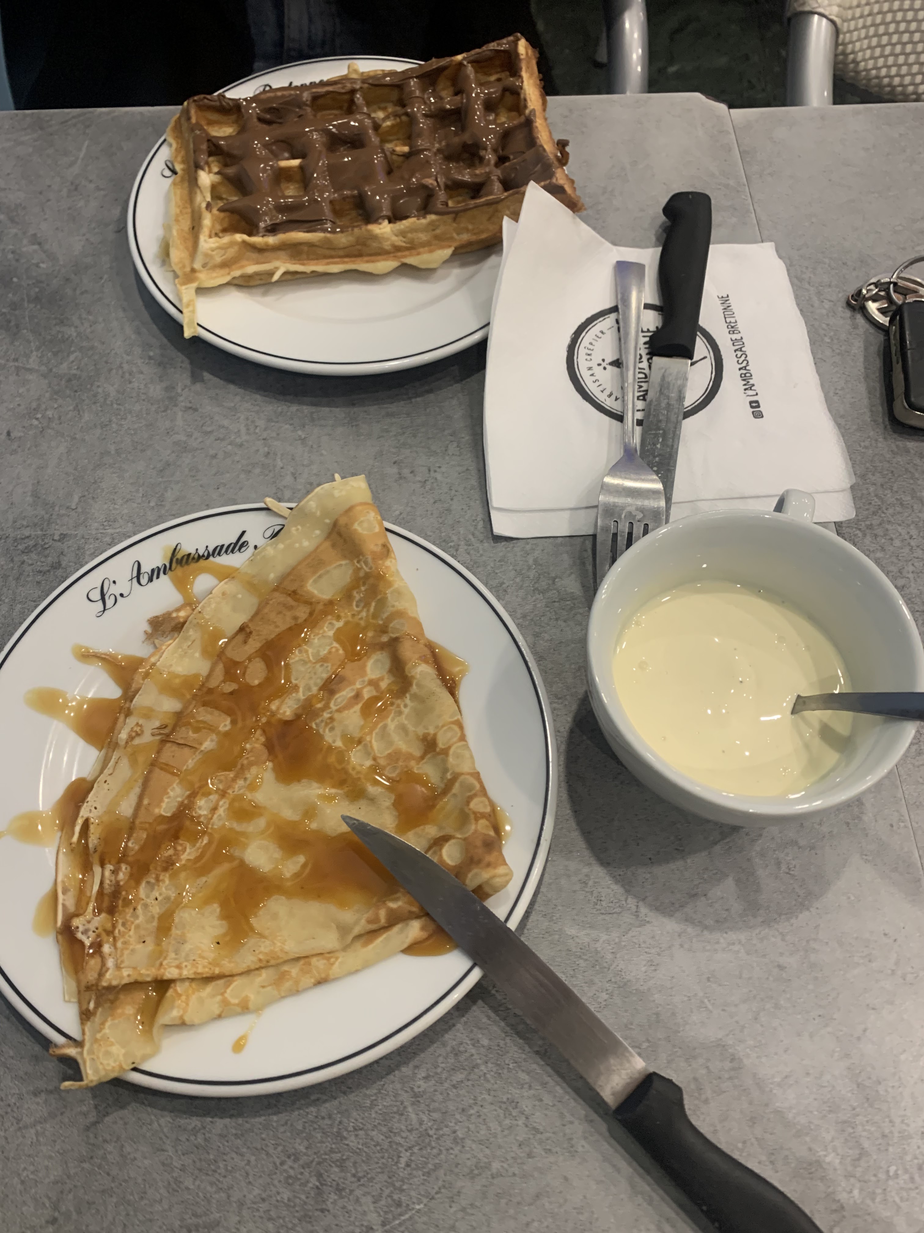 La plupart des avis ne correspondent pas au lieu. Je laisse un avis sur « l’ambassade bretonne » qui est une CRÊPERIE !!! Prix prohibitifs pour quantité moindre. Lorsque la cuisinière a préparé les crêpes, la pâte à crêpe ne prenait pas l’entièreté de la crêpière…. (on peut voir les crêpières qui sont face aux clients derrière un plexiglass) Mais bon, on a limite envie de dire « tant mieux » au vu du goût et de la qualité des ingrédients… Goût de chimique dans la pâte à crêpe sucrée, ce n’était pas bon. Le seul + c’est la vue sur Notre Dame. Serveuses sympathiques et aux petits soins, malheureusement cela ne suffit pas, surtout pour le prix !!!! C’est un attrape touristes !! Fuyez.