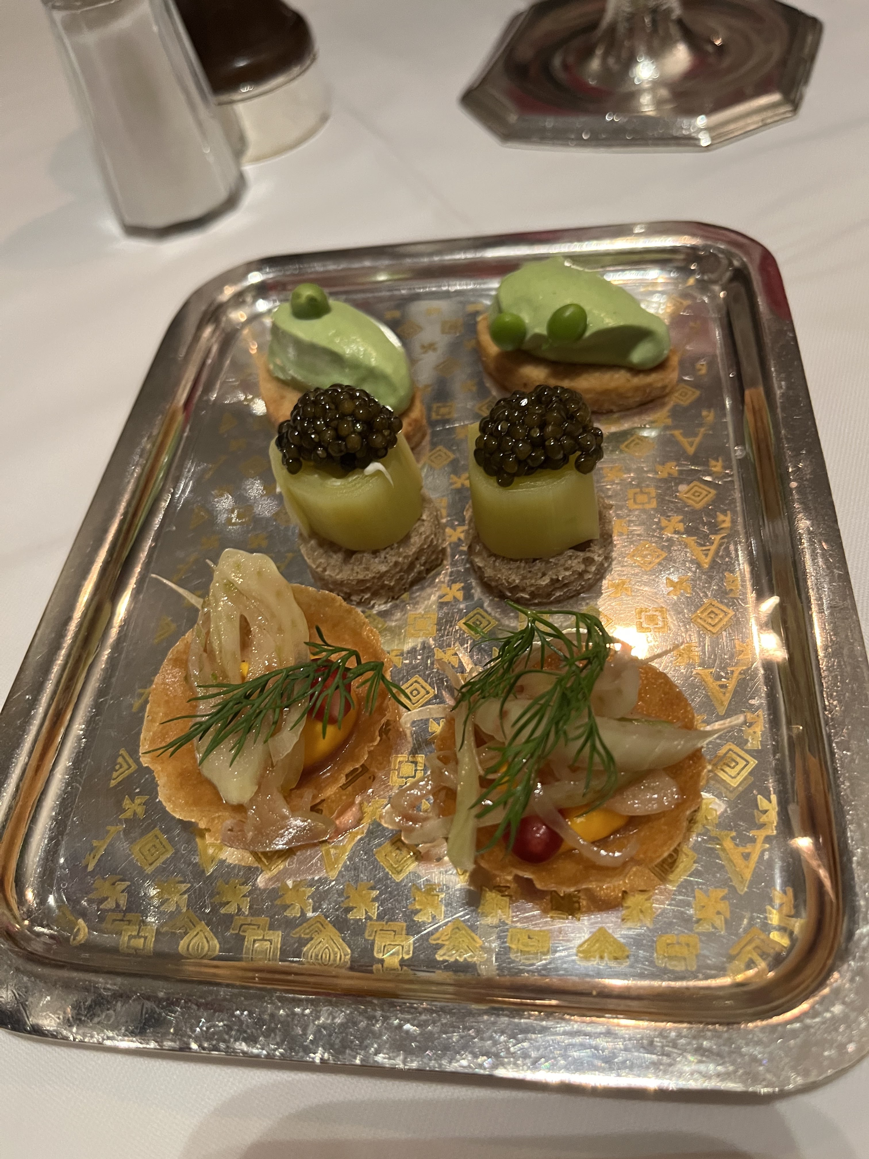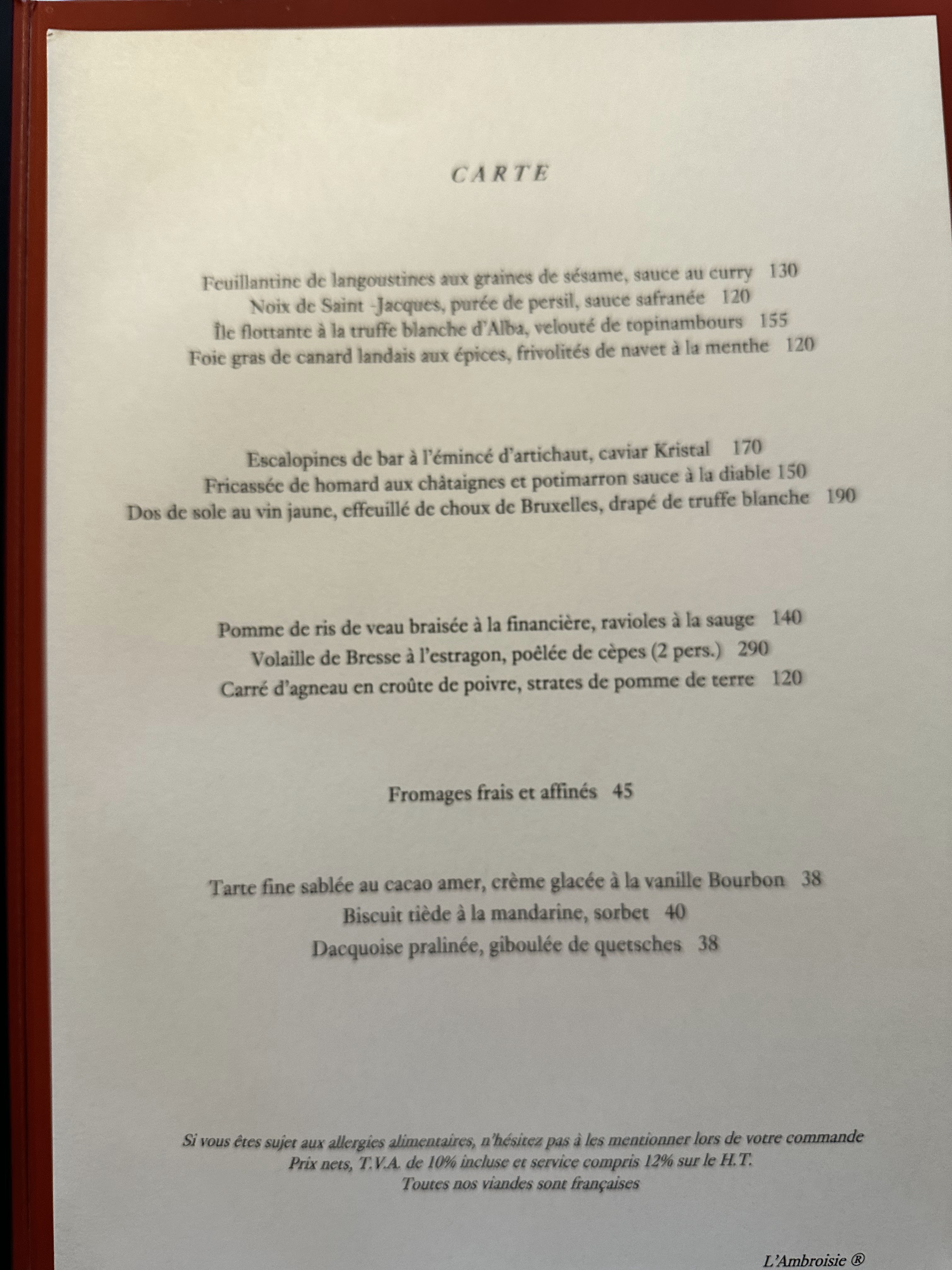 L'ambroisie est une institution francaise mais qui est figée dans le passé et dont la ciuisine tombe en désuétude. Servir des gougeres moyenne et un morceau de saumon avec du caviar en aperitif releve d'une absence totale de creativité les entrée sont d'un classicisme et d'une platitude consomée a des prix tres largement inflaté. la Dariole de fois gras aux morilles est sans saveur marquée - la texture du plat rappelle un plat de service gériatrique Le navarin de homard - plat emlématique de l'Ambroisie - est trop salé avec des legumes trop cuits - encore une fois aucun croquant aucune saveur franche - une platitude salée en bouche La cote de veau pour 2 a 280€ n'est guere mieux les morilles ne sont pas des morilles fraiches, la sauce au vins jaune n'est pas bien executée tant la presentation que l'execution du plat sont bien loin du niveau d'un 3 etoiles les desserts sont du meme niveau avec avec des presentations acceptable et des saveurs correctes mais on est loin de patisserie de competition malgré des prix stellaires Les petits fours/mignardises sont pathetiques avec une tartelette aux fraises, un st Honoré et un mini canellé... La carte des vins est évidemment exceptionnelle (une autre tradition francaise) a des prix exceptionnellement élévés (toujours une tradition bien francaise) mais le Meursault 1er crus 2020 et le Corton grand cru 2017 etaient fantastiques ce qui sauva partiellement ce diner Au final un restaurant qui ne mérite plus sa renomée comme beaucoup d'institutions culinaires francaises dont les chefs se refugient dans un passé glorieux en pratiquant des tarifs deraisonnables (600€ + par personne) et completement déconnectés de la prestation culinaire offerte. La complicité du guide Michelin France est criminelle - l'Ambroisie aurait difficilement 1 etoile dans le guide michelin Japon. Messieurs il ne suffit pas de travailler des produits honéreux pour étre 3 étoiles - la technique et la créativité sont essentielles - L'Ambroise n'en peu ou plus... C'est évidement et malheureusement la derniere fois que je viens à l'Ambroisie car le monde culinaire a beaucoup mieux a présenter