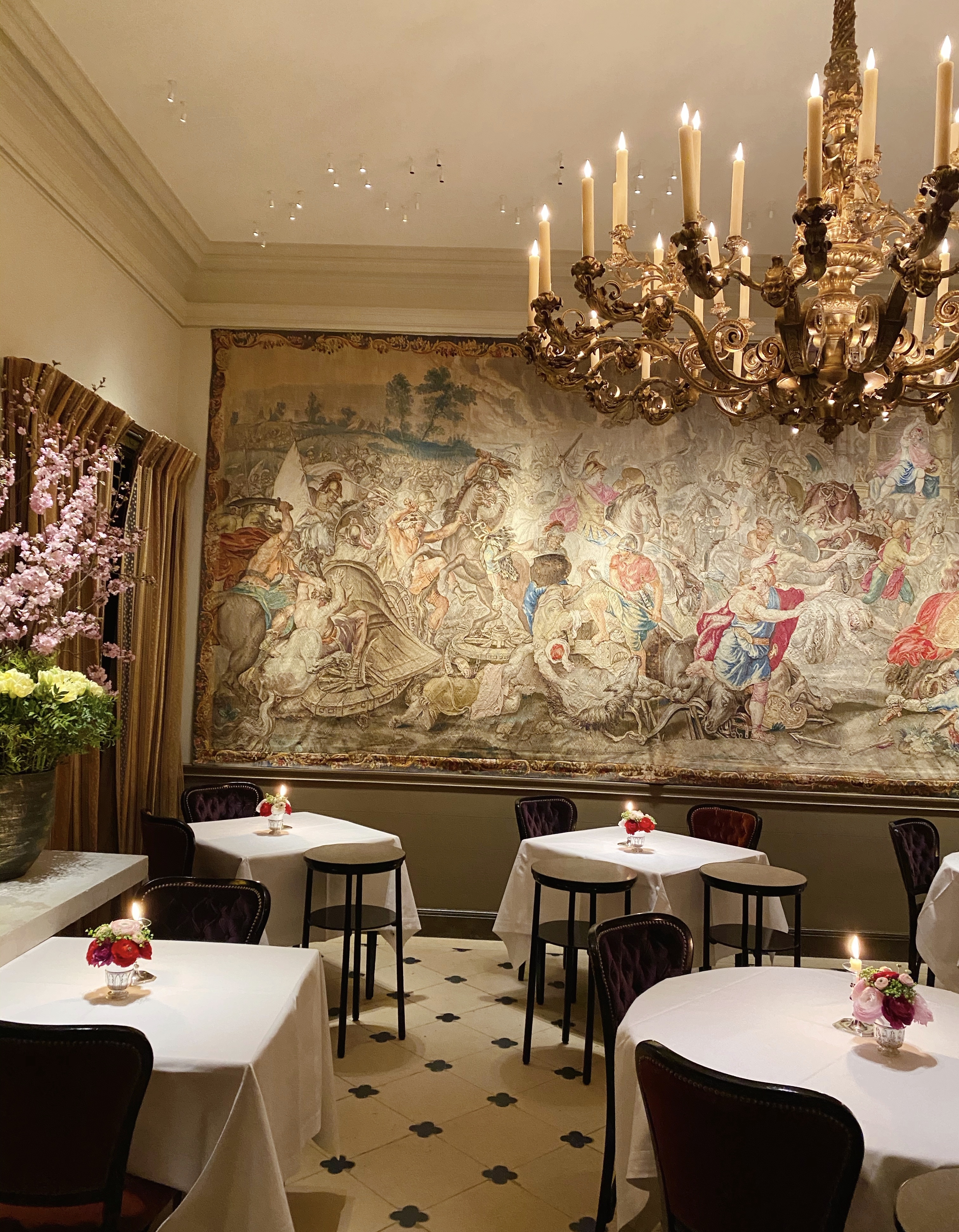 ❝ Menus dégustation de mets français raffinés soigneusement présentés, servis dans une salle décorée de lustres et de tapisseries. ❞