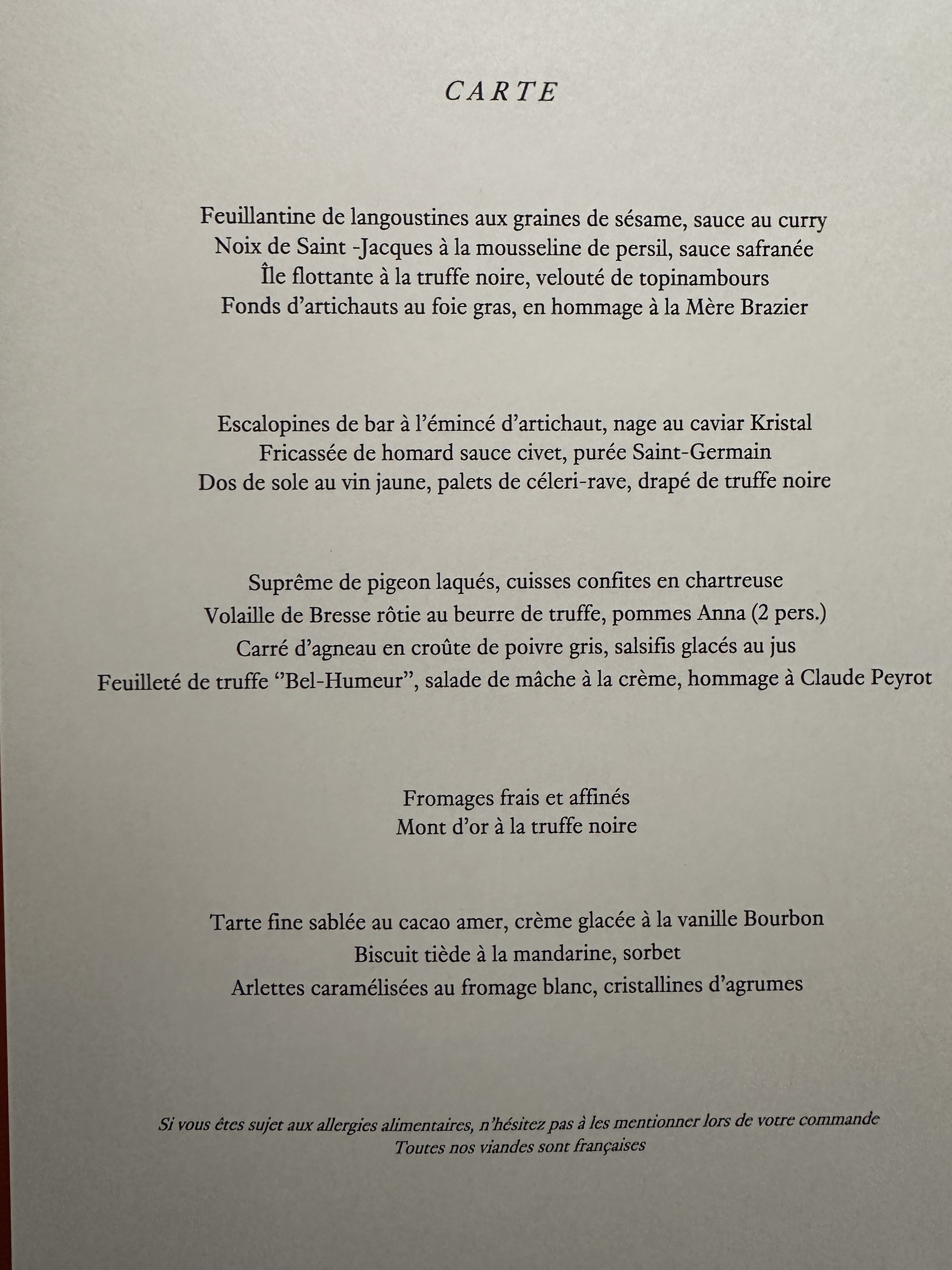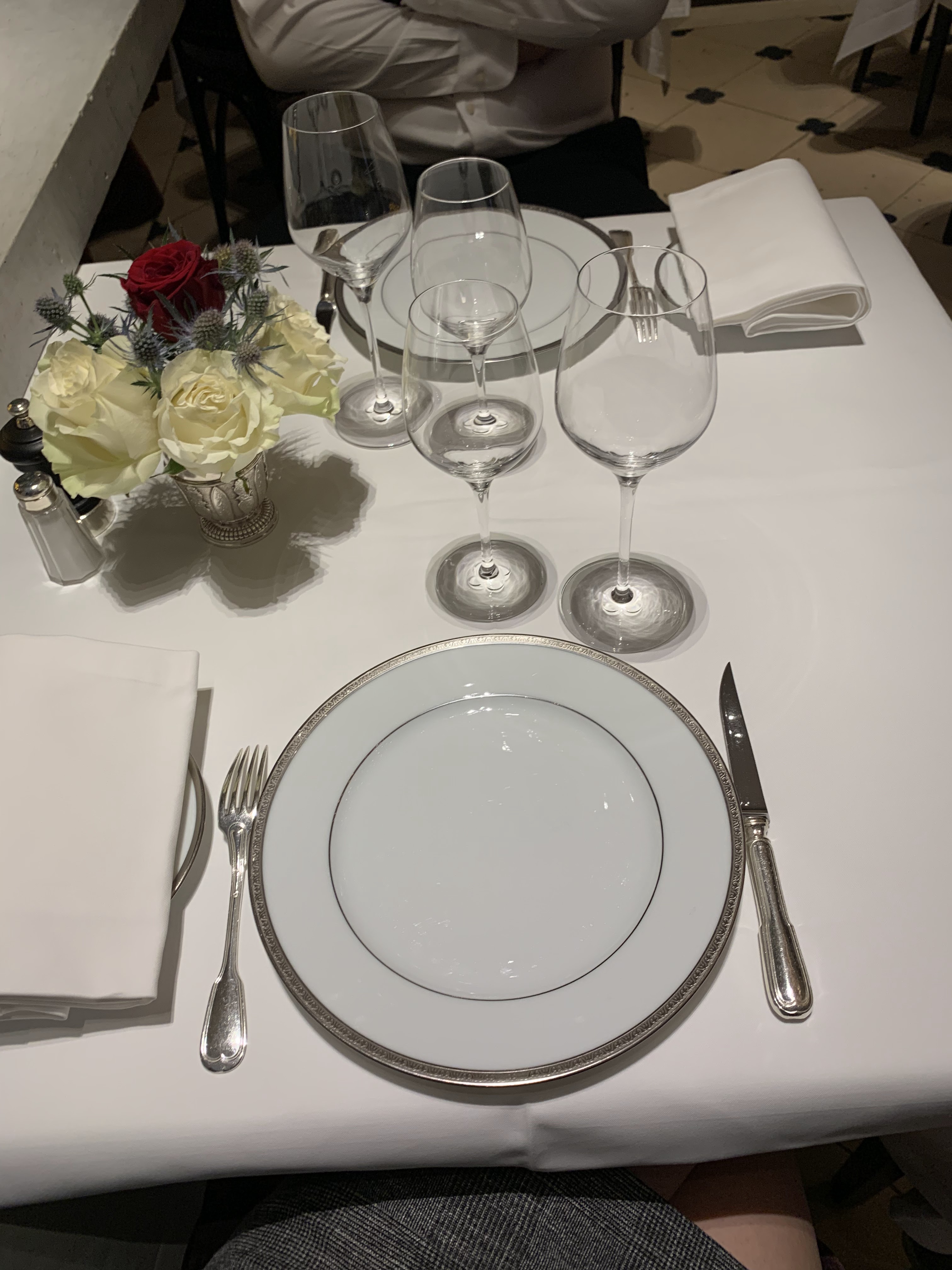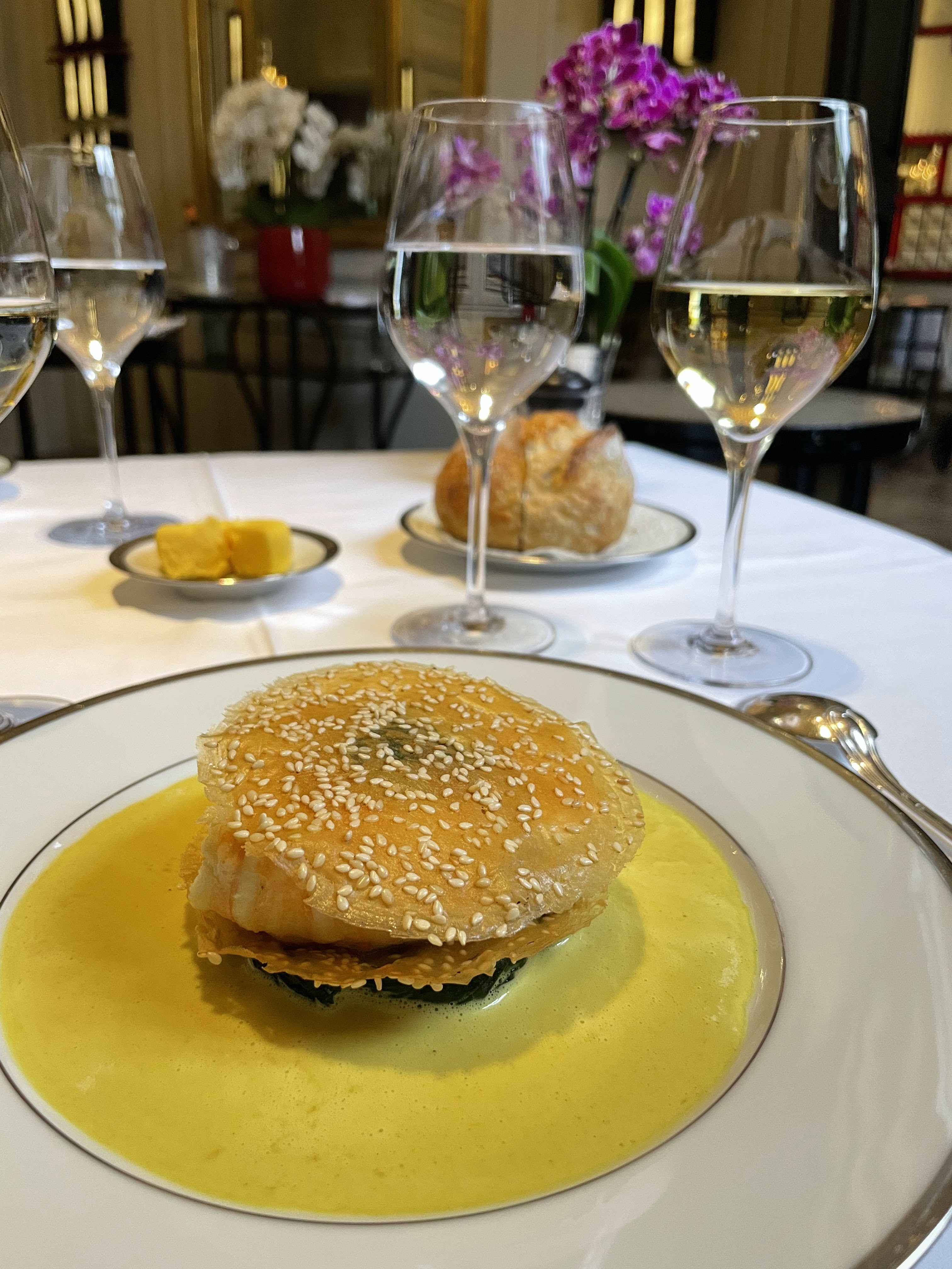 Lieu exceptionnel Le cadre est bien évidemment somptueux en corrélation parfaite avec la place légendaire. Accueil agréable et personnel discret mais attentif. Nous nous sommes sentis à l'aise malgré nos origines provinciales. Contrairement à d'autres tables d'1 telle renommée il est très intéressant de revenir aux fondamentaux, à savoir le produit qui est sublimé et 1 repas en 3 voire 4 plats ( fromages) contrairement à 1 multitude de petits plats à se suivre à en oublier le plat principal comme le pratiquent des confrères. Nous avons goûté à la spécialité de la maison à savoir la langoustine. Cuisson parfaite Exquis Mon époux a choisi l'oeuf parfait à la truffe blanche : divin Puis nous avons opté pour le ris de veau: magnifique. D'autres convives ont opté pour la noix de Saint Jacques : là encore copieux et produit exceptionnel Nous sommes des amateurs mais là la maîtrise est plus que parfaite avec le condiment au persil et les ravioles : 1 pur bonheur Le plateau de fromages est très intéressant et les coupes copieuses. Nous reconnaissons avoir eu la chance et le privilège de découvrir cet établissement invités par 1 habituée des lieux et proche des propriétaires Cette expérience restera gravée Merci