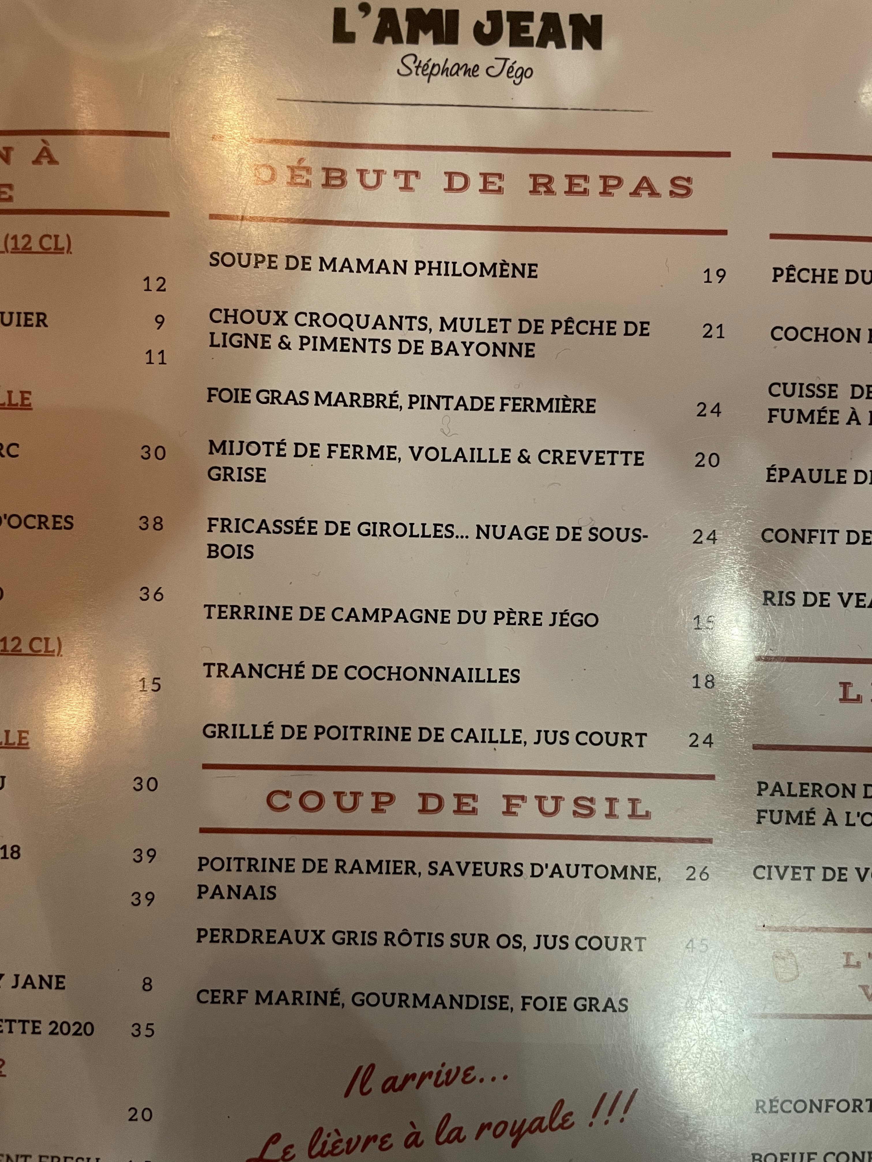 Retrouver l’Ami Jean après une (trop) longue période où je n’ai pas pu y aller aussi souvent qu’avant, a été un vrai bonheur. Un grand merci à Stéphane et sa brigade, qui nous ont régalés avec des produits d’exception cuisinés avec générosité et talent. Sans oublier l’équipe en salle qui nous offre un accueil et un service de qualité. L’ami Jean, une vraie très belle adresse parisienne.