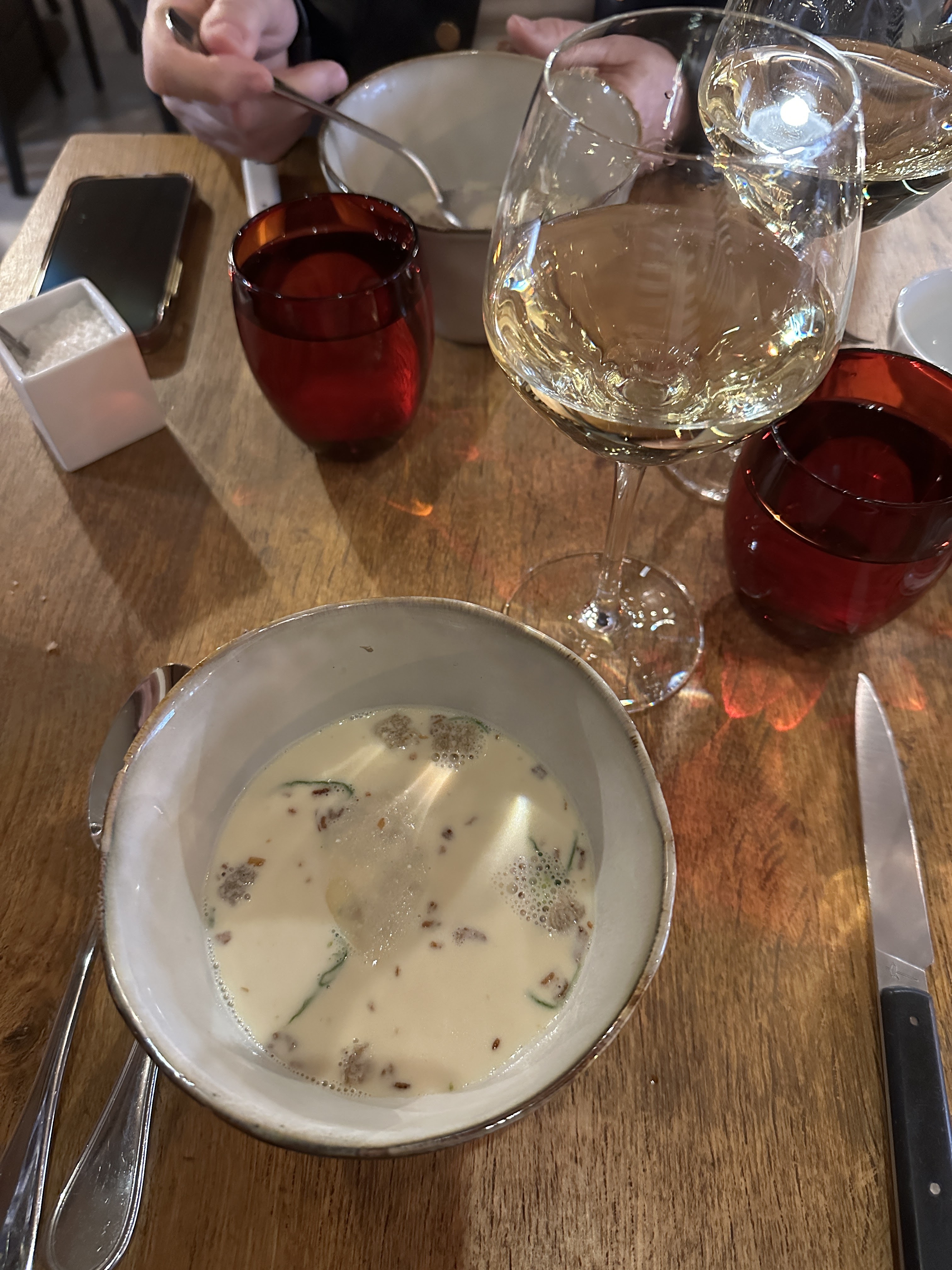 Ce restaurant propose une cuisine bonne, mais ne mérite pas toutes les critiques élogieuses qu'il reçoit sur la base de notre expérience. Le personnel était très gentil et l'ambiance était très française, mais la nourriture était décevante à part la soupe au parmesan. Il y a de meilleurs bistros dans la région qui ont une atmosphère tout aussi merveilleuse et une meilleure nourriture. J'habite à Paris mais si vous êtes ici pour une courte période, je ne passerais pas une soirée ici.