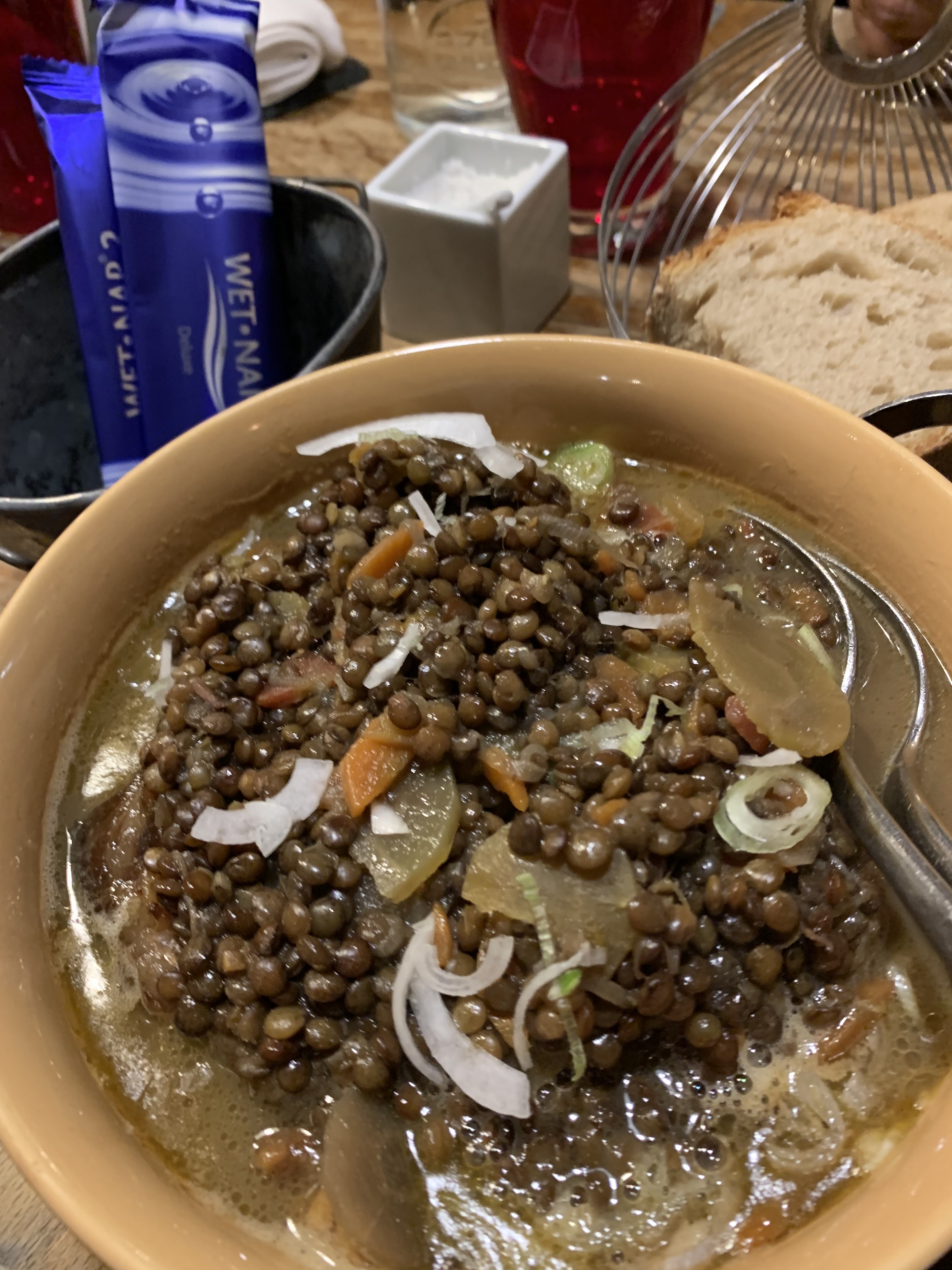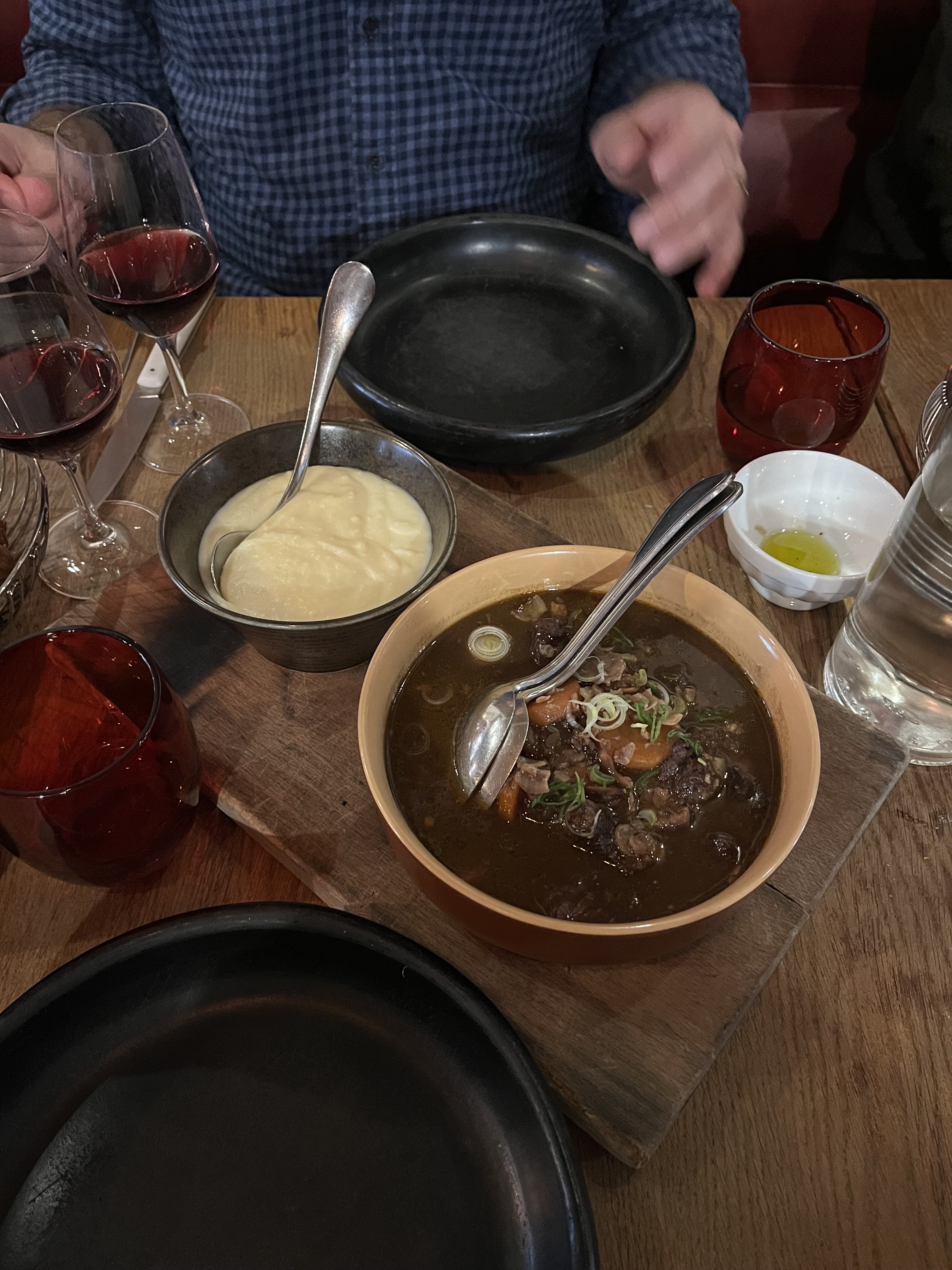 Certains collègues m'ont dit d'y aller, ils ont dit que ce serait des tables minuscules et petites bondées. C'est cher mais ça vaut le coup. Tant que vous êtes heureux d’être sur une « table partagée » et que vous êtes conscient qu’il ne s’agit pas d’une cuisine raffinée, c’est l’endroit où aller. Personnel adorable qui nous a aidé avec le menu, les recommandations de notre serveuse étaient pertinentes. Les meilleures entrées de risotto et de soupe à l'oignon que j'ai jamais mangées, même si elles étaient énormes. Nous avons commandé de l'épaule d'agneau qui a pris feu et suffisait à nourrir tout le restaurant. J'aurais aimé que nous n'ayons pas commandé autant de nourriture car nous ne pouvions rien finir et ne pouvions pas apprécier la viande autant que nous étions presque rassasiés dès les entrées. J'y retournerai certainement, mais commandez moins de nourriture et faites plutôt plusieurs visites pour pouvoir essayer davantage de leur nourriture. Super expérience dans l’ensemble !