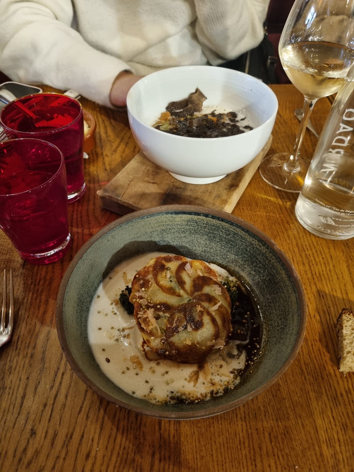 Rallye de bons petits plats copieux pour l'hiver et très bien servis et présentés ! Il y avait le chevreuil bourgouignon avec l'entrée de champignons et d'œufs marinés et de formidables crozes hermitage pour l'arroser. Le dessert était une crème vanille poire-pomme tout aussi bonne et je l'ai accompagné d'un digestif à la clémentine. Belle expérience.