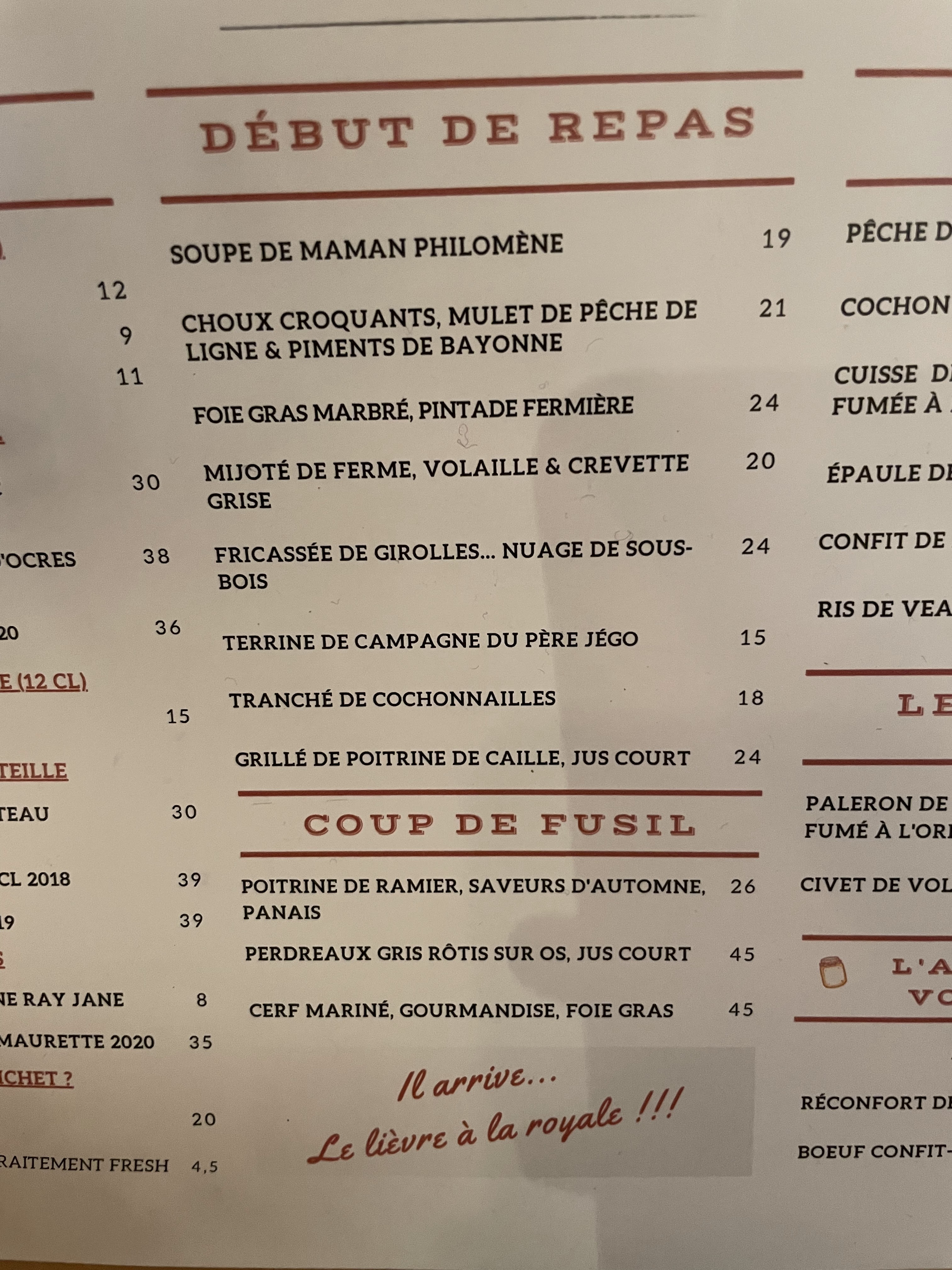 Deuxième repas ici et nous sommes ravis d'avoir tenu à revenir. Endroit charmant avec le chef passionné (Jean, vraisemblablement) qui prépare chaque plat qui sort. Nous n’avons pas pu finir l’énorme brique de pâté, et le serveur nous a gentiment proposé de la préparer pour emporter, ce que je n’aurais pas osé demander de peur de les offenser ! Le lièvre était énorme, même pour deux d'entre nous, et exquis, et l'énorme cuillerée de riz au lait était exactement comme je me souvenais.