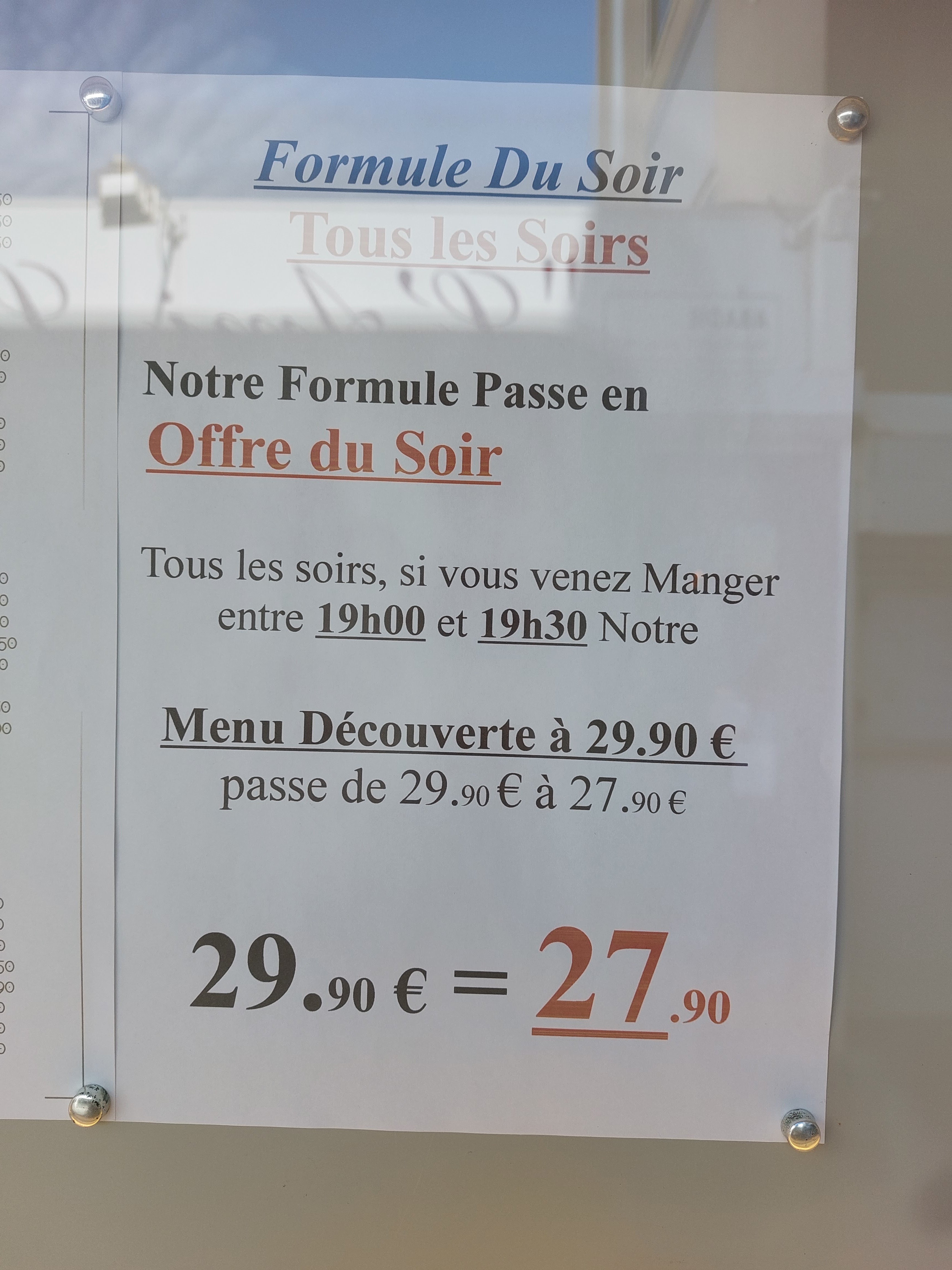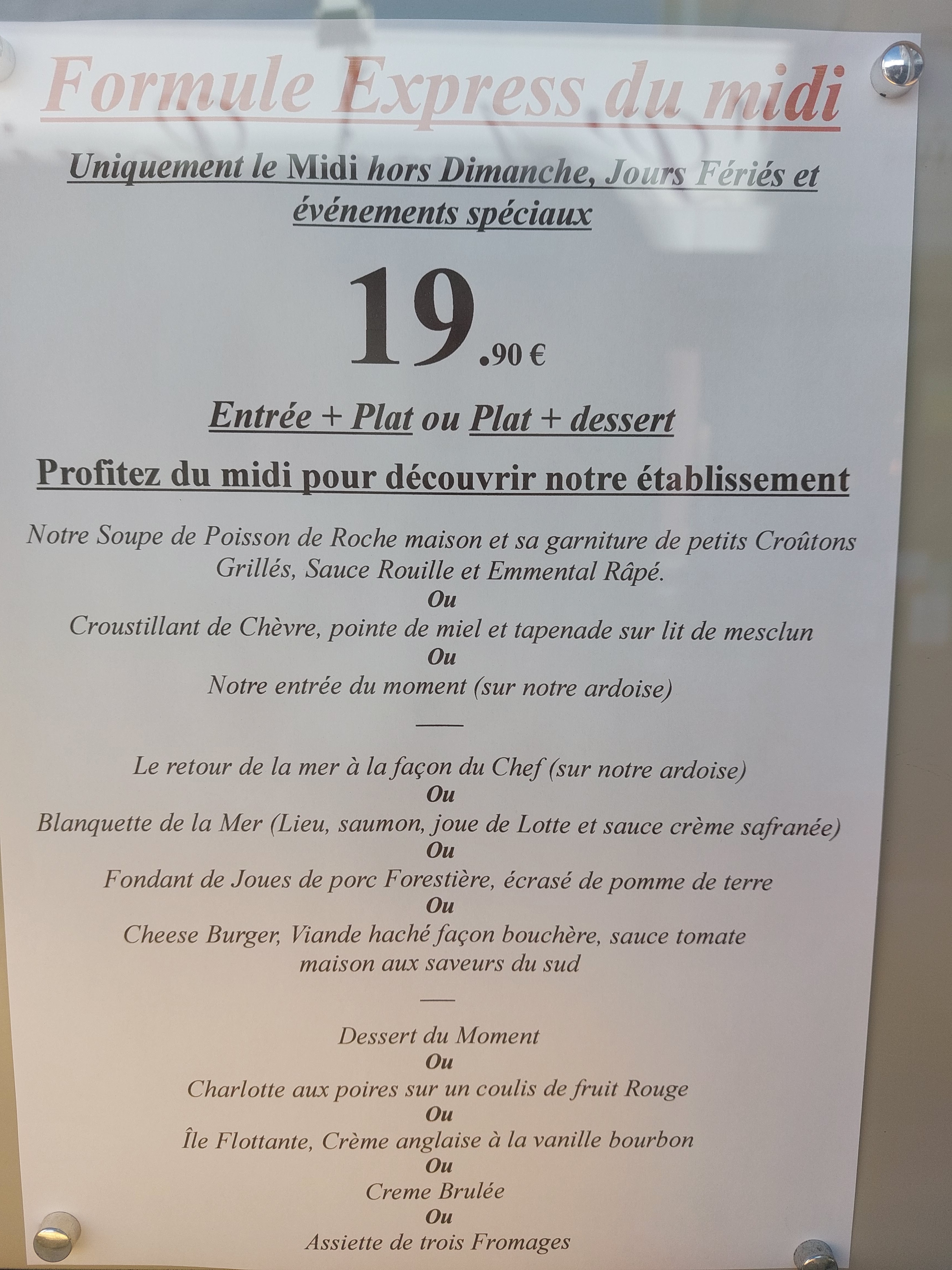 Excellente cuisine et copieux. Menu express midi est à 19.90€ (entrée +plat) et celui du soir à 27.90€
