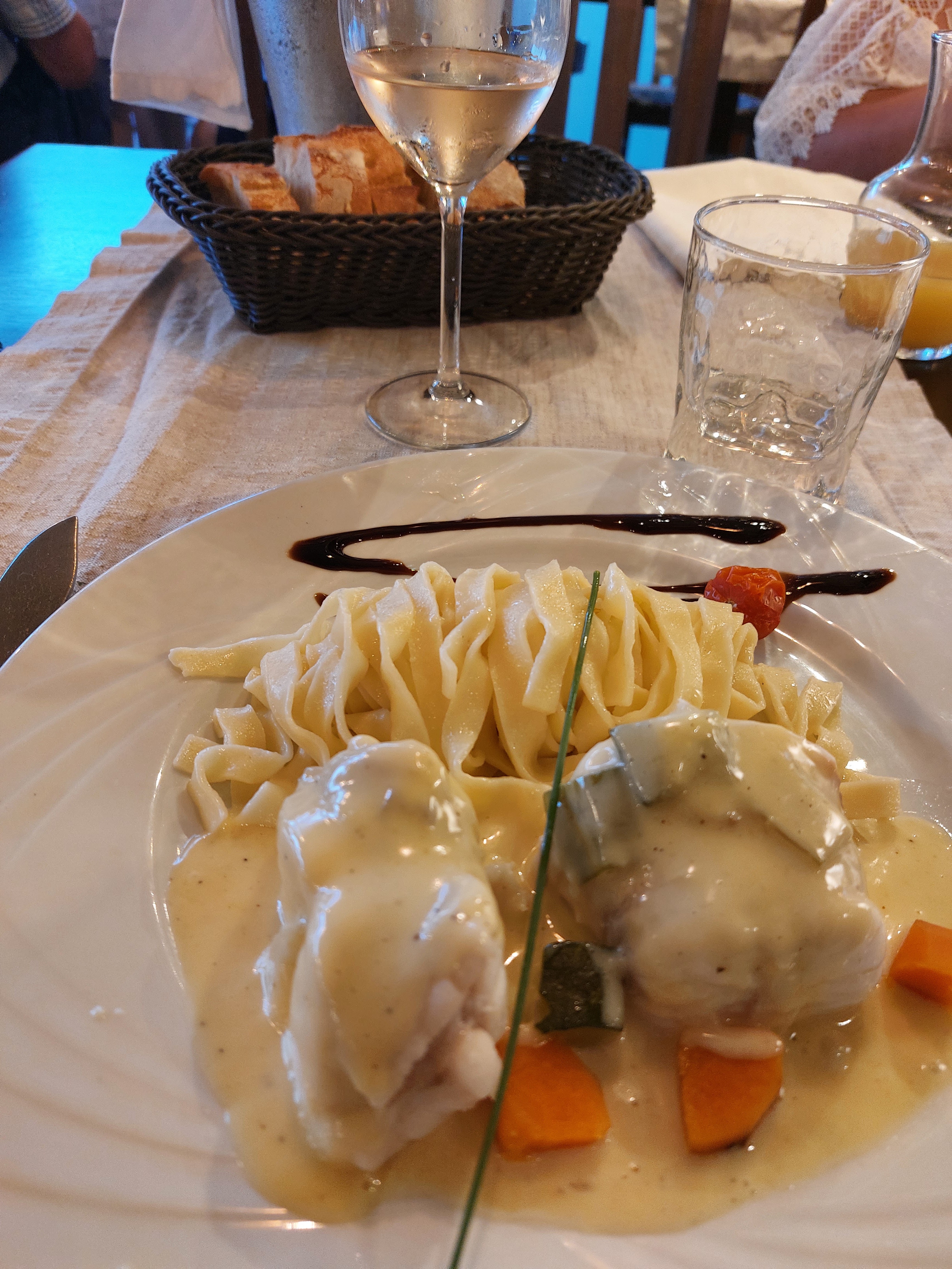 La cuisine est très bonne dans l'ensemble. La soupe de poisson gagnerait à être réduite pour gagner en goût et concentrer les saveurs de la mer. Les accompagnements sont très bons : rouille, croutons, râpé. Le plat de poisson et tagliatelles, rien à dire. Le dessert (île flottante) la crème anglaise un peu liquide à mon avis, il faudrait pousser davantage la cuisson à la nappe afin de gagner en onctuosité. Un bémol : le vin blanc est arrivé à la fin du repas, dommage, dû à un problème d'organisation entre les serveurs/euses. Je conseille ce restaurant.
