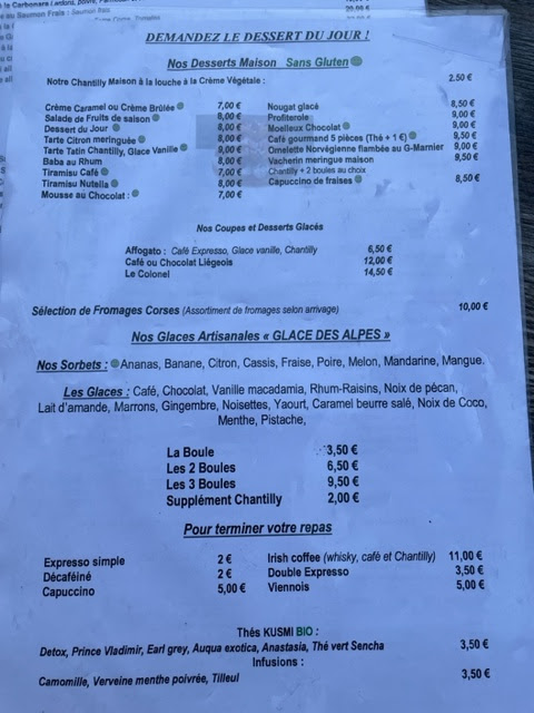 Les moules sont excellentes mais le service est très très long. Certainement parce que nous sommes des pinzutu … Les glaces sont restées 10 minutes sur le passe avant de nous être emmenés donc fondu et le café froid … bref