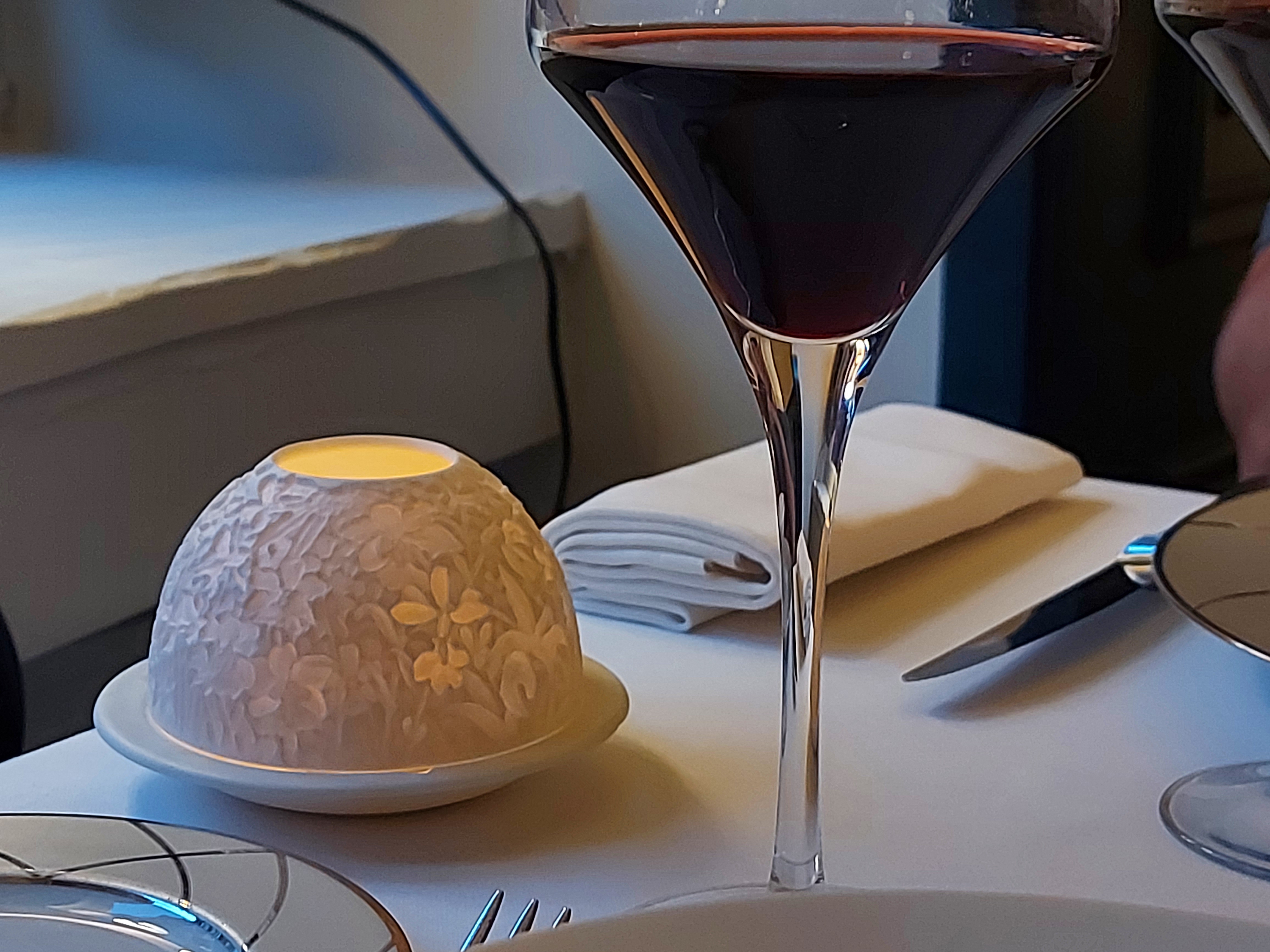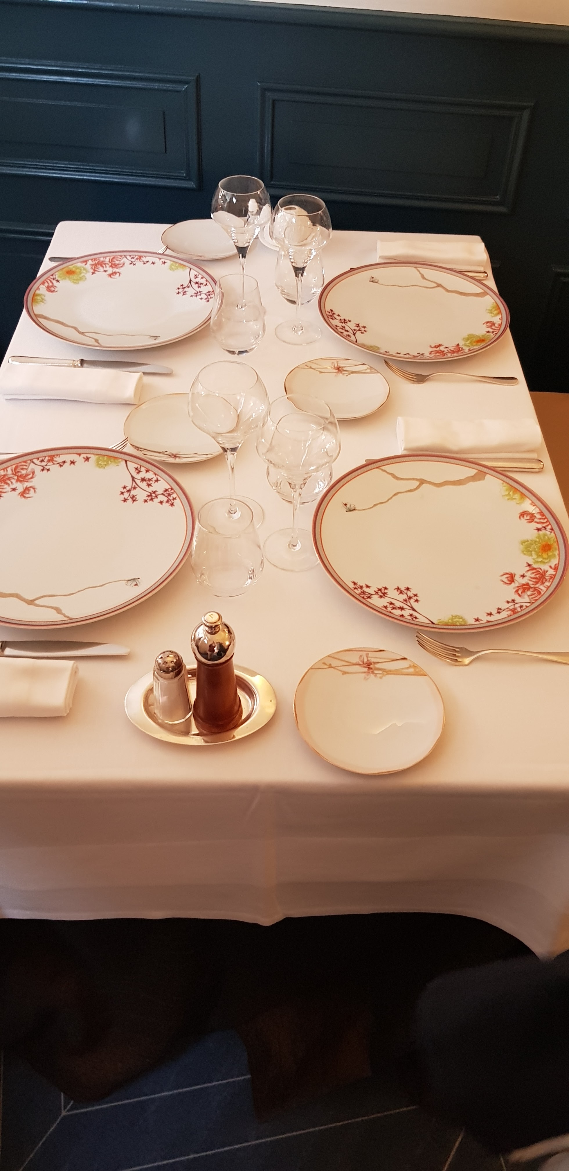 Cadre agréable, mais un peu désuet...très jolies porcelaines, originales et de très bon gout. la serveuse est très professionnelle, peut être un peu trop, ne laissant transparaitre aucun plaisir a se trouver là et a faire partager ce qu'il y a dans l'assiette. Nous avons pris un apéritif, deux bouteilles de très bons vins et le menu a 68€. les amuses bouche et l'écume de panais a la truffe étaient très bon. le demi homard trop cuit et minimaliste nous a surpris. le ris de veau et le pigeon étaient a la hauteur,personnellement, j'avais pris le ris de veau et je ne regrette pas. par contre la pomme d'amour...biscuit sec et pas du jour a été une vraie déception...comme les digestifs de poires (un nectar délicieux) demandé qui nous ont été servis a dose prescrite, sans bavure et donc qui paraissaient bien mesquines en laissant une note de 360 euros. Accompagnée de mon ami sommelier pour de grande maison française, nous avons eu le même constat. je ne regrette pas d'avoir payé, je regrette juste ces petits détails qui feront que je ne ferai pas de deuxième voyage.