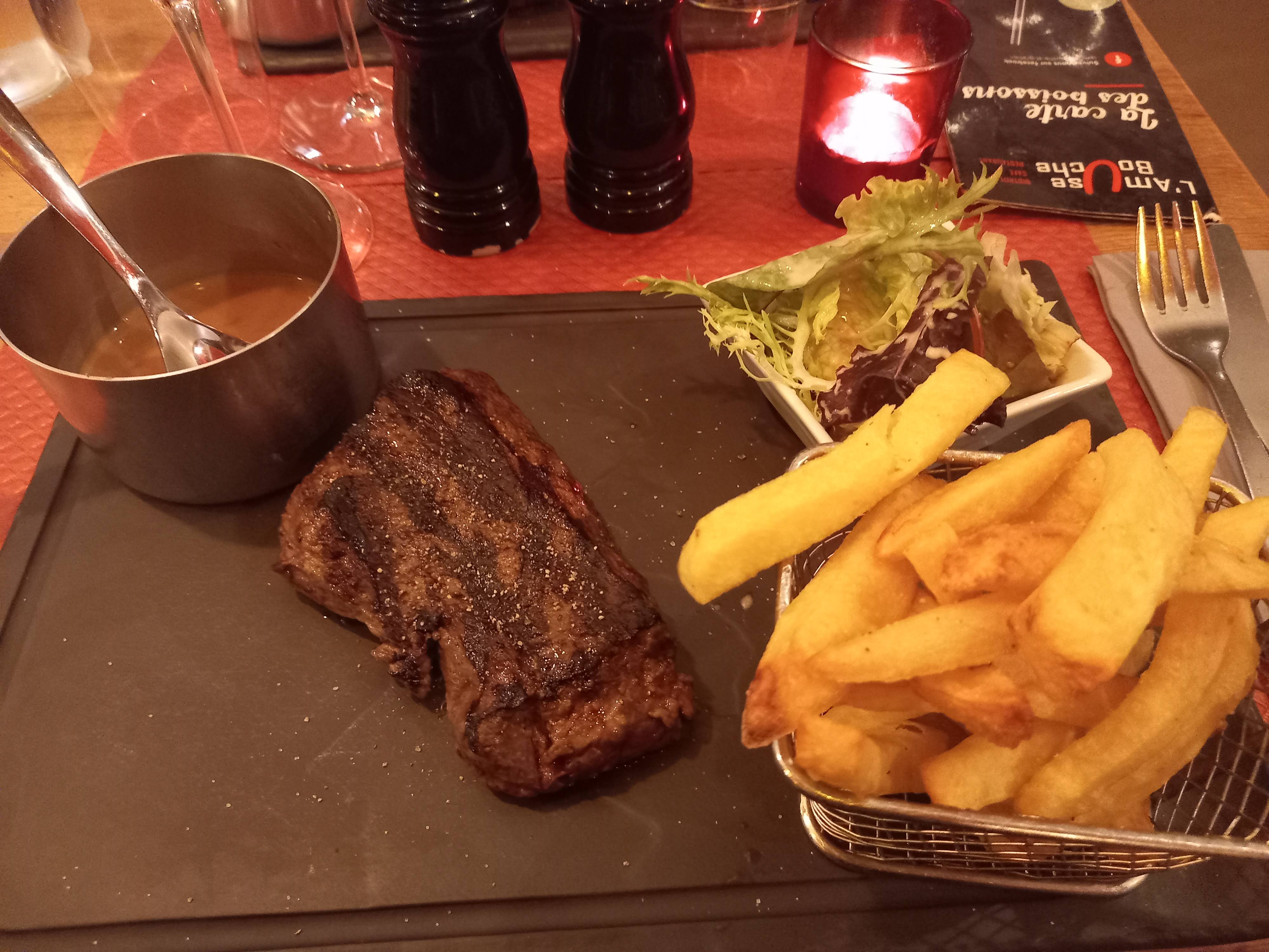 Une tarte aux poireaux dont on ne sent pas le goût du poireau. Un goût sucré dans la bouche auquel je ne m'attendait pas de la part d'une entrée. Ensuite, une entrecote frites honnête.