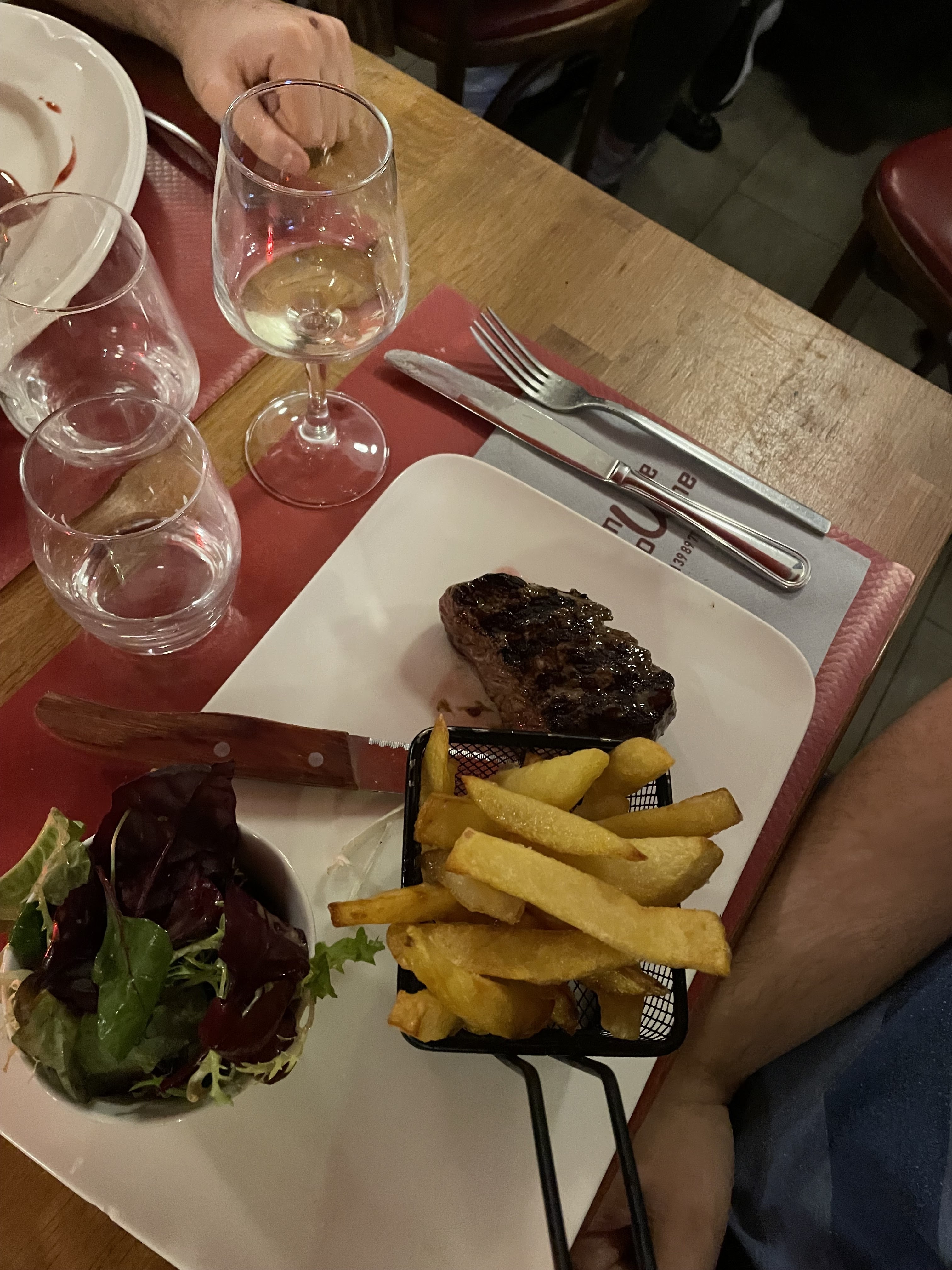 Bonne ambiance, personnel aimable et rapide, bonne musique assez gaie ( et pas cassé oreille !) . Entrées sortant de l'ordinaire et peu chères, steaks tartares préparés piquants excellents, un petit rosé ! Une excellente soirée entre copines et en terrasse ! A refaire !