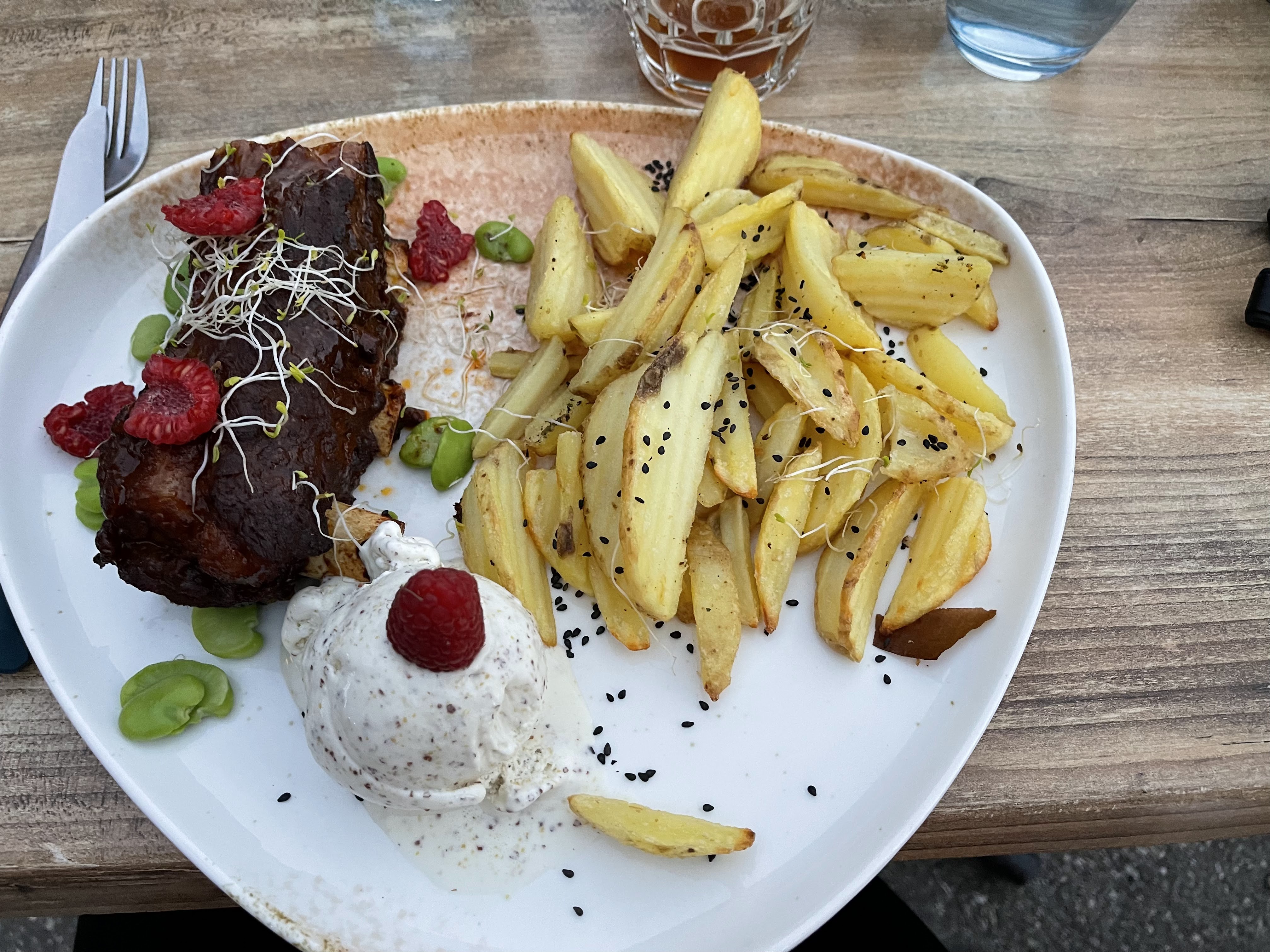 Terriblement excellent ! J'ai déguste un poulet au curry avec son riz basmati... Je me suis littéralement jetée dessus tellement ça sentait bon... Même pas pensée à prendre une photo de l'assiette. Mais c'est véritablement aussi bon que beau ! Mes voisins de tables ont eux pris une salade de chèvres avec 4 vrai morceau de chèvres différent, absolument délicieux de leur dires. Bref un petit lieux bien sympathique chaleureux, simple avec une cuisine généreuse, avec des produits locaux de qualité et surtout savoureuse. J'y retournerai avec plaisir si je repasse dans le coin. . Ps : la veille on as pris une petite coupe de glace sur la terrasse bien tranquille c'était chouette aussi !