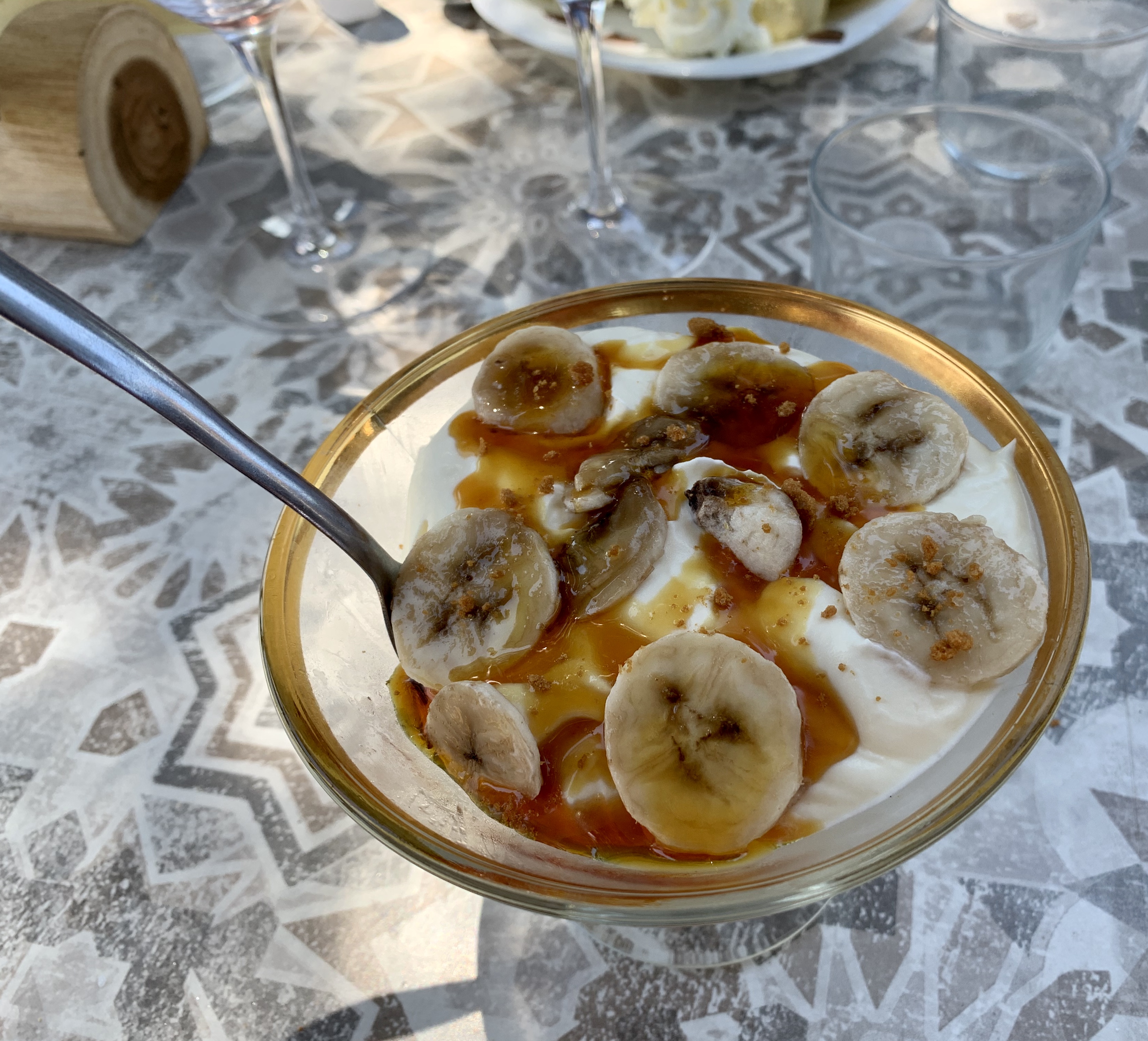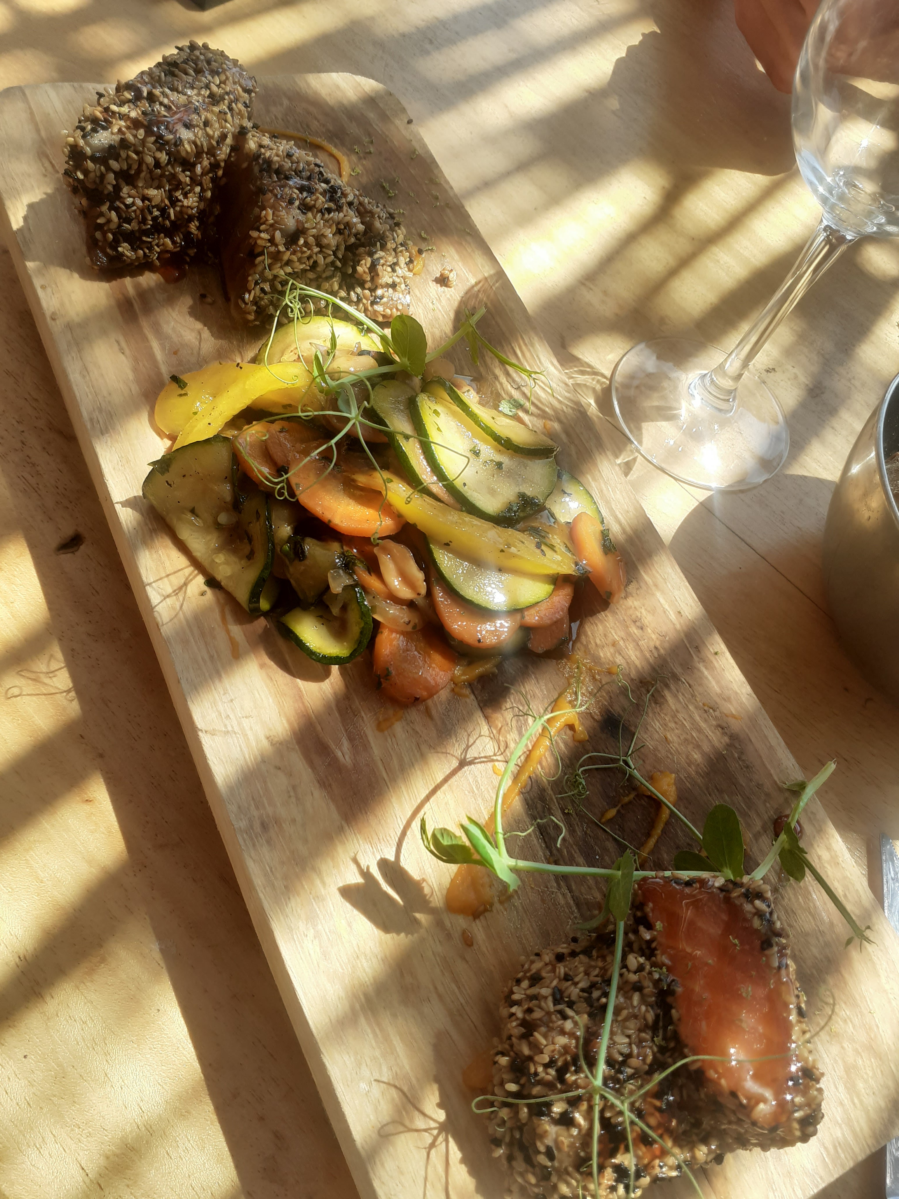 Nous sommes arrivés, je fais mon choix, ce sera une côte de bœuf angus maturée. Je sens déjà mes papilles se mettre au garde à vous lorsque l’on apprend qu’en ce moment il n’y a que des tapas… Grosse déception, très grosse même mais on se laisse aller pour les tapas. C’est alors que venu d’on ne sait où, sans prévenir, les tapas sont arrivés devant nous avec des saveurs, du goût. Un mélange incroyable qui m’a fait oublié ma cote de bœuf qui m’avait pourtant fait saliver. Un déluge de saveurs, je pèse mes mots. Nous nous sommes régalés comme rarement. Patatas bravas, Camenbert rôti, ceviche de cabillaud (une tuerie), poulet crispy (une tuerie avec sa sauce), et le humouss. Je vous parle des dessert ? Je n’ai pas eu le temps de me remettre de mes émotions que le dessert nous est servi : pavlova qui vient couronner le tout. Le repas parfait !! Félicitations aux cuisiniers ! J’ai dit cuisinier ? J’aurai du dire magicien. Si vous regardez mes différents avis, vous verrez que je ne suis habituellement pas tendre mais ici rien à redire. Si, une chose ; juste merci ! Bilan : 83€ pour trois personnes avec boissons et dessert. C’est plus que raisonnable vu le bonheur servi dans les assiettes. Je recommande mille fois. En tout cas nous revenons cet été, on fera le match retour. Le cadre est superbe.