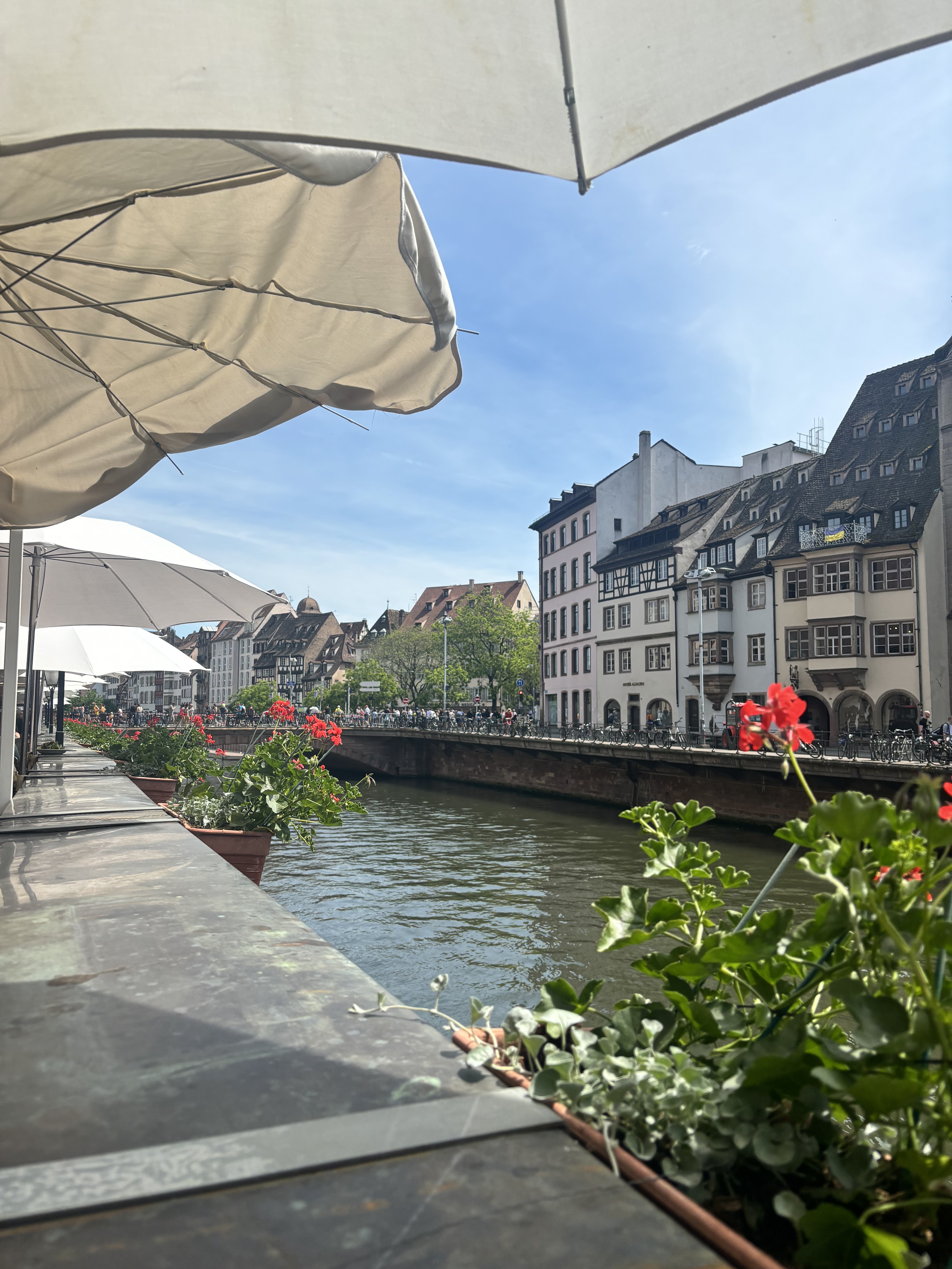 Très bonnes flammekueches, pas très chères au regard de la quantité et de la qualité de celles-ci, il y avait d'autres plats qui m'ont mis l'eau à la bouche lorsque j'ai vu passé les assiettes des autres clients, mais on ne peut pas tout prendre en une seule fois. Tout est traditionnel, mais à part les flamms (10-13 euros environ), les prix des autres plats sont de l'ordre de 20 euros environ, les desserts sont très chers (8 euros pour une crème brûlée minuscule), il y a également beaucoup de monde et la promiscuité entre les clients est très forte, (moins de 50 cm entre chaque table en terrasse), à l'intérieur il y a généralement plus d'espace et il fait plus frais. Bref, je recommande grandement ce restaurant à tous les amateurs de la bonne cuisine alsacienne idéalement placé au bord de l'ill et à 5 minutes de la cathédrale.