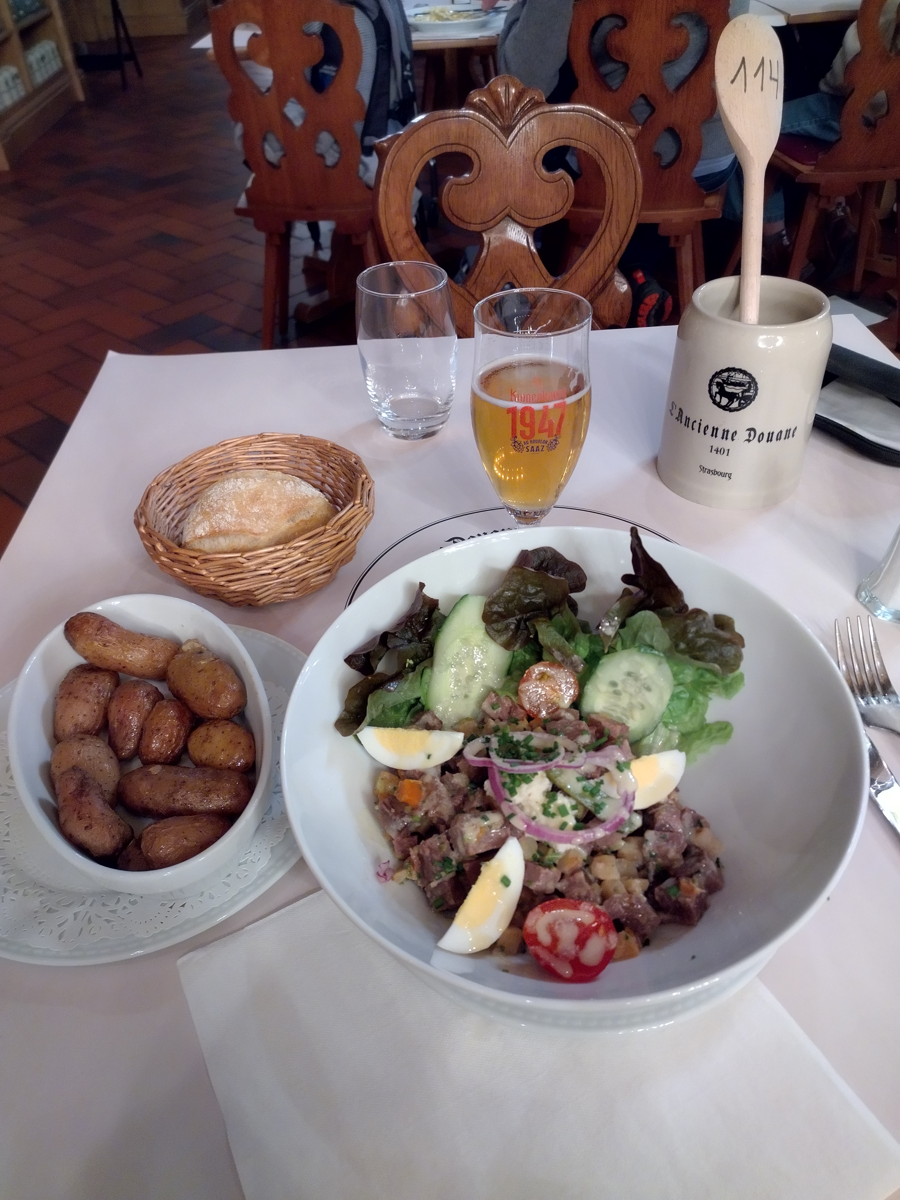 Ce restaurant a une image de restaurant gastronomique alsacien mais rien de tout cela. D’abord nous avons attendu bien 20 minutes pour prendre la commande de nos boissons pendant qu’un serveur râlait, nous pointait du doigt et discutait de notre table avec ses collègues ; un fois la boisson commandée (coca en canette) je reçois un verre de coca qui contenait peut être la moitié d’une canette de plus un autre coca normal que nous commandé arriva sous la forme d’un coca zéro en même tant que le serveur nous annonce que le coca « en canette » est en réalité un coca de bouteille d’1L bref je ne vais pas rester plus longtemps sur ce sujet. On commande et on reçoit enfin nos repas quand je remarque que les quantités y sont minime (4 feuilles de salade et une tomate sèche avec une cuillère de sauce à la crème ) et une soupe à aussi été reçu sans cuillère. Sinon l’ambiance et le décors sont les uniques points forts de ce restaurant. Un autre problème est à signalé, je trouve personnellement que l’odeur des toilettes pendant le repas est un petit peu désagréable. L’organisation et l’intention des serveurs est à revoir. Je vais aussi noté que le confort des banquettes et des chaises est bof (j’ai eu mal pendant tout le repas. Donc ma note est peu être sévère mais merci de remettre ce magnifique restaurant sur le destin qu’il mérite; merci de votre compréhension.
