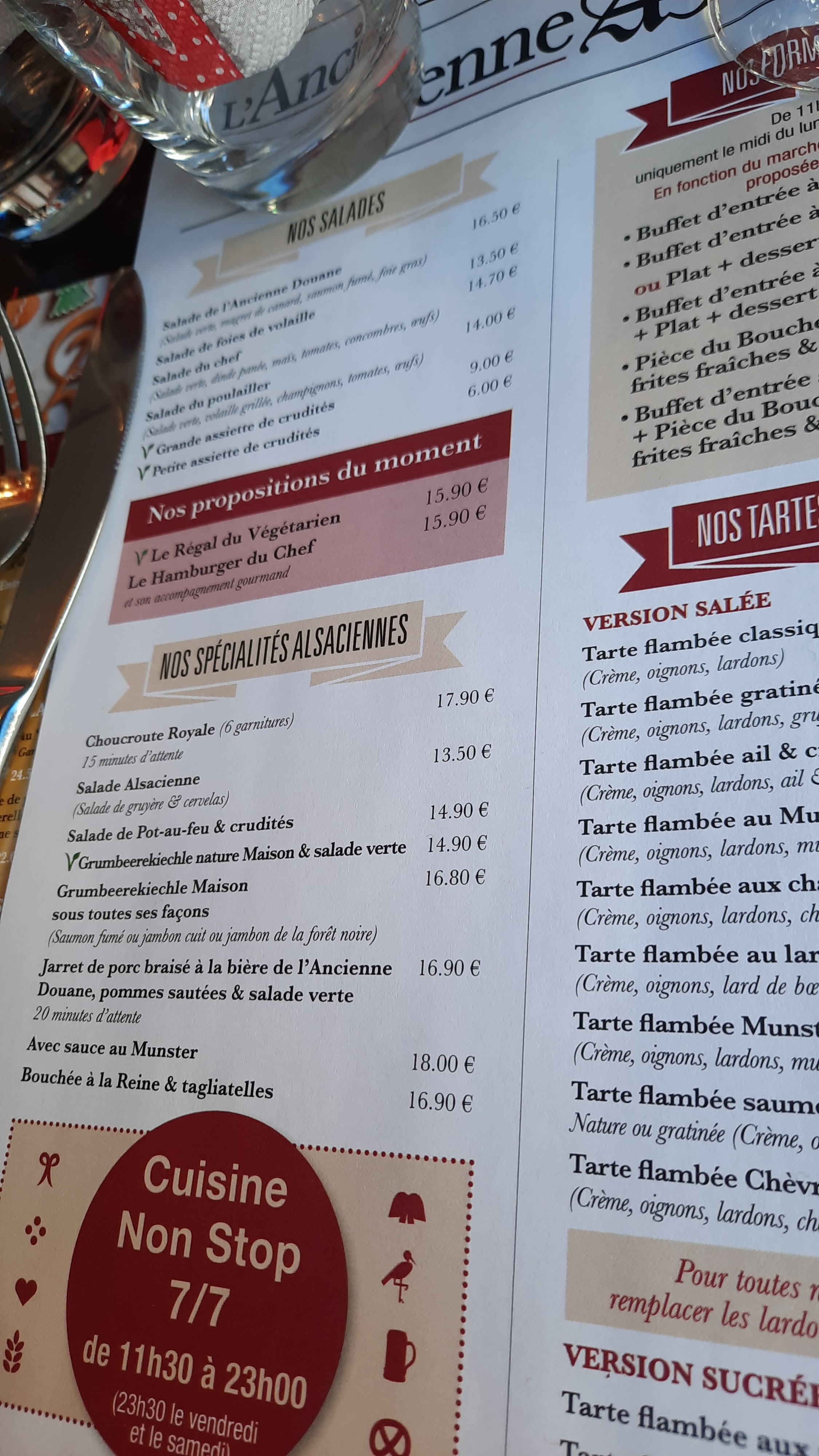 Grumbeerkiechle. Est-ce que vous savez comment prononcer ça ? Pas besoin de continuer à lire, vous connaissez déjà sans doute ce restaurant. Pour les autres, si vous voulez manger alsacien dans une ambiance pub vous êtes à la bonne adresse. Le personnel est très agréable et parle aussi bien français qu'anglais ou allemand. Il y a des plats pour tous, aussi bien pour les petits appétits (je pense au flammekueche) que pour les plus gros (qui a dit jarret?). Pareil pour les desserts, attendez vous a du copieux, et a une touche adulte pour certains. Il n'y a honnêtement pas de mauvais choix a l'ancienne douane. Essayez de réserver de préférence car votre place n'est pas garantie surtout a midi.