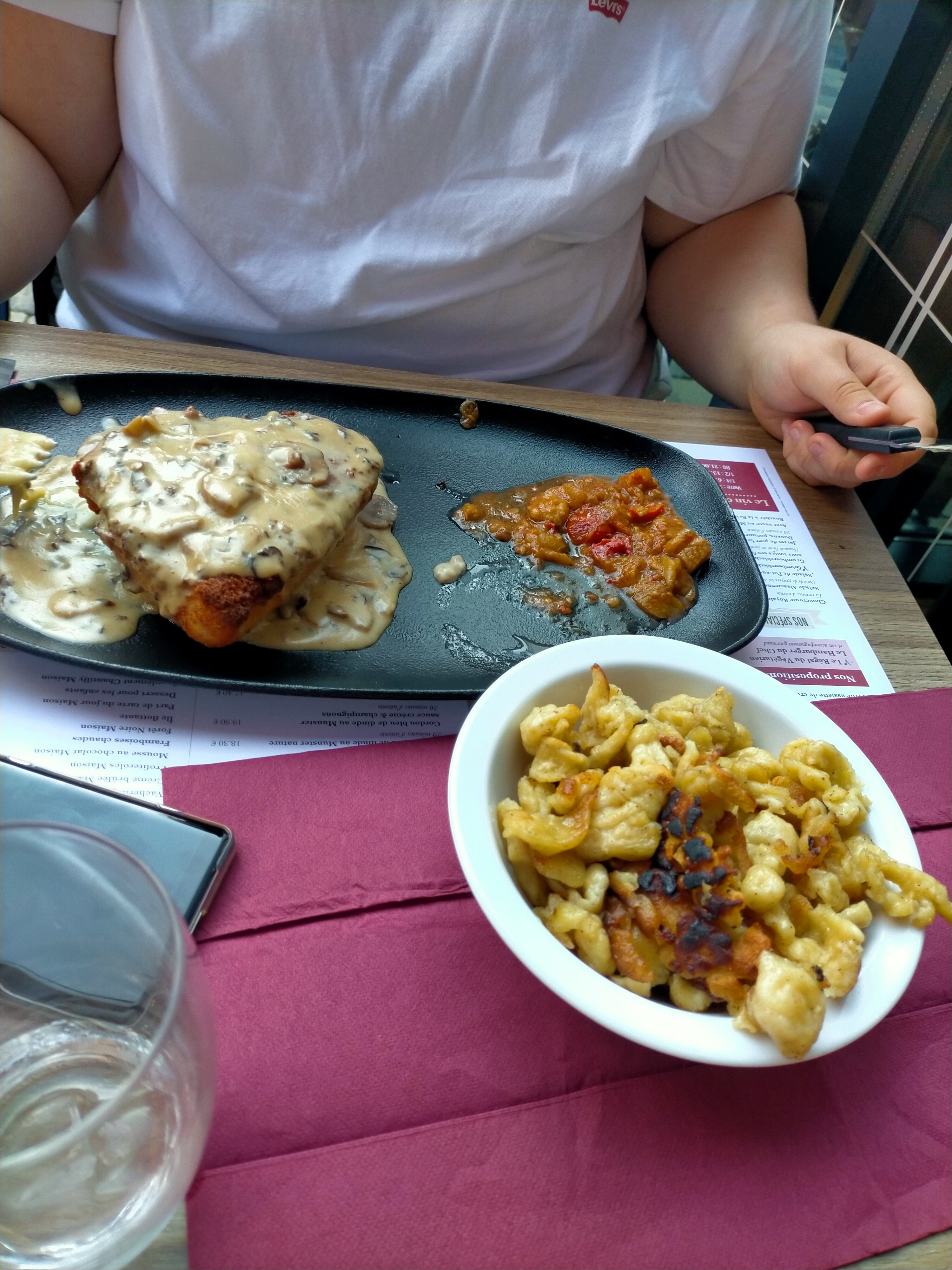 Très bonne cuisine, d'ailleurs assez étonnant pour un restaurant dans une zone commerciale de cette trempe. Tartes flambées loin d'être mauvaises (mais je suis exigent), les viandes rouges étaient bonnes et cuites correctement, les cordons bleus et jarrets conséquents. Possibilité de choisir sa garniture (spaetzle, frites, légumes, purée), d'ailleurs la petite purée était très bonne et innovante. Le cadre est ce qu'il est : terrasse avec vu sur l'air de jeux pour enfants, pratiques pour les uns, embêtant pour les autres.