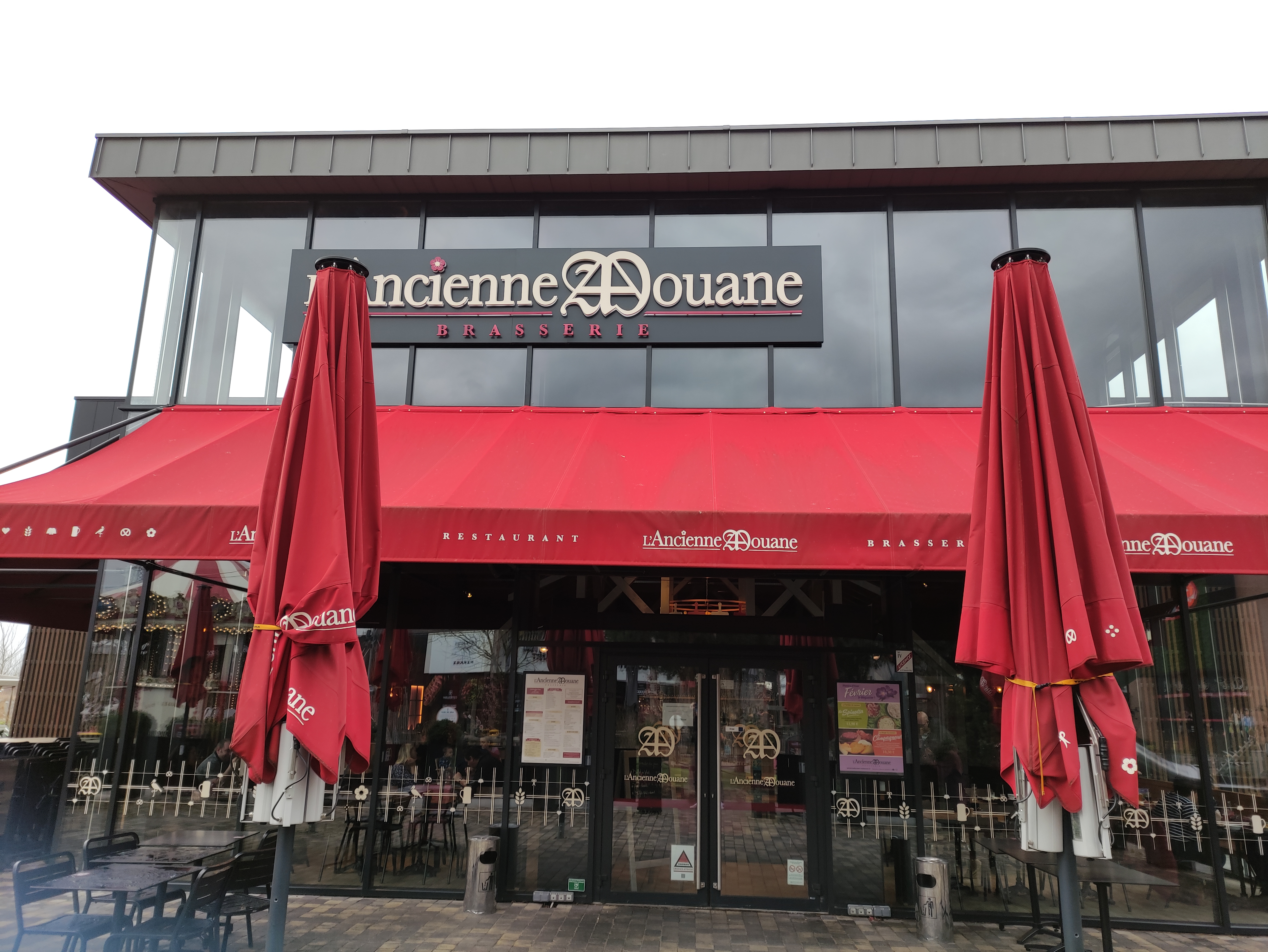 Ambiance brasserie. L'ancienne Douane est bien connue des Alsaciens depuis des années. Son récent restaurant au Shopping Village de Reichtett/Vendenheim est à la hauteur de la réputation de la marque. 4☆ au lieu de 5 sur la cuisine en raison d'une assiette (la mienne) où les nuggets de poulets étaient tellement secs que j'ai manqué de m'étouffer par 3 fois(je n'ai aucun problème de déglutition ni alimentaire usuellement), j'ai donc abandonné de les consommer (la photo de cette assiette ne sera donc pas diffusée afin d'éviter les méprises). Une autre personne de la table les a goûté et a rencontré les mêmes difficultés. De plus la salade d'accompagnement de cette assiette n'était pas fraîche. Bref cette assiette là est a éviter. La tarte flambée provençale,idée originale, était, par contre, vraiment excellente, j'aurai dû en prendre également comme plat, tellement c'était bon. Le reste des assiettes ont également été un regal (photos jointes au post) : onglet cuit idéalement et fondant, la salade de pot au feu excellente également. Le café gourmand : un délice. Le tout bien servi. Les boissons et le service parfaits : accueil, service tout bien à sa place et avec gentillesse et professionnalisme. Les locaux sont propres et bien entretenus malgré le monde et la rotation. Handicap : le fauteuil a pu être installé sans difficulté à la table. L'entrée, les toilettes sont adaptés parfaitement. Là également, le service a été parfait et attentionné. Le cadre est agréable et chaleureux. Nous sommes arrivés au restaurant en plein coup de feu un samedi de we prolongé à 13h (il est très préférable de réserver avant de venir aux heures d'affluence). Certes il y avait du bruit, mais sans excès. Les conversations sont possibles naturellement (un peu plus compliqué pour une personne avec un problème d'audition). Nous sommes répartis vers 15h, et là le restaurant était relativement vide. Son emplacement à côté de la grande roue sur Shopping Village permet également un accès très simple, tant niveau parking qu'au milieu d'un shopping ou d'une promenade sur ce groupement commercial. Des aires jeux d'enfants extérieures sont quasiment devant le restaurant. Et l'ancienne Douane a même pensé à mettre à disposition un coloriage pleine page au dos du set-de-table en papier. Une famille (bébé et petits enfants) table voisine de la notre en bénéficiait. Les enfants semblaient apprécier. Malgré les rotations des services et les divers publics qui se restauraient là aucune gène les uns des autres. Je recommande vivement que l'on soit à Shopping Village pour une ballade, des achats, ou que, comme nous, l'on soit venu expressément pour manger là : l'ancienne Douane devrait vous apporter satisfaction.
