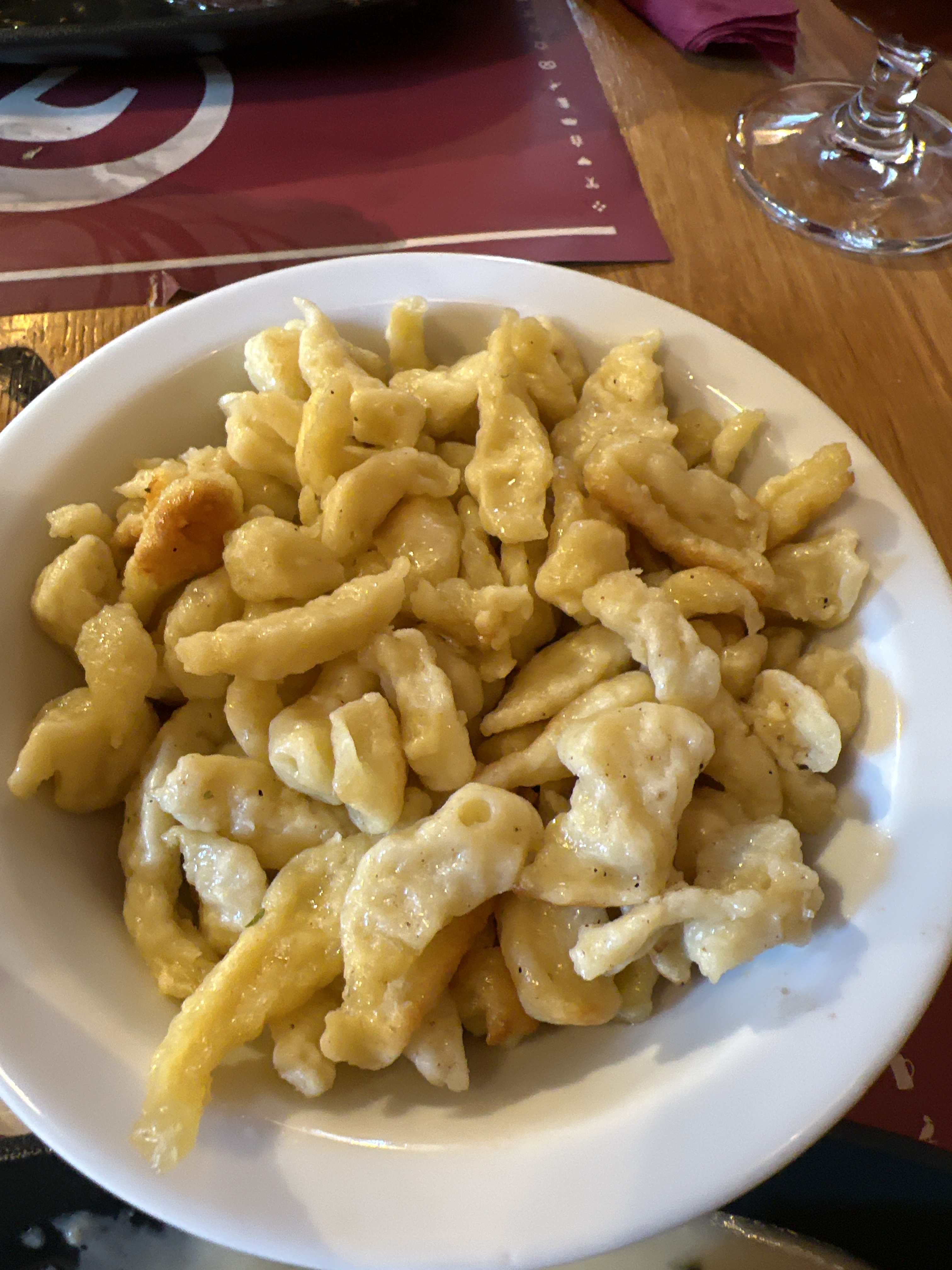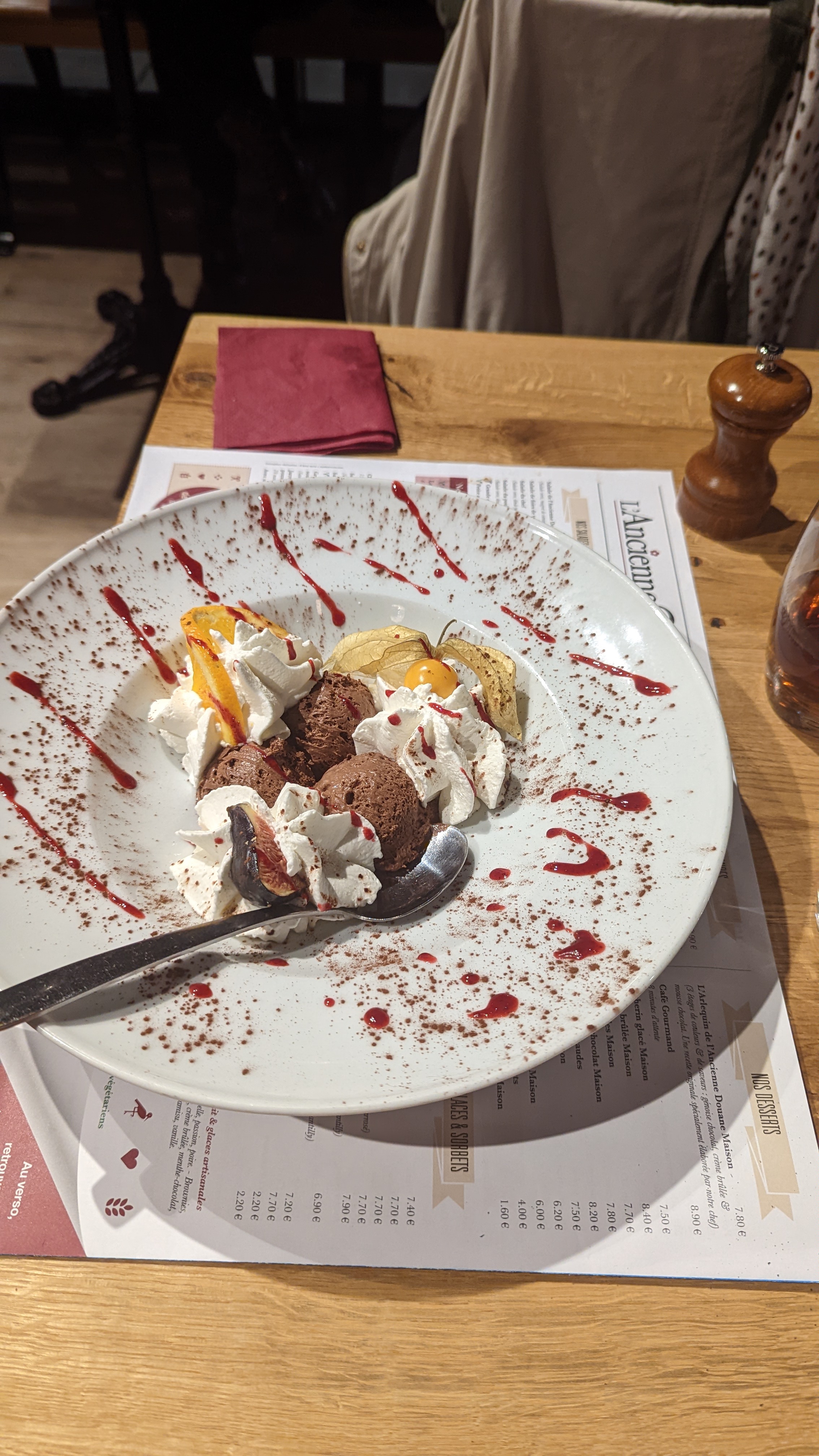 L'ambiance était plutôt bonne, mais si la nourriture est à la traîne, ça deviens assez embêtant !!! L'entrée était une verrine de crevettes/mangue aigre doux...il s'est avéré que c'était un verre à eau et les crevettes étaient moyen tout au mieux. Le plat principal, pièce du boucher sur son lit de.... 🤨🤨🤨Mouais...viande moyenne et 😳😳😳la pauvre cuillère de purée faisait misérable 😤😤😤 heureusement qu'il y avait des spätzle et des frites ! En dessert un vacherin honorable ! J'ai mis 3 et non 2 étoiles car tous ce que j'ai vue autour de nous avait l'air délicieux ! On a peut être juste pas eu de chance !