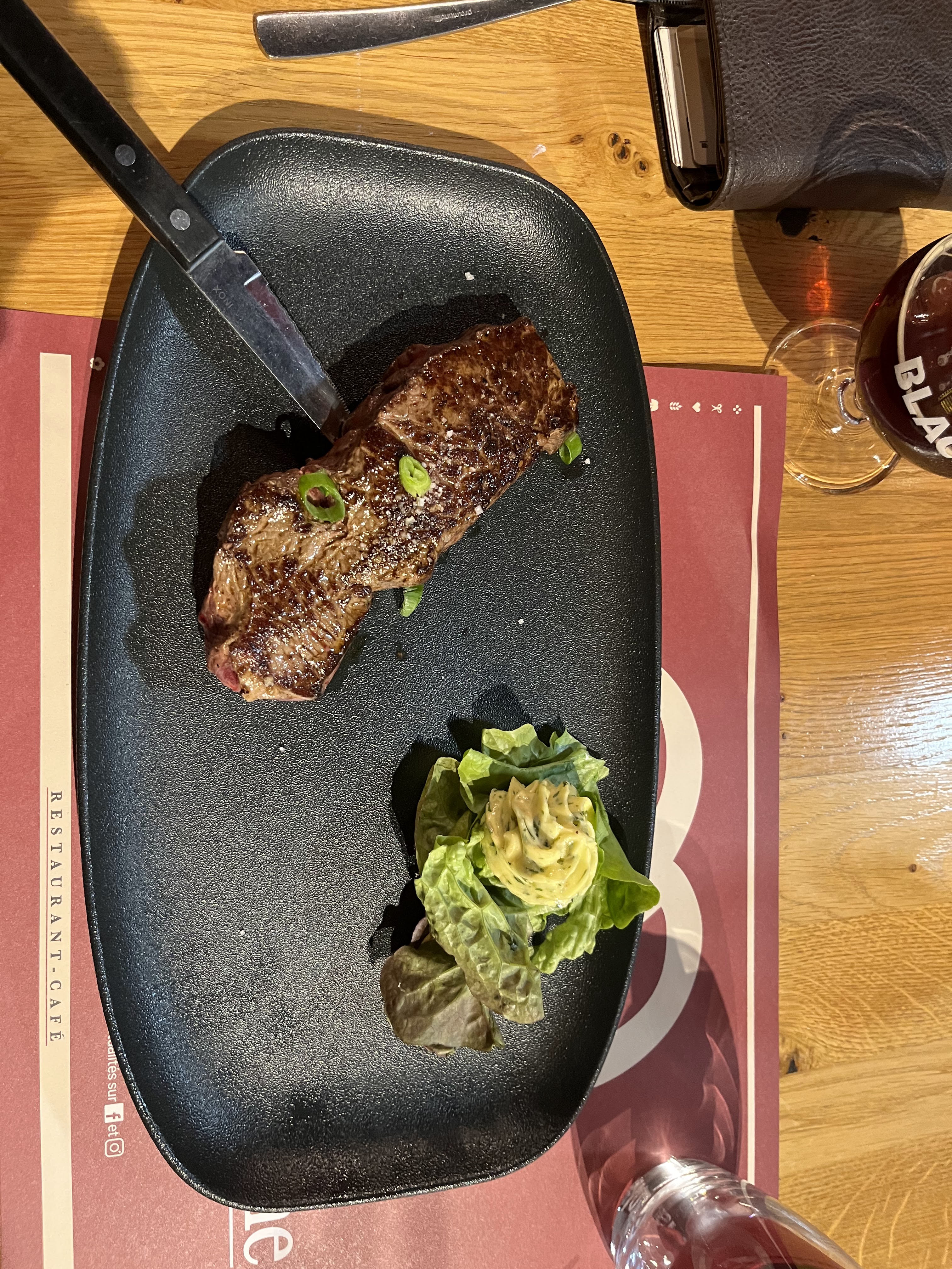 J'ai mangé une bavette en plat de midi elle était très bien cuite mais il devrait juste mettre d'autres couteaux pour les steaks c'était un peu la galère pour couper