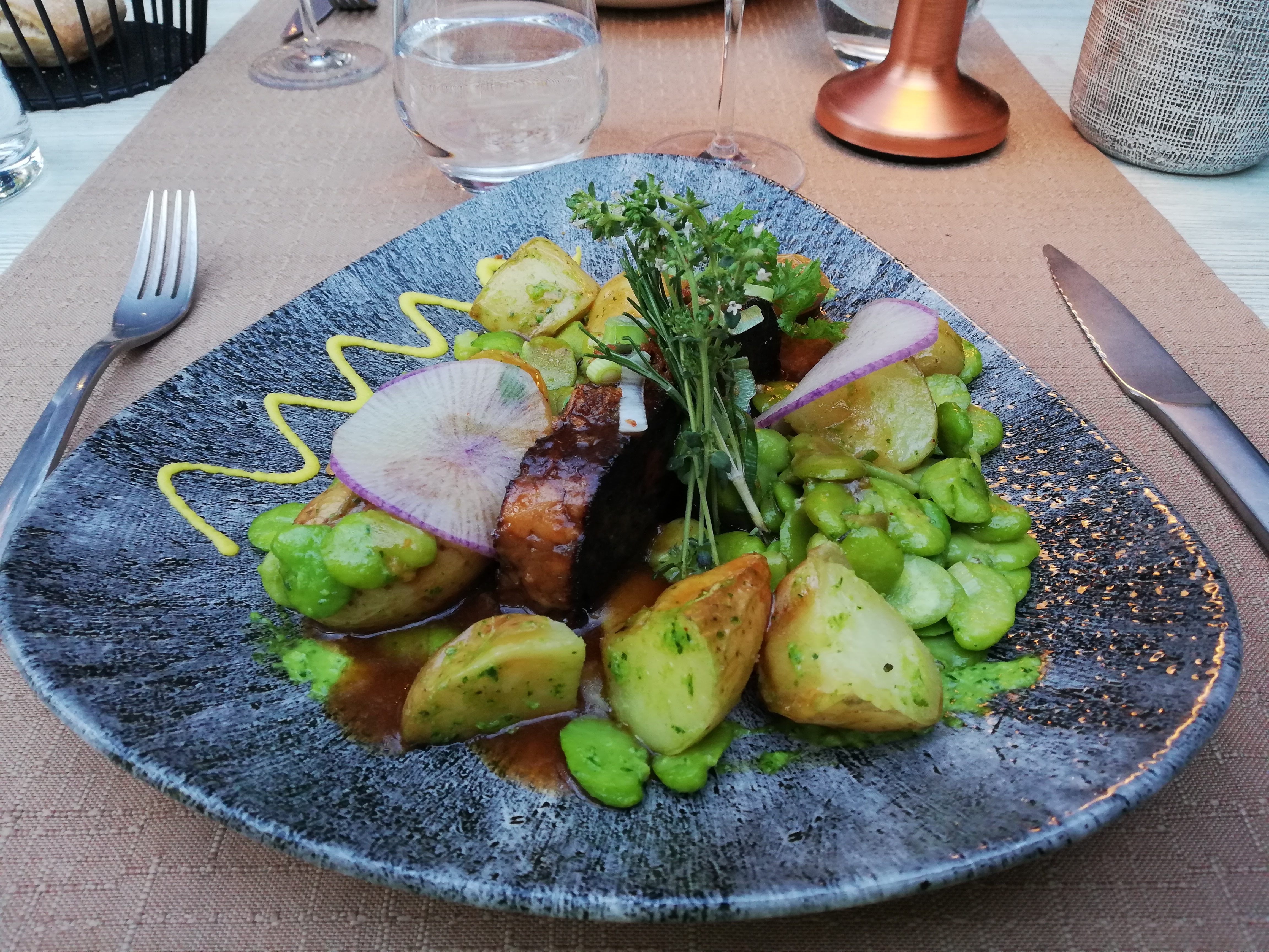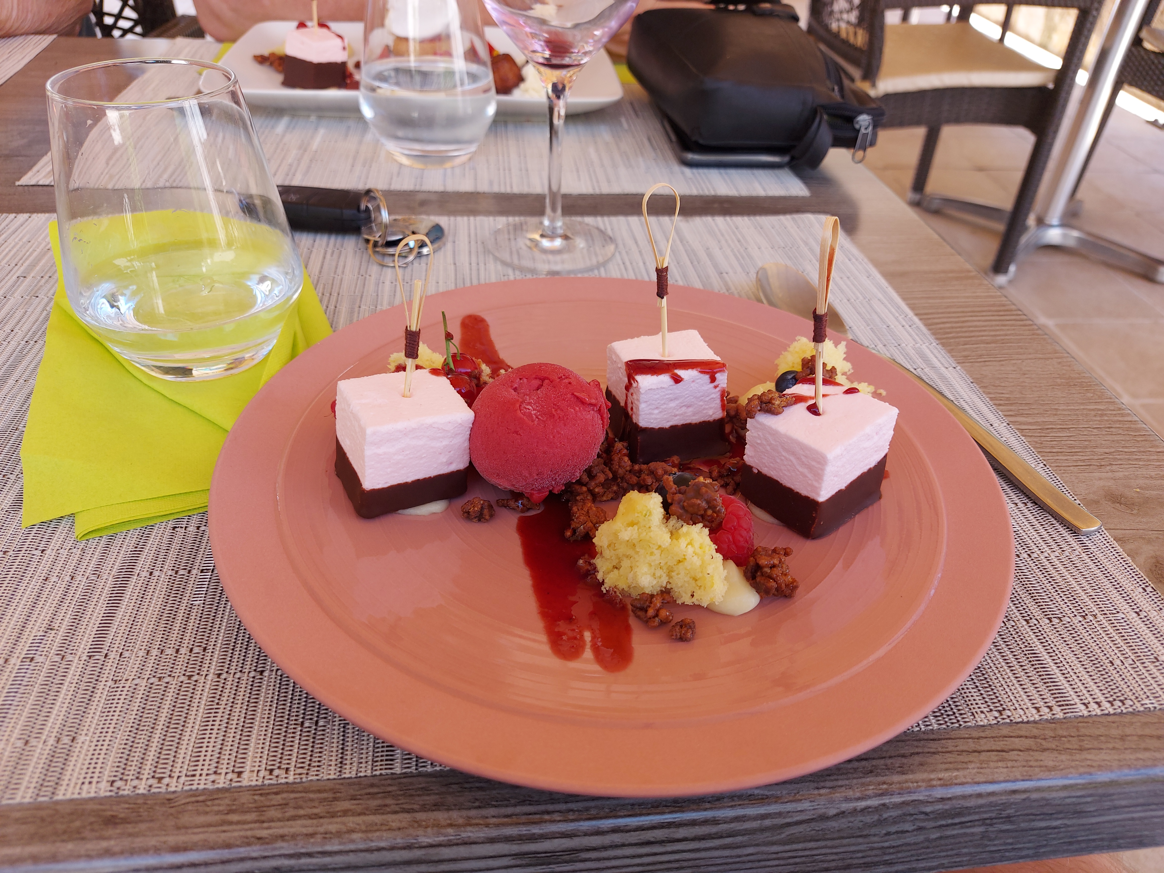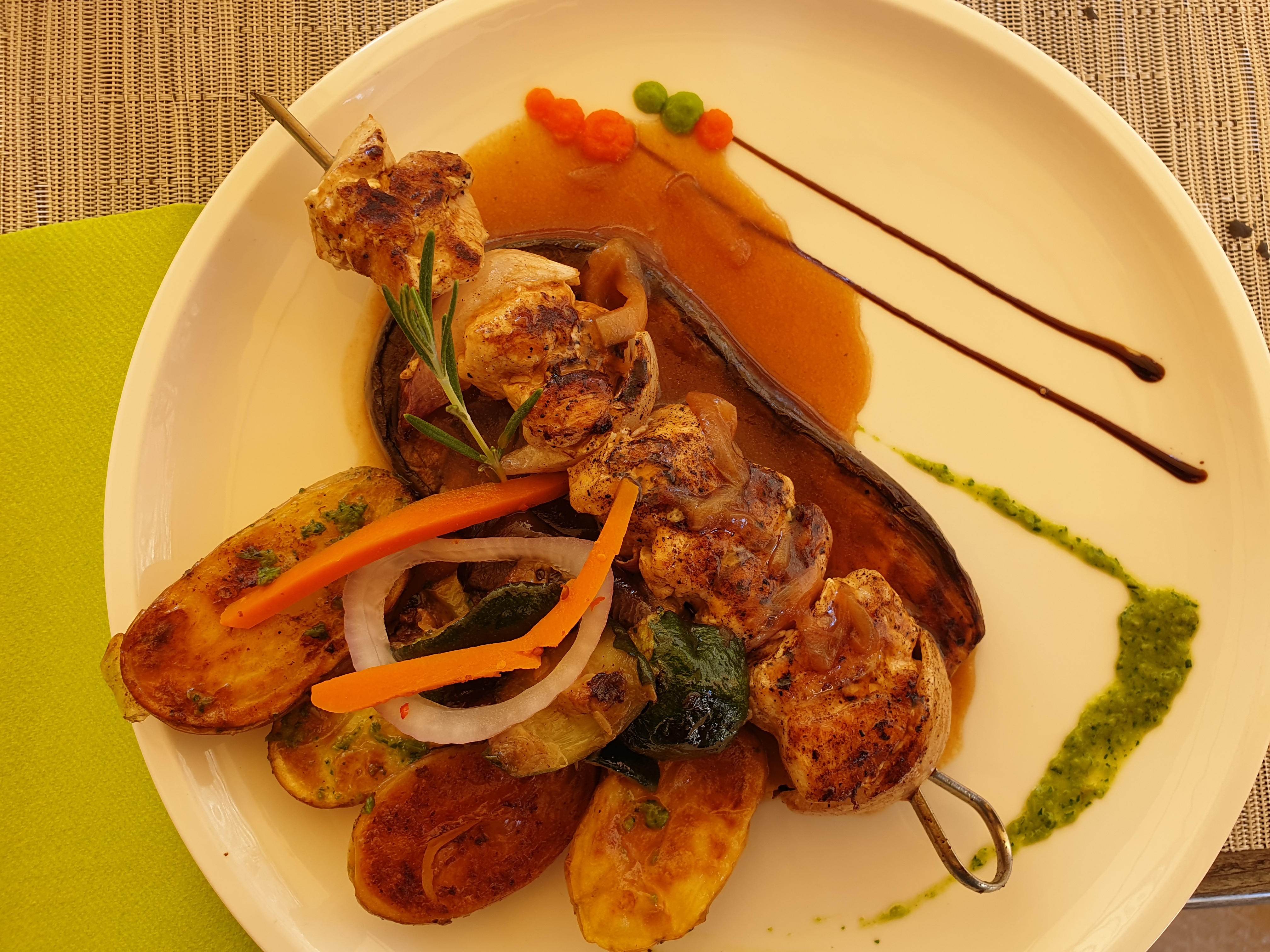 Les plats sont aussi beaux que bons. Nous avons été bien servis et la serveuse a été trés agréable. Une chose est a déplorer malheureusement et a un peu gachénotre soirée. Nous étions dans un joli patio tres bien décoré mais il donne sur la route. Malgré l heure tardive, des scotters, des motos tres bruyants qui s amusent a passer et repasser à fond devant le restaurant... Je pense que ce desagrément n est pas du ressort du restaurant. Mais c est pénible toute la soirée et fatigant. Nous y avions déjà été mais a l intérieur, nickel.... c est dommage.