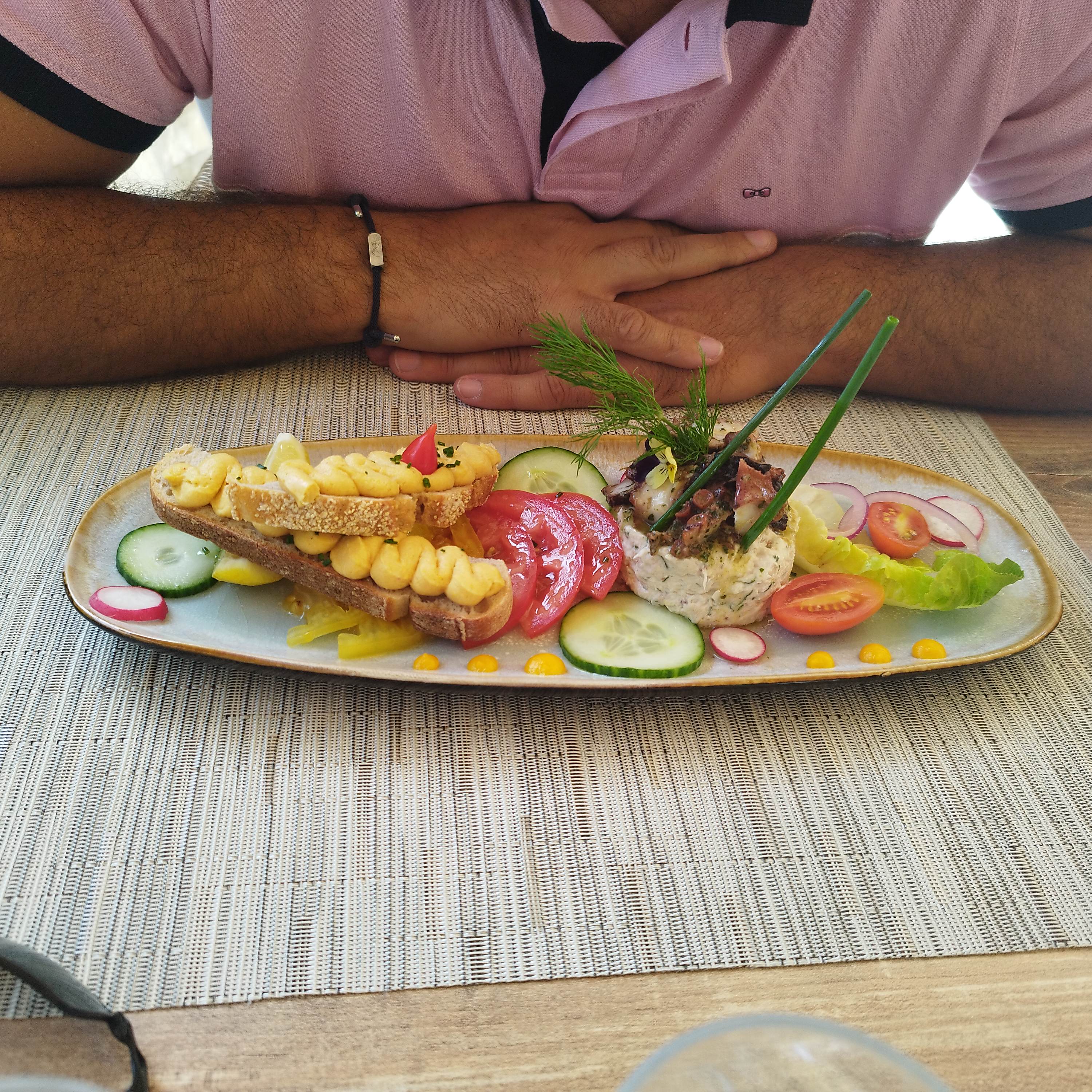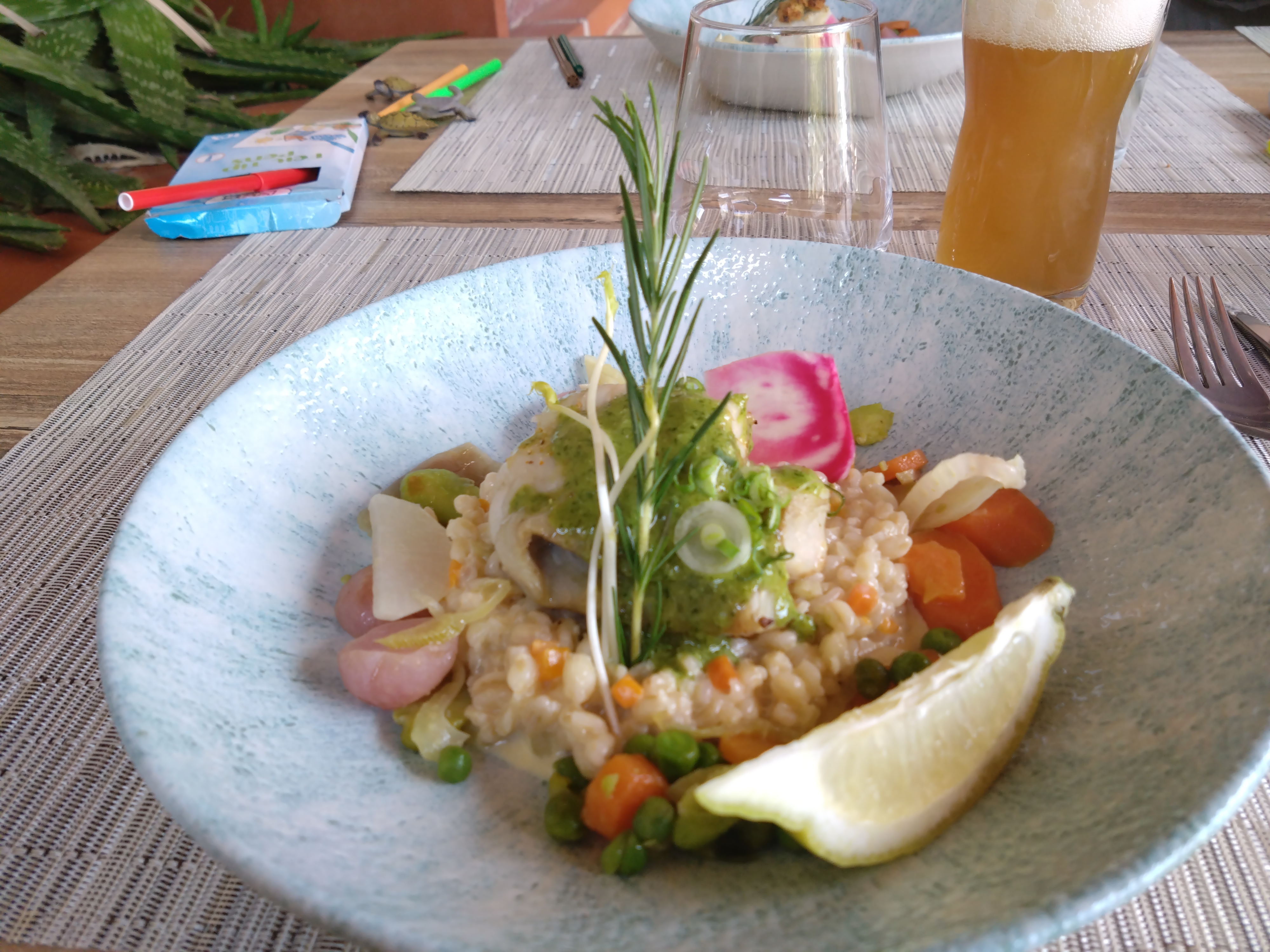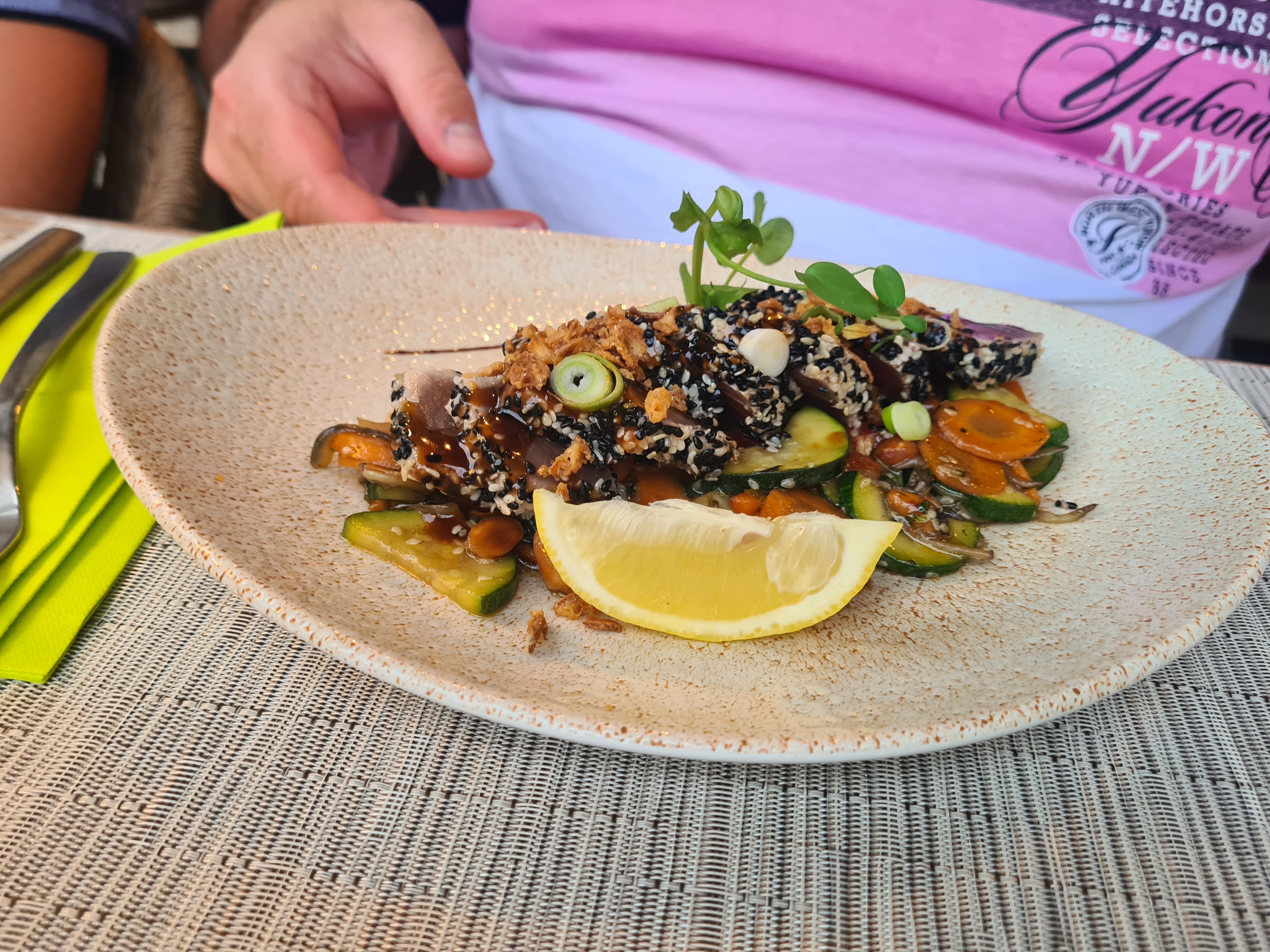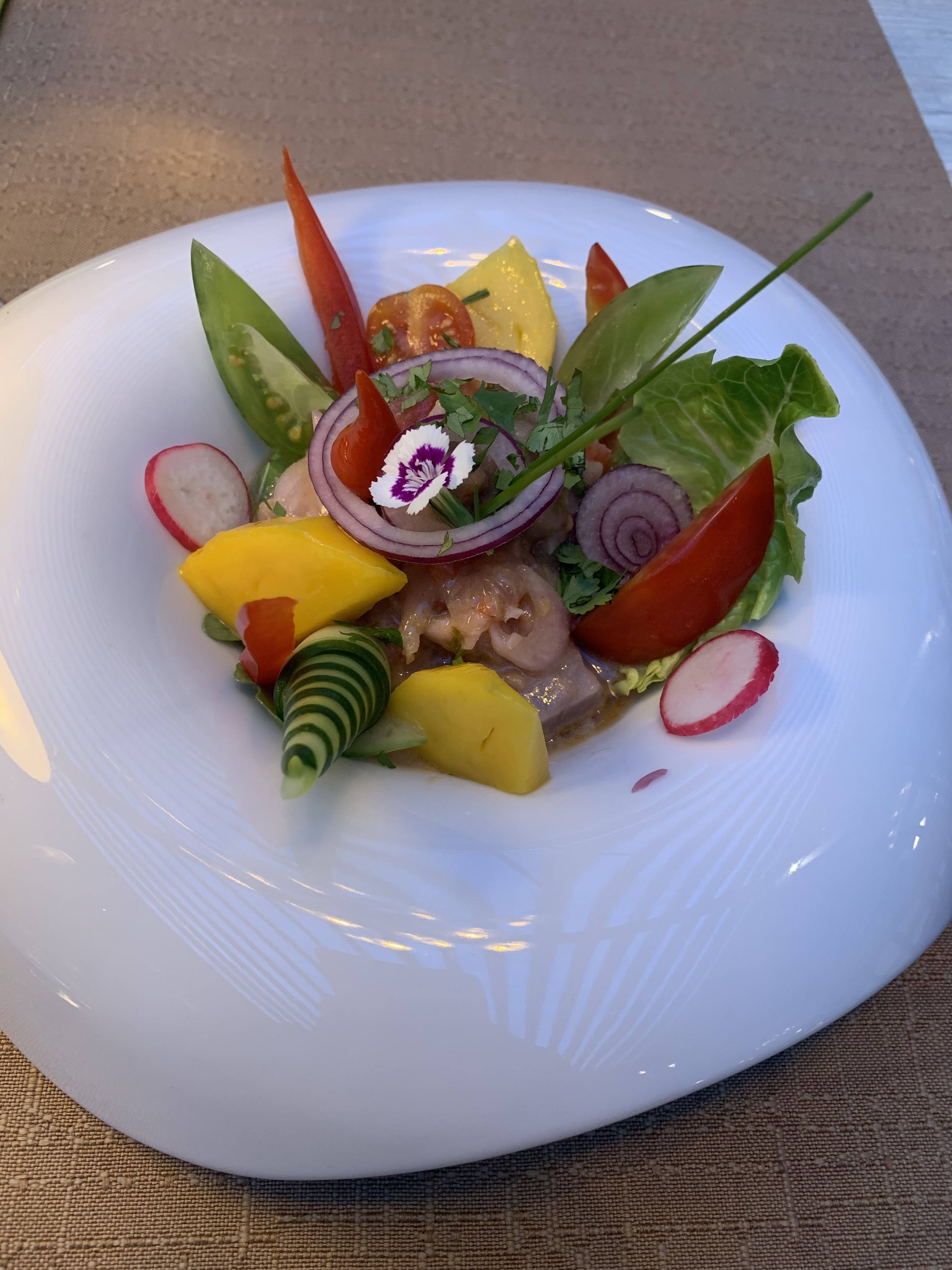 Les plats sont aussi beaux que bons. Nous avons été bien servis et la serveuse a été trés agréable. Une chose est a déplorer malheureusement et a un peu gachénotre soirée. Nous étions dans un joli patio tres bien décoré mais il donne sur la route. Malgré l heure tardive, des scotters, des motos tres bruyants qui s amusent a passer et repasser à fond devant le restaurant... Je pense que ce desagrément n est pas du ressort du restaurant. Mais c est pénible toute la soirée et fatigant. Nous y avions déjà été mais a l intérieur, nickel.... c est dommage.